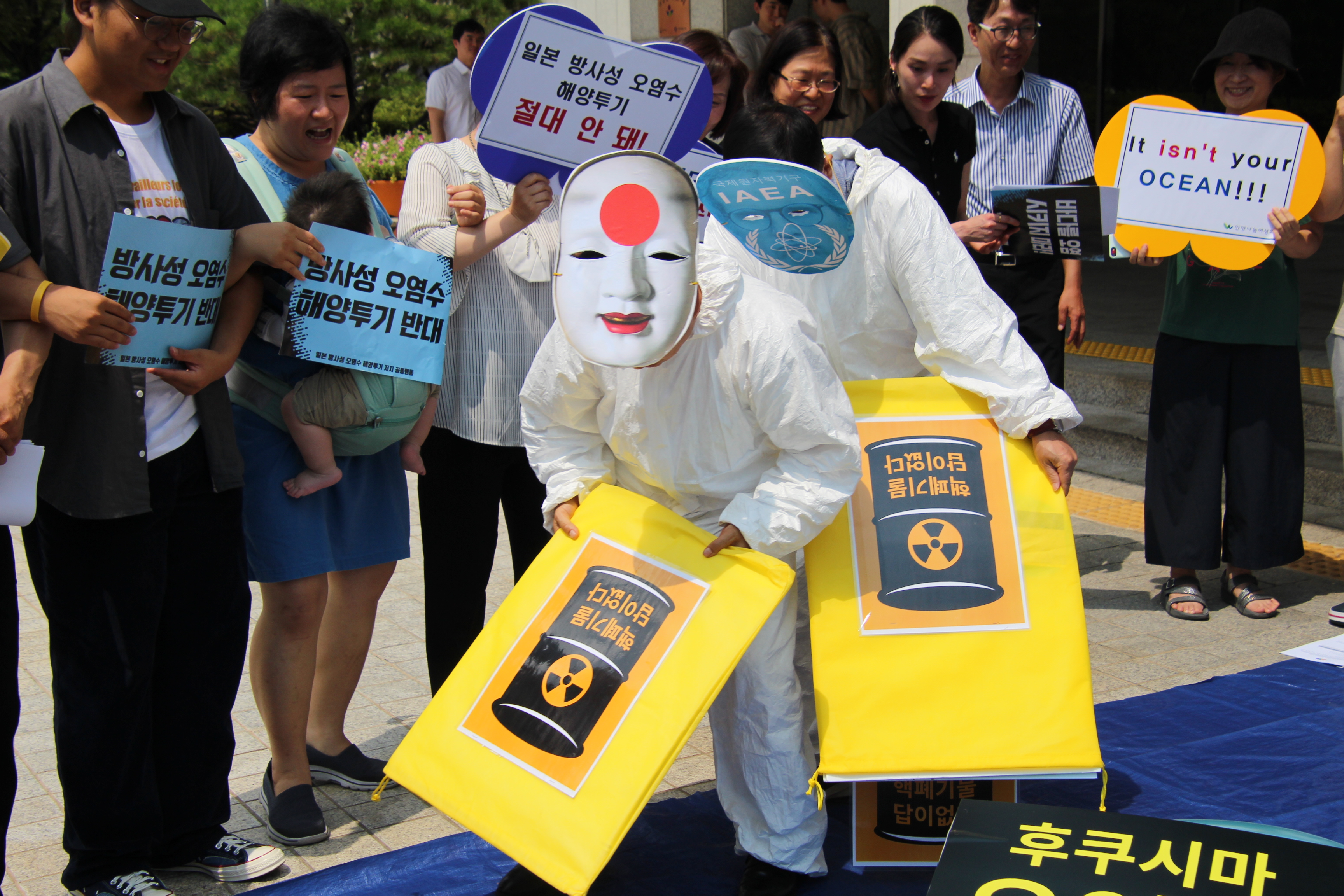 이어 오염수 해양 투기의 위험성을 알리는 퍼포먼스가 펼쳐졌다. 파란색 천막천이 바닥에 깔리자 돌고래, 해녀, 펭귄 인형이 놓였고 그 위로 흰색 방진복을 입은 사람들이 나타났다. 이들은 노란색 드럼통에 담긴 핵폐기물을 바다에 쏟아붓는 듯한 장면을 연출했고 시민들이 연이어 구호를 외쳤다.