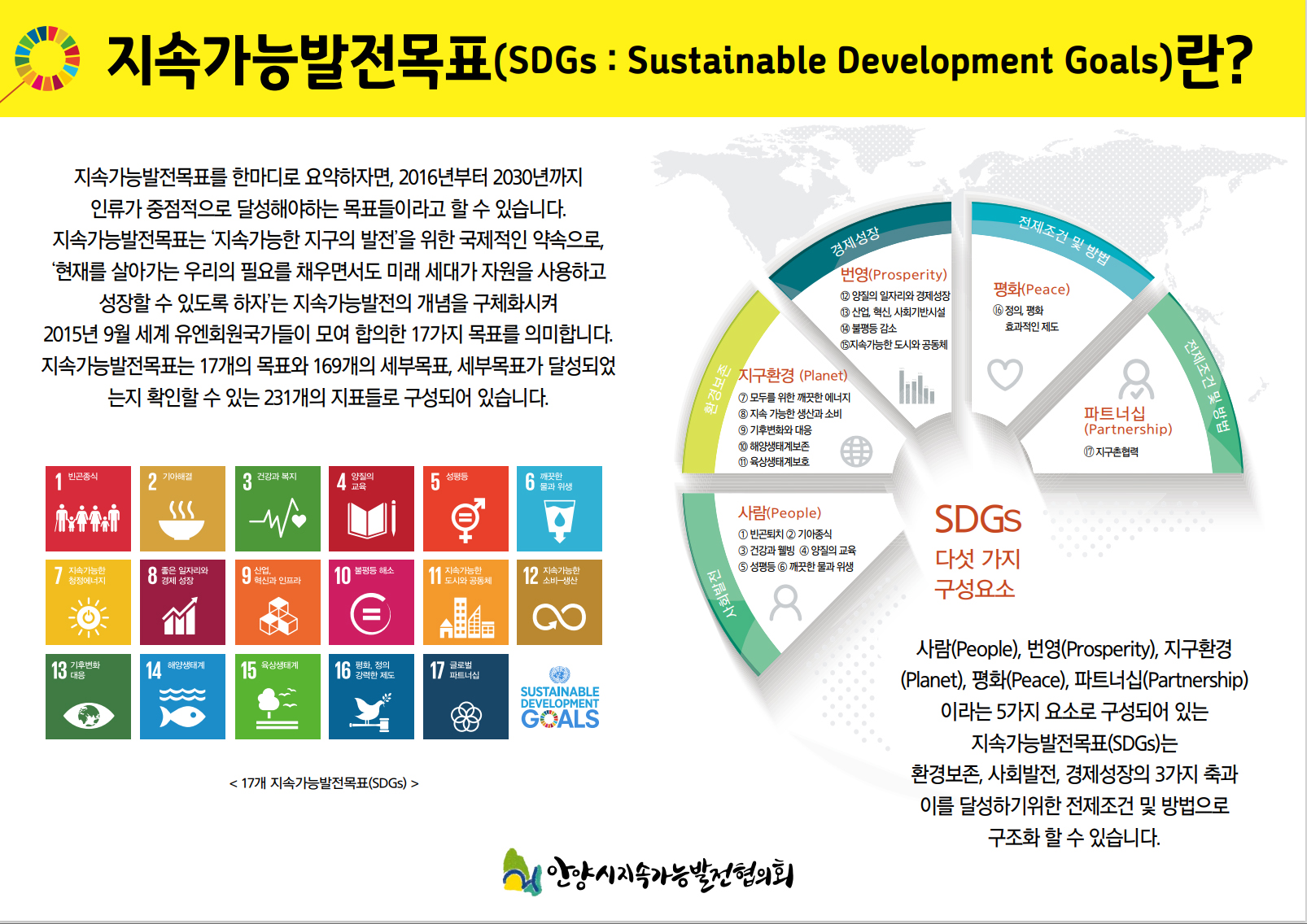 Sustainable Development Goals 은 1)빈곤종식 2)기아해결 3)건강과 복지 4)양질의 교육 5)성 평등 6)깨끗한 물과 위생 7)지속가능한 청정에너지 8)좋은 일자리와 경제성장 9)산업혁신과 인프라 10)불평등 해소 11)지속가능한 도시와 공동체 12)지속가능한 소비와 생산 13)기후변화대응 14)해양생태계 15)육상생태계 16)평화, 정의, 강력한 제도 17)글로벌 파트너십이다.