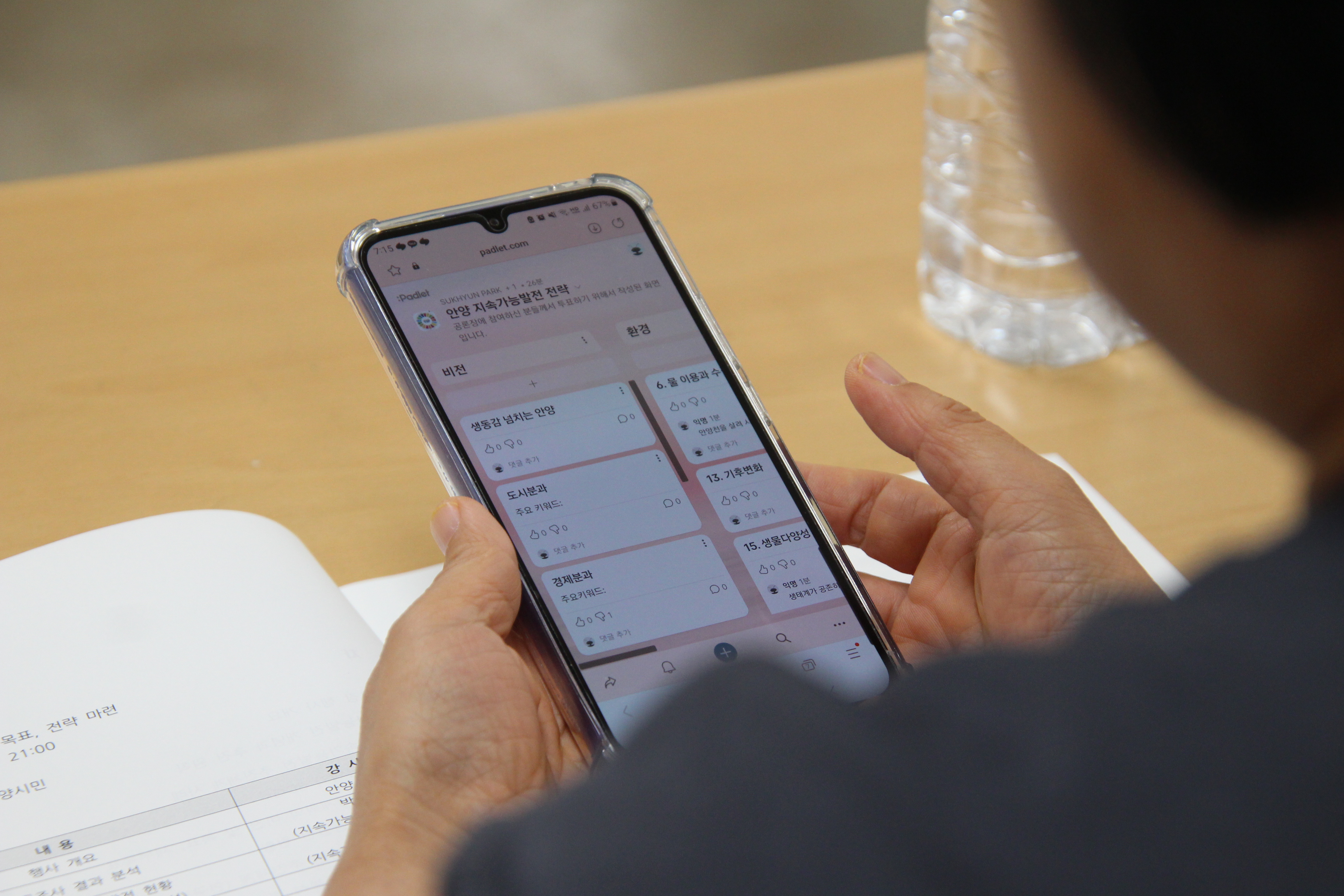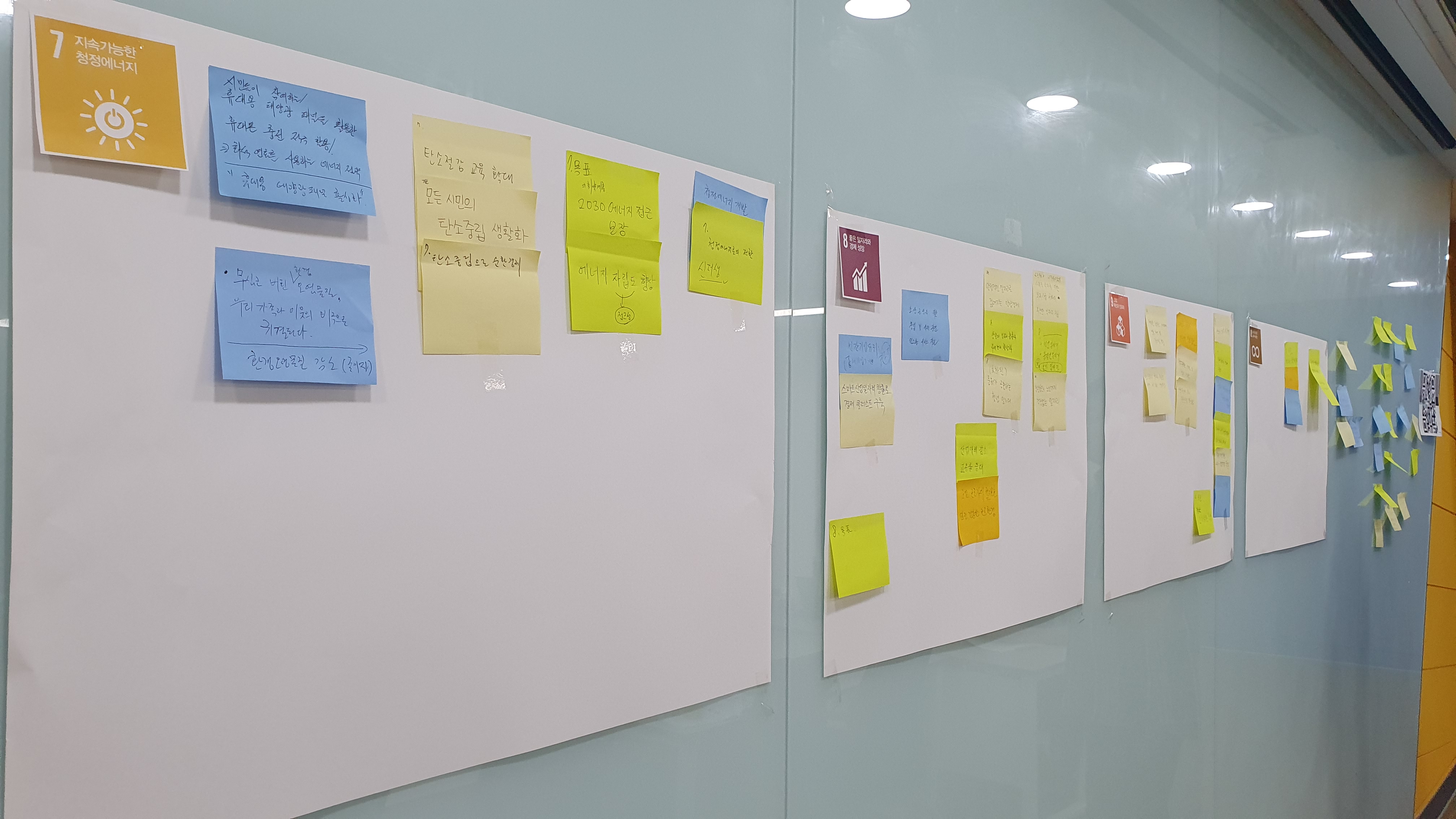 이어 공론장 참가자들이 SDGs 17개 목표 과제를 4개분야인 사회(SDGs 1.3.4.5.10). 경제(SDGs 7.8.9.12). 환경(SDGs 6.13.14.15) 도시공동체( (SDGs 2.11.15.17)로 나뉘어 안양시 지속가능발젼 기본전략 수립을 위한 주제별 논의를 했다.