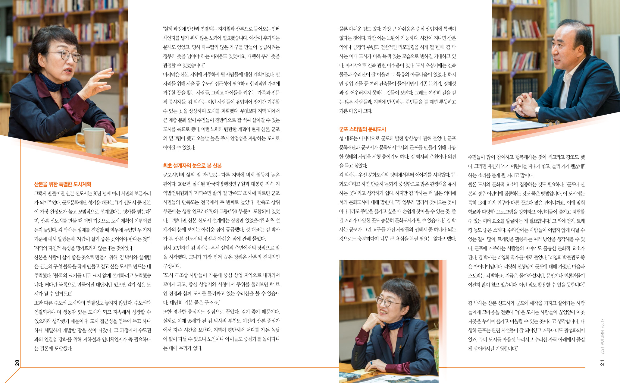 군포시민의 삶의 질 만족도는 다른 지역에 비해 월등히 높은 편이다. 2015년 조사한 한국지방행정연구원과 대통령 직속 지역발전위원회의 ‘지역주민 삶의 질 만족도’ 조사에 따르면 군포시민들의 만족도는 전국에서 두 번째로 높았다. 만족도 상위 부문에는 생활 인프라(2위)와 교통(5위) 부문이 포함되어 있었다. 그렇다면 산본 신도시 설계에는 장점만 있었을까? 최초 설계자의 눈에 보이는 아쉬운 점이 궁금했다. 성 대표는 김 박사가 본 산본 신도시의 장점과 아쉬운 점에 관해 물었다.