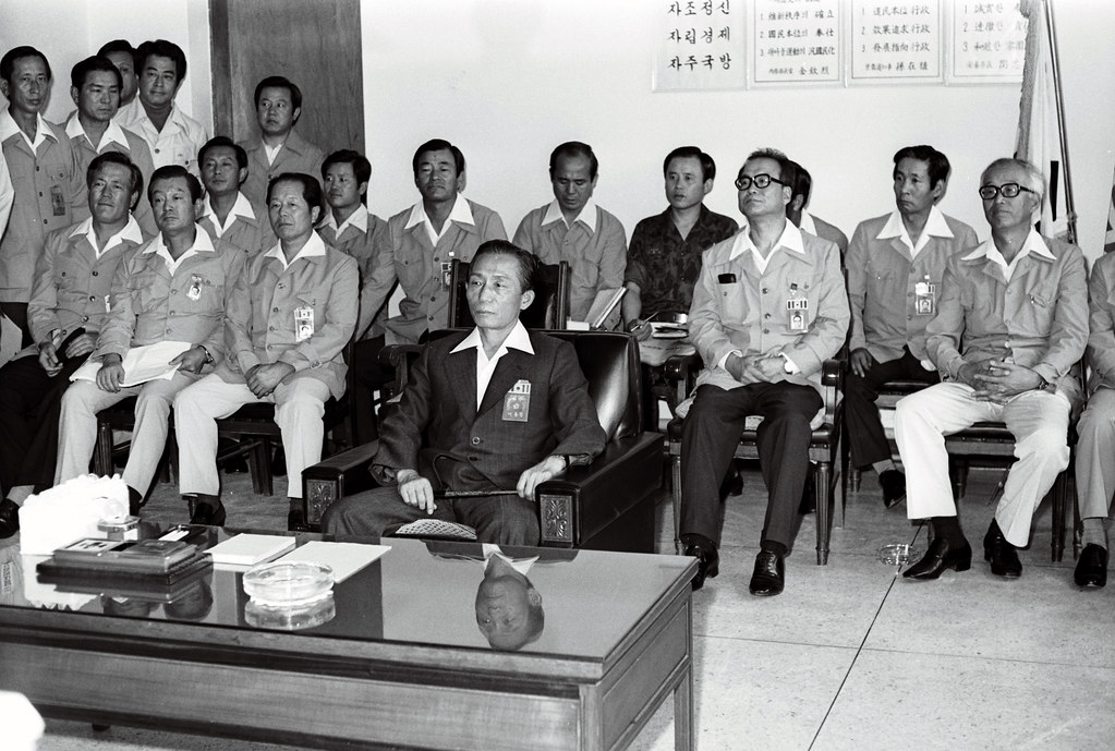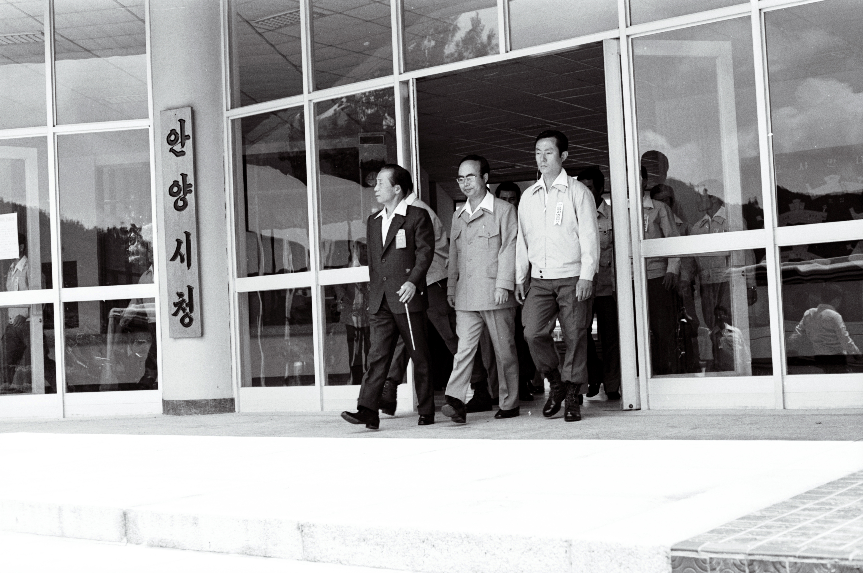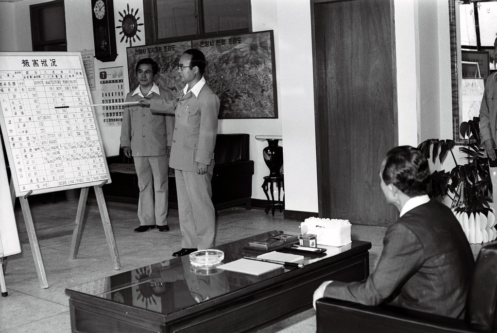 1977년 안양대홍수 당시 사진으로 경기도청 자료실에서 발견한 현장 기록물이다. 안양 대홍수(1977. 7.8-9) 당시 비가 그치고 다음날인 7월10일 박정희 대통령이 안양시를 방문했다. 당시 박통은 안양시청(현만안구청)을 찾아 2층 시장실(현 구청장실)에서 수해 피해 보고를 받았다. 박통은 이후 복구작업이 본격적으로 시작된 이후인 7월20일 한차례 더 안양시청을 찾아 브리핑을 받았다. 하지만 두차례의 안양 방문 자료중 피해 현장을 직접 방문하거나 수재민을 찾아 위로를 하는 기록은 찾울수 없었다. 혹 국가기록원에는 있지 않을까 싶다.