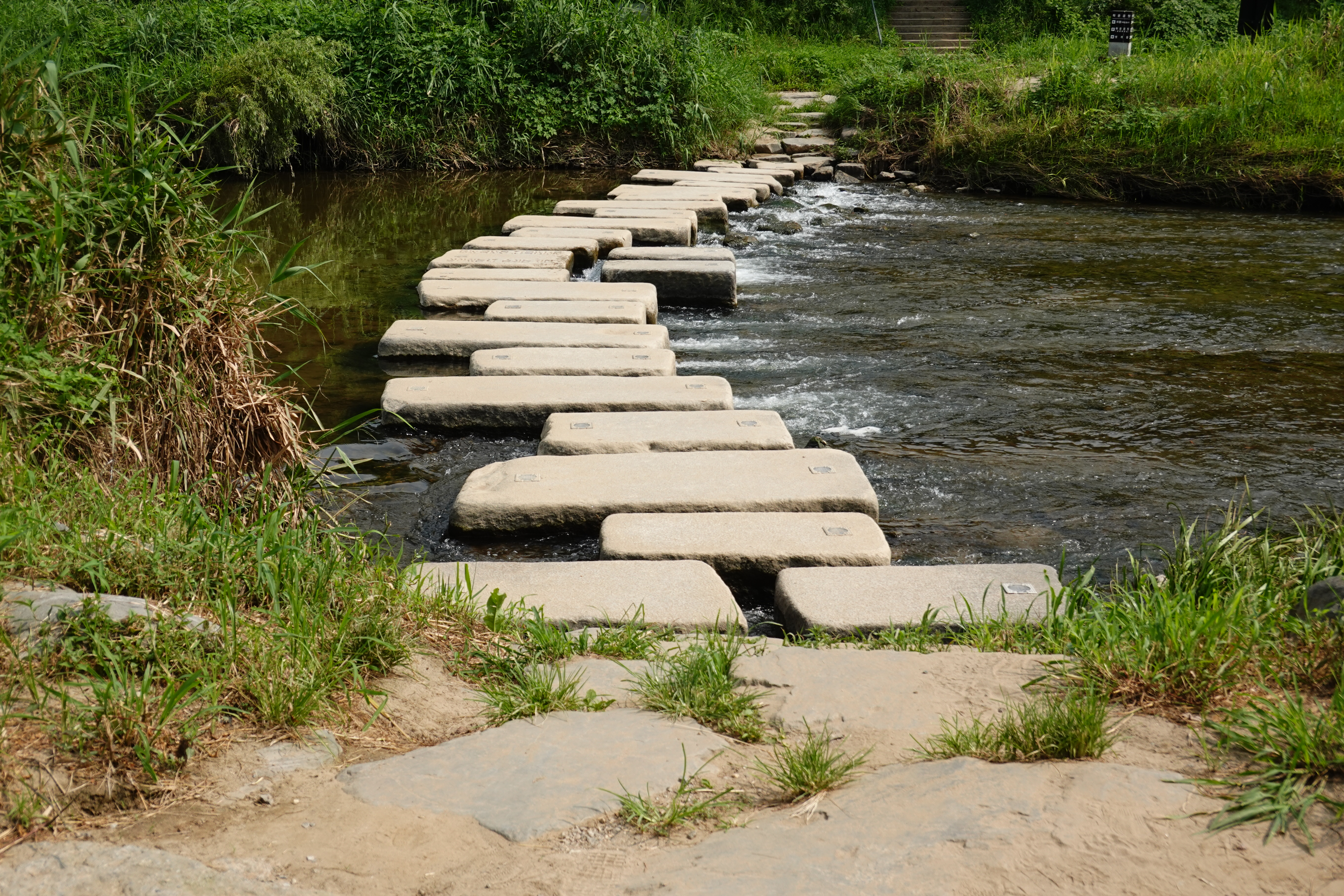 2023.07.30/ #도시기록 #제인구달 #학의천 #안양 #방문지 #표지석 #기념/ 침팬지 연구의 효시이자 세계적 환경운동가인 제인 구달 박사가 학의천을 방문했을때 저곳에서 물고기를 방사했던 돌다리이다.