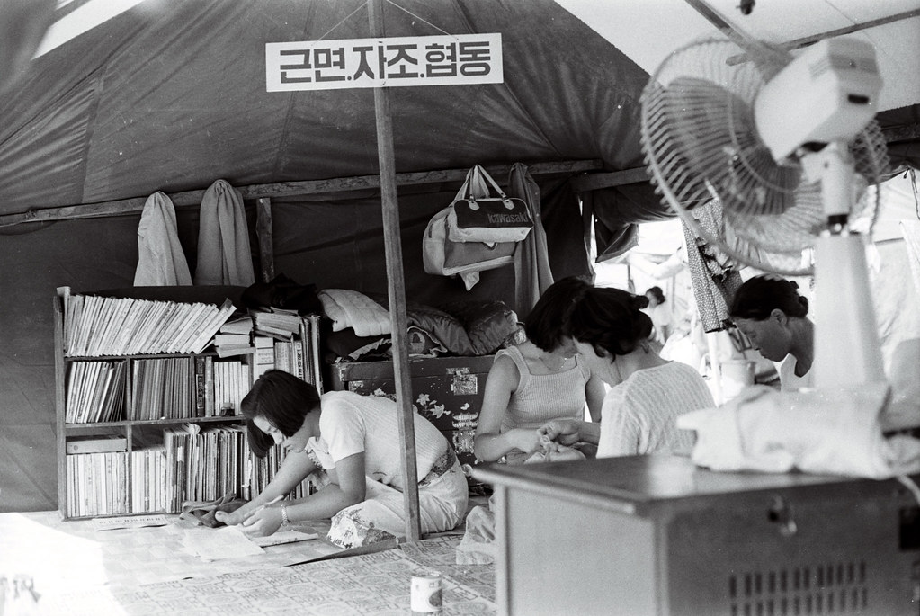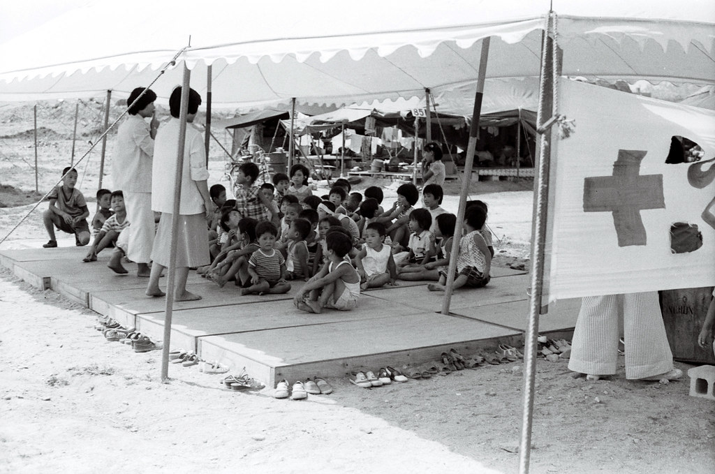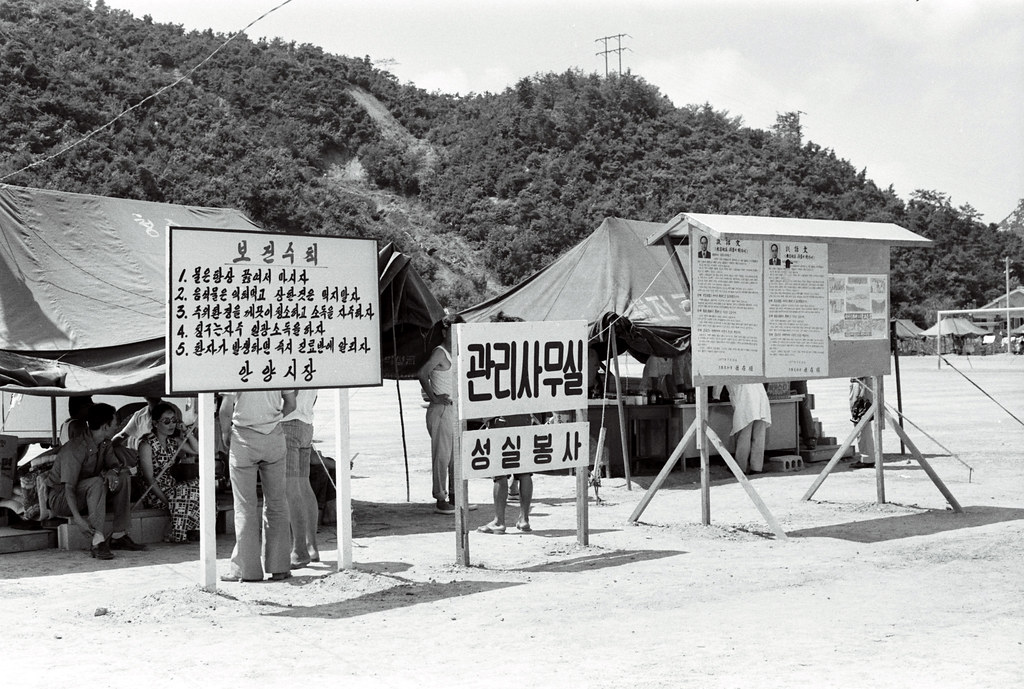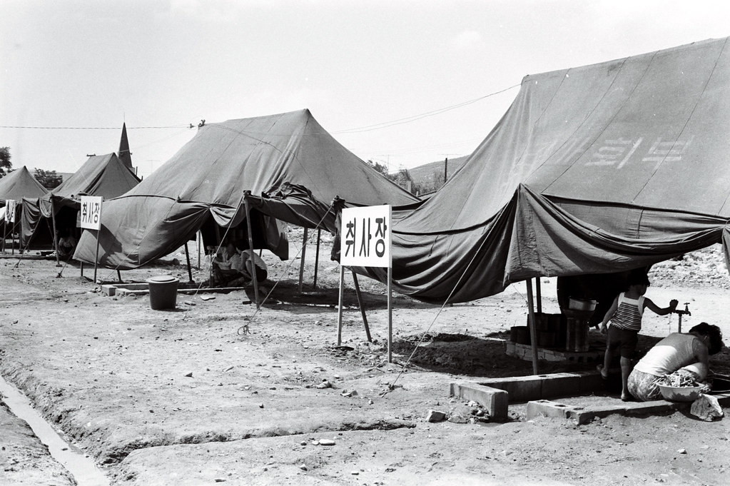2023.07.30/ #아카이브 #옛사진 #기록 #기억 #안양대홍수 #77수해/ 1977년 안양대홍수 당시 사진으로 경기도청 자료실에서 발견한 현장 기록물이다. 1977년 7월 8-9일 수해 발생이후 25일이 지난 시점인 8월1일 촬영한 안양 석수동 공설운동장(현 럭키아파트)에 마련된 수재민 보호소의 모습으로 당시 100여동이 넘는 천막이 설치됐다. 이곳에는 수해 직후 학교 교실 등으로 임시 피난했던 수재민들이 집단으로 거주하며 새 보금자리에 정착할때 까지 구호를 받았다.