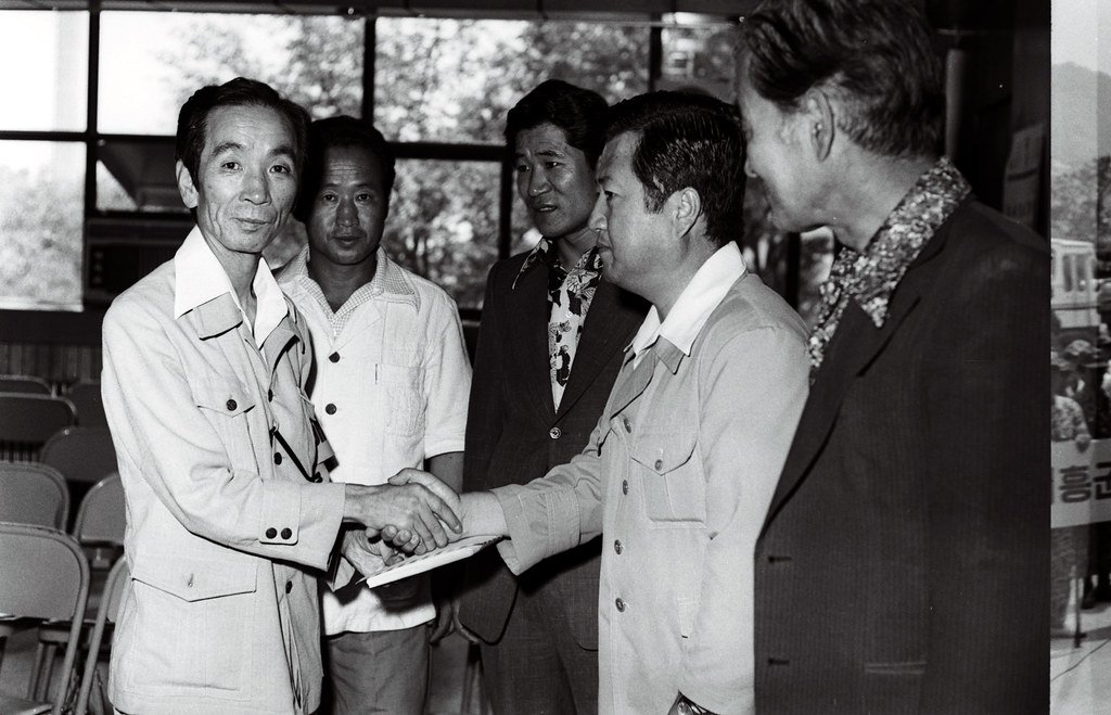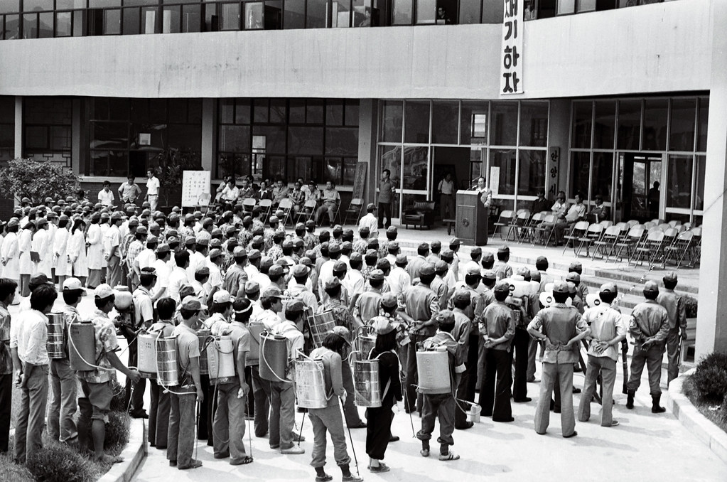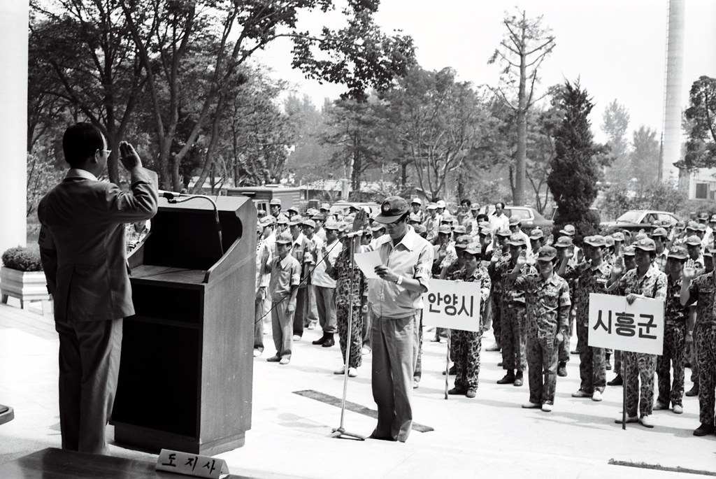 2023.07.30/ #아카이브 #옛사진 #기록 #기억 #안양대홍수 #77수해/ 1977년 안양대홍수 당시 사진으로 경기도청 자료실에서 발견한 현장 기록물이다 1977년 7월14일 안양시청(현 만안구청) 마당에서 경기도수해대책지휘본부 현판식과 함께 안양시와 시흥군 수해복구반 발대식이 열리는 모습이다.