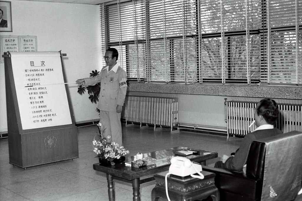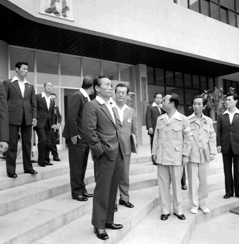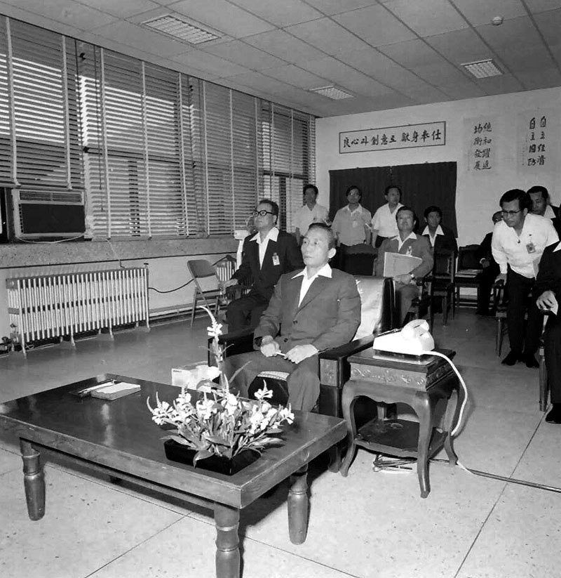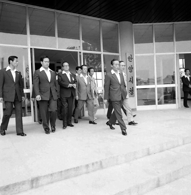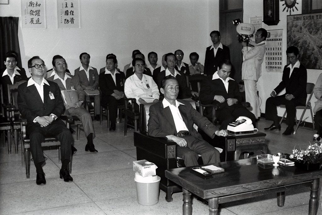 2023.07.30/ #아카이브 #옛사진 #기록 #기억 #안양대홍수 #77수해/ 1977년 안양대홍수 당시 사진으로 경기도청 자료실에서 발견한 현장 기록물이다. 1977뇬 7월20일 안양시청(현 만안구청)을 두번째 방문한 박정희 대통령 모습이다. 박통은 안양 대홍수 당시 비가 그치고 다음날인 7월10일 안양시를 처음 방문한데 이어 복구작업이 한창일 무렵인 7월20일 두번째로 안양시청을 방문했다. 당시 박통은 안양시청 2층 시장실(현 구청정실)에서 수해 복구 현황 보고를 받았다. 당시 사진에 기록된 수행원 배석자 인물을 보면 박통 뒷편 오른편에 차지철 경호실장의 모습이 보인다.