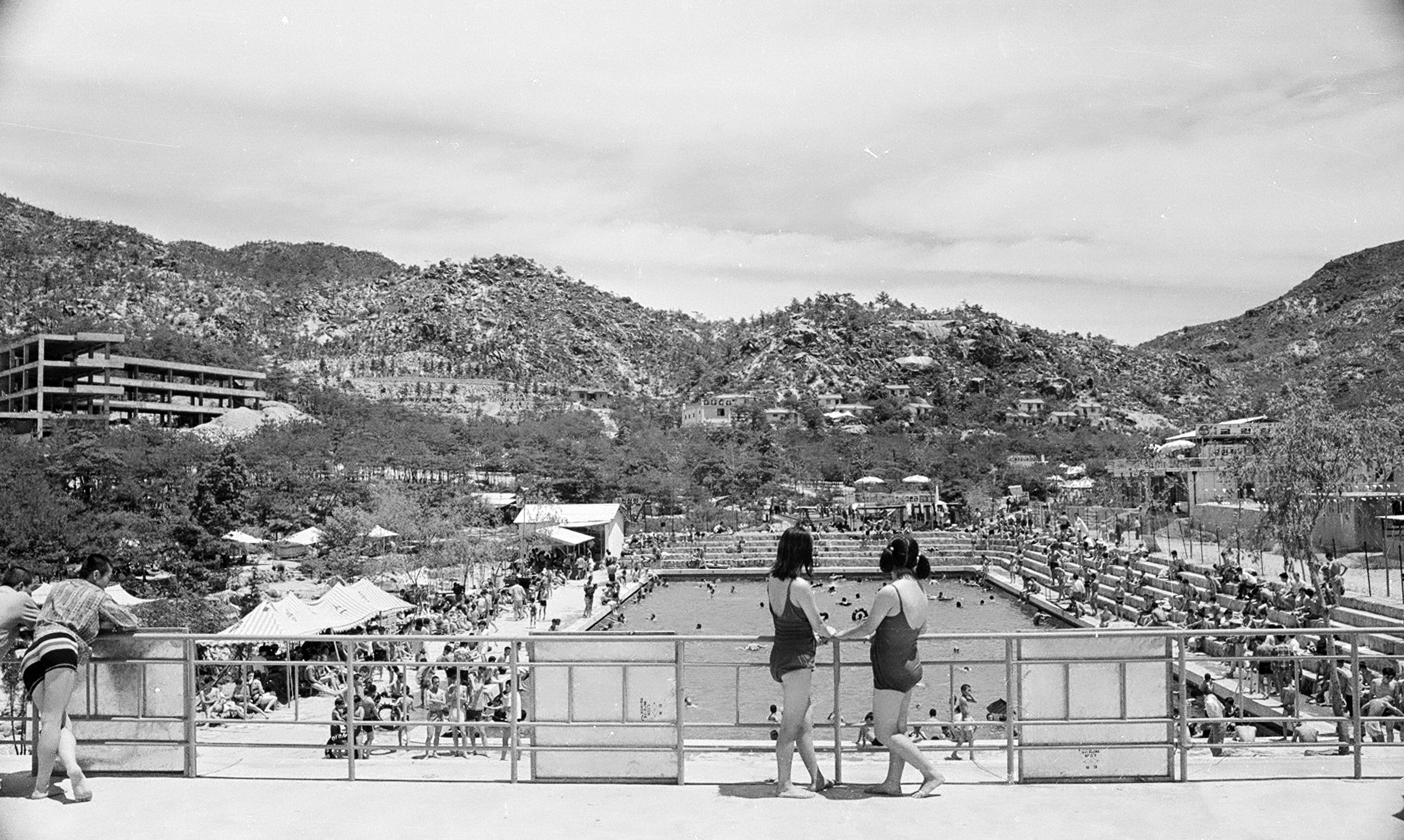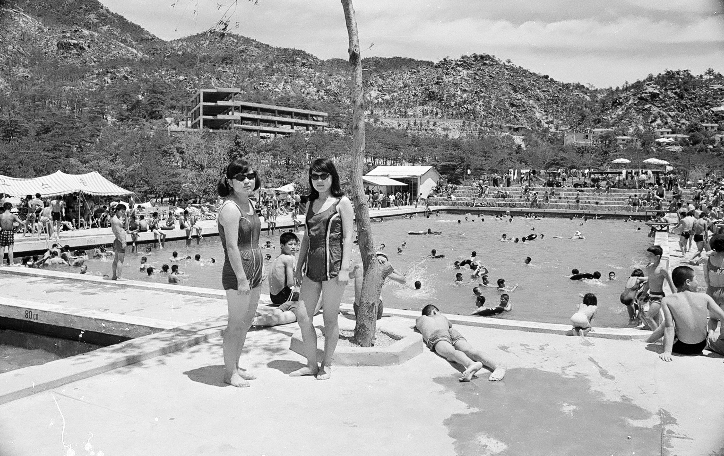 사진속 수영장은 맘모수영장으로 어른용과 어린이용 2개의 풀장이 있었고 어린이를 위한 놀이기구들이 설치돼 있었는데 위치는 현재의 벽천광장앞에 있었다.