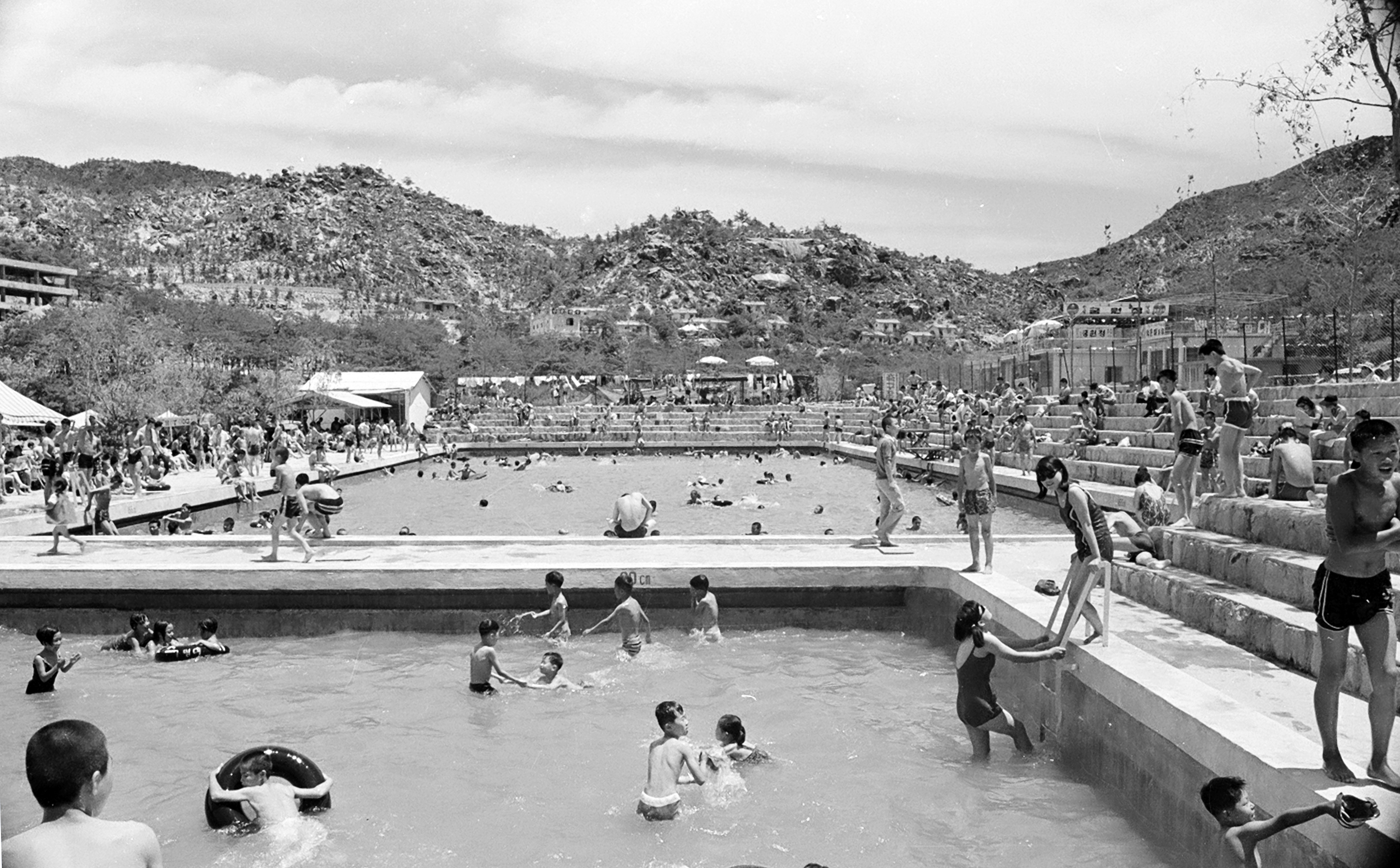사진속 수영장은 맘모수영장으로 어른용과 어린이용 2개의 풀장이 있었고 어린이를 위한 놀이기구들이 설치돼 있었는데 위치는 현재의 벽천광장앞에 있었다.