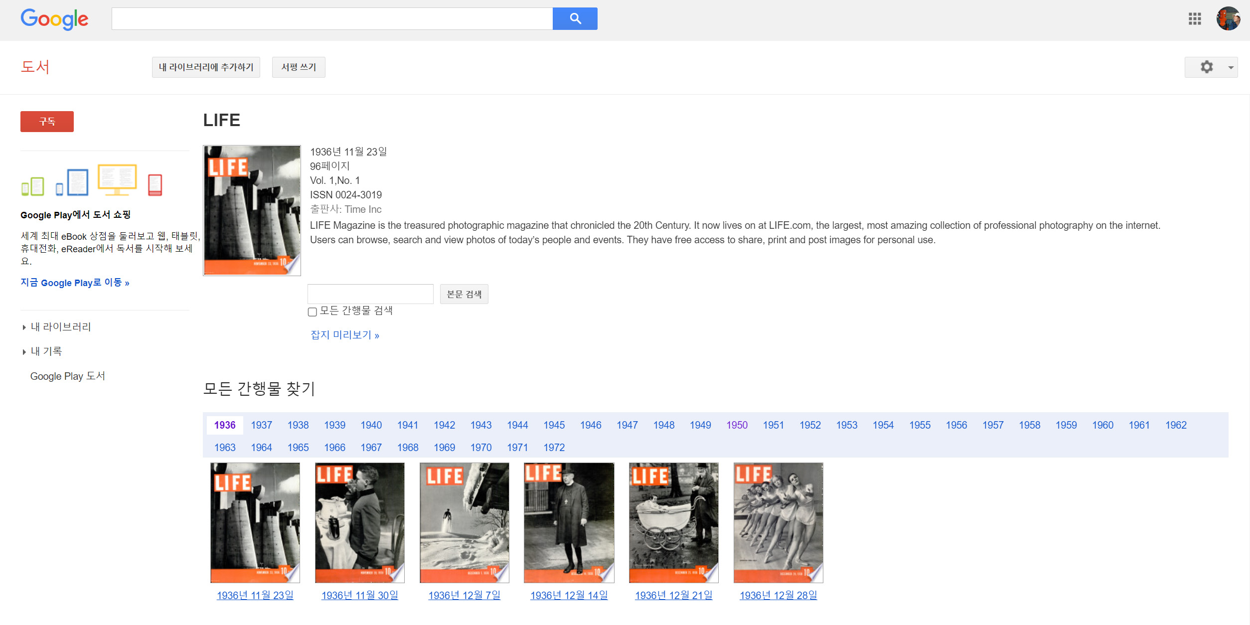 지난 잡지를 통해 오래된 기록도 년도별로 찾아볼수 있는데 구글 도서에서 LIFE 잡지를 검색하면 무료로 독서가 가능하다