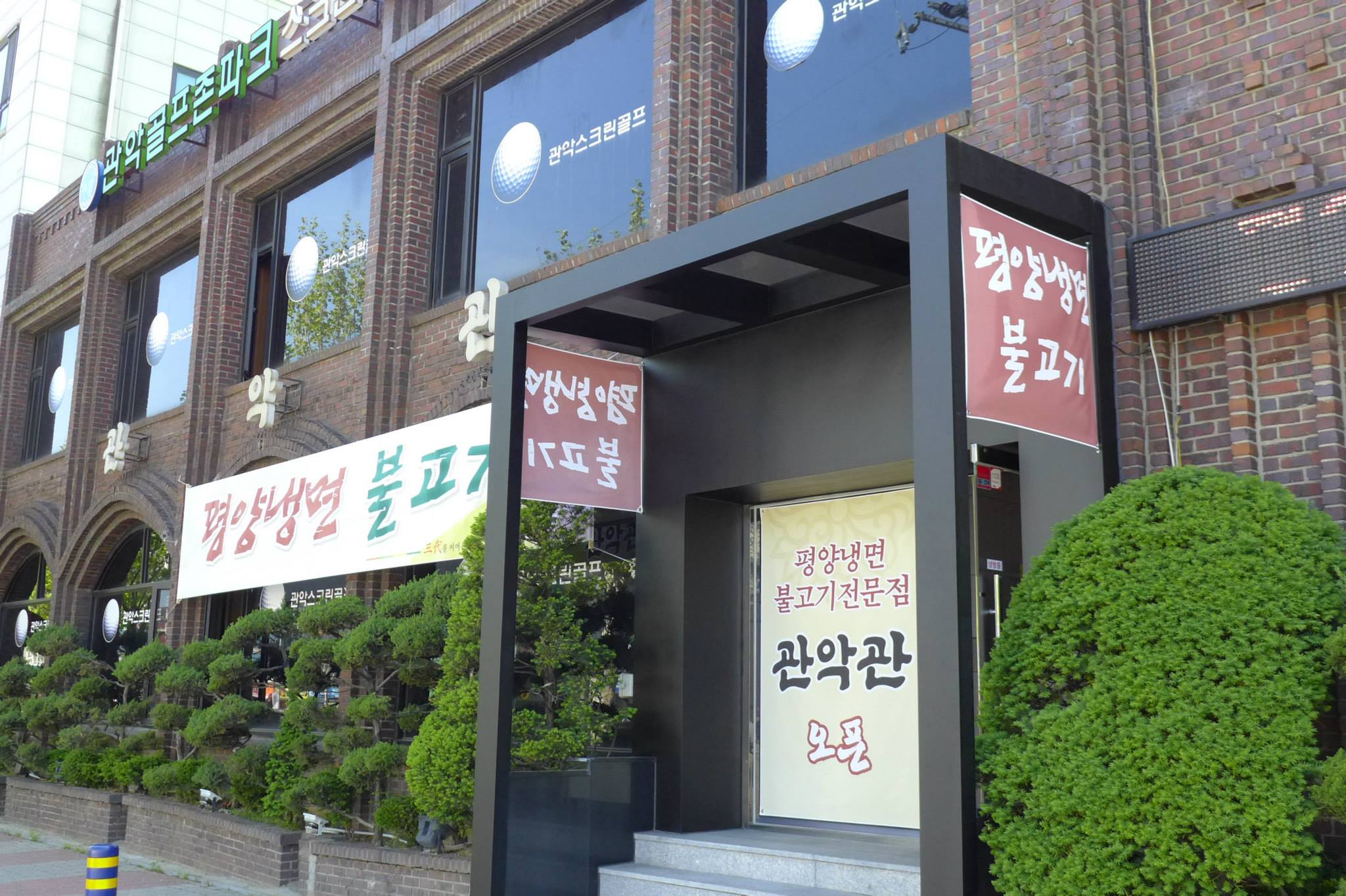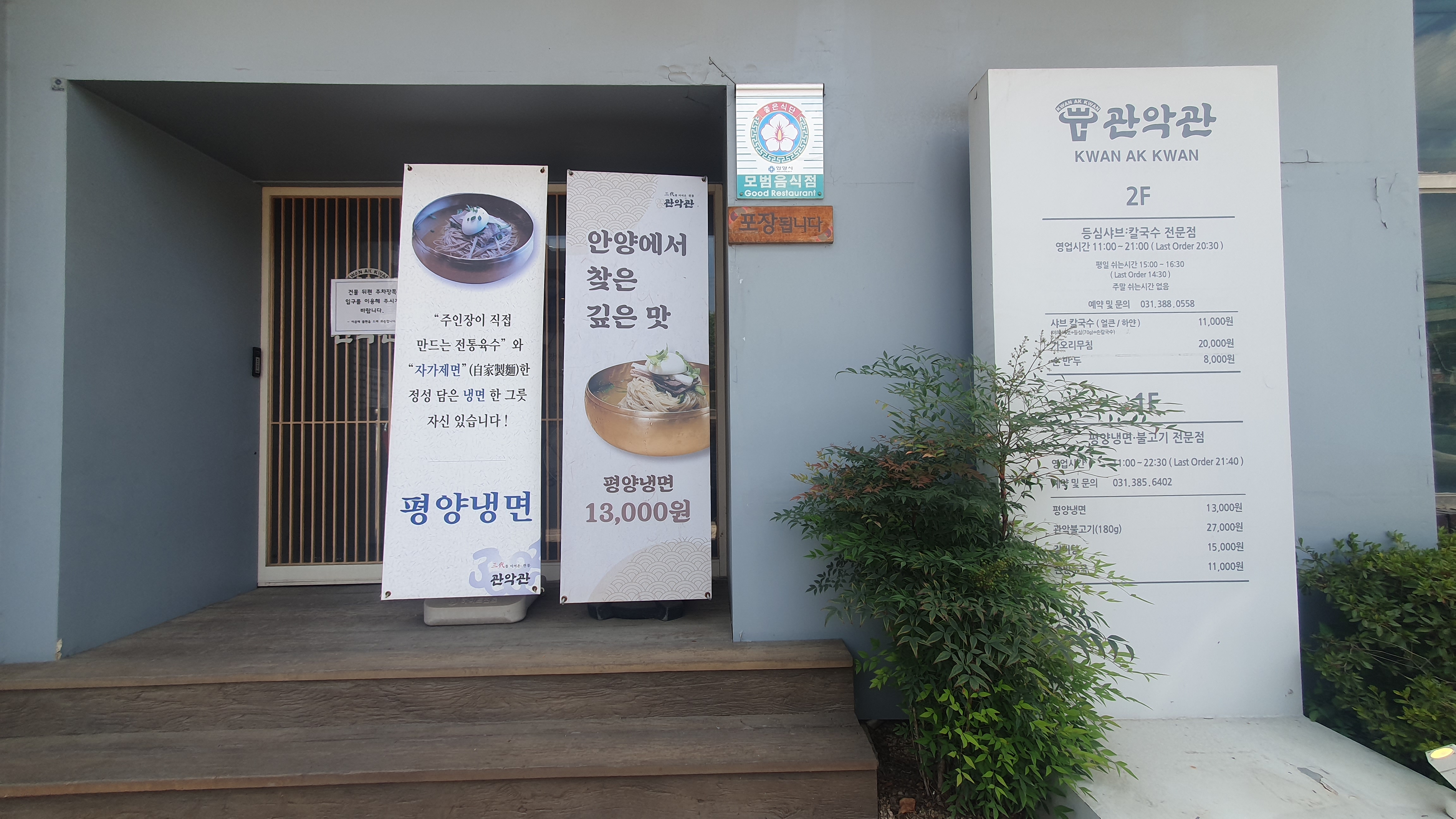 냉면 미식가들이 아주 반가워할 소식입니다. 안양 비산동운동장 앞에 3대을 이어오면서 제대로 하는 평양식냉면(메밀냉면)을 맛보게 하던 식당이 있다가 어느날 업종을 실내골프장으로 바꾸면서 문을 닫았는데 냉면을 좋아하는 이들의 성화(?)로 혼자만 만들어먹던 주인장이 최근 자그마한 공간으로 다시 문을 열었답니다. 냉면 좋아하시는 분들은 이 정도 설명하면 대충 어느 집인지 아실 듯 한데 평양냉면을 다시 뽑기 시작했다는 정보를 입수하고 오늘(2015.5.5) 맛보러 달려갔지요. 아직 간판도, 메뉴판도 없었는데 벌써 입소문을 듣고 찾아오는 미식가들의 발걸음이 줄을 잇네요. 메뉴는 냉면(물/비빔 8,000원), 불고기(한우/ 17,000원), 만두(7,000원)으로 아주 단촐합니다. 가끔 뵙던 여사장께서 "간판도 아직 못 걸었는데 어떻게 알고 왔냐"교 반갑게 맞아주네요. 귀뜸하면 영업을 시작한지 이제 5일 됐는데 일할 사람들과 손을 맞추는 준비단계라고 하네요. 여사장님께 "제가 2년전인가 '평양냉면 다시 좀 먹게 해주세요'라고 했었는데 진짜 소원 들어주셨네요"라고 함께 웃었지요. 먼저 물냉면을 쥬뮨하자 주방에서 바로 반죽한 메밀로 면을 뽑아 삷고 찬물에 서너번을 씻어 놋쇠그릇에 담고는 고명을 얹습니다. 고명으로 계란, 배, .소금물에 꼭 짠 오이, 무채. 편육 등이 올라가 있네요. 먼저 그룻을 들어 육수를 들이키자 조금은 진한색깔의 맛이 깔끔, 시원, 맛깔납니다. 여느 갈빗집에서 주는 달착지근한 냉면하고는 차원이 다른 오묘한 맛이지요. 역시 기다렸던 맛으로 올여름 뻔질나게 드나들것 같은 느낌이네요. 메밀 함량이 높아 면이 부드럽고 잘 끊어 집니다. 물론 가위도 없지요. 사실 일반 냉면 면발도 가위를 대면 안된다고 하지요. 여 사장님 오빠께서 메밀 함량을 7대 3으로 맞추었다고 하네요. 여 사장 왈 "전에는 메밀을 더 넣었는데 시대의 흐름에 맞추다 보니 메밀 함량을 다소 줄였어요"라고 합니다. 사실 이집의 냉면 역사는 3대째 53년의 연륜을 지니고 있으니 무척이나 오래됐지요. 그 흔적을 들여다보면 1968년에 서울 종로에서 평안면옥이란 간판을 내걸고 영업을 시작해 1972년 5월 10일에는 남포면옥으로 확장 이전개업하면서 인기를 끌었지요. 당시 사진을 보면 식당 안에 묻힌 동치미독이 50여개가 쭈욱 있을 정도 였지요. 하지만 주인장은 어느날 남포면옥을 접고는 안양으로 내려옵니다. 비산동 운동장앞에 3층짜리 멋진 건물을 짓고는 관악관이란 새 간판을 내걸지요. 이곳에서는 대를 이은 주인장인 고기와 평양냉면을 팔았는데 2010년 6월 어느날인가 식당을 접고는 스크린골프장으로 업종을 바꾸지요. 이 바람에 서울에서도 냉면을 맛보러 내려오던 식객들이 허탕을 치고는 "저 혼자 맛있는 냉면 먹는다"고 괘심하다고 할 정도였지요. 관악관은 안양 비산동에서 칼국수집으로 명성을 날리던 대물림칼국수 주인장과 형제지간이로 알고 있는데 음식으로 쌍두마차라 할 수 있었지요. 그래도 음식에 대한 미련은 못 버린 탓일까. 관악관 주인장은 2012년 11월에 골프장 건물 한 귀퉁이에 칼국수와 닭곰탕과 만두 등 간단한 식사를 내놓지요. 골프장을 찾는 고객들을 위해 문을 열었는데 가급적 조미료를 쓰지 않는 맛집으로 입소문 나면서 정작 일반 손님들이 많이 찾았지요. 당시 주인장에게 왜 냉면을 하지 않느냐고 물었더니 "주위의 성화(?)로 냉면을 다시 할까 할 생각도 했었었는데, 냉면은 면발을 뽑는 것부터 육수를 내는 것까지 너무나 손이 많이가 엄두를 내지 못해 할 수 없다"고 하기도 했지요. 냉면을 맛있게 먹고 계산하려 하니 주인장께서 "오늘 처음 오셨으니 그냥 가시고 자주 오세요" 와우. 행복한 날입니다^^