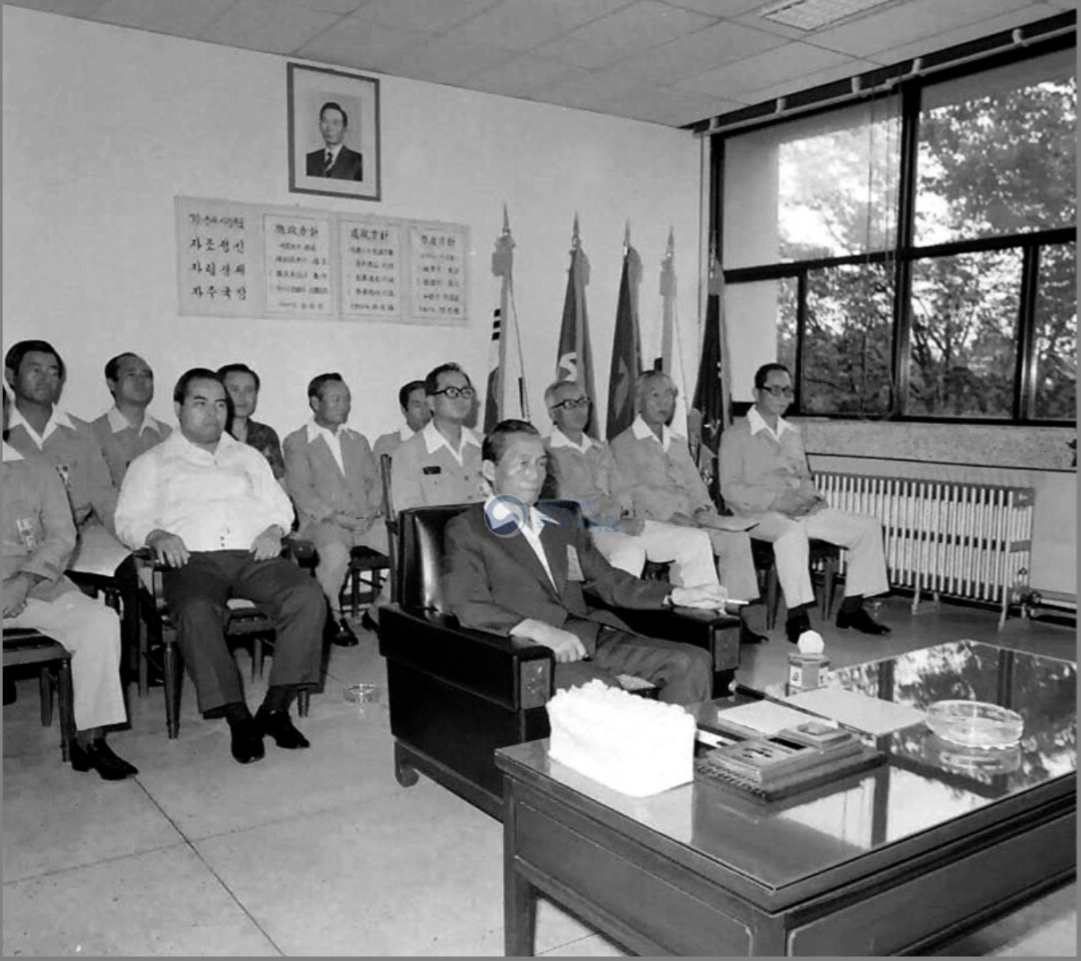 1977년 안양대홍수 당시 사진으로 국가기록원 웹사이트에서 발견한 기록물이다. 안양 대홍수(1977.7.8-9) 당시 비가 그치고 다음날인 7월10일 박정희 대통령이 안양시를 방문했다. 당시 박통은 안양시청(현만안구청)을 찾아 2층 시장실(현 구청정실)에서 수해 피해 보고를 받았다. 박통은 이후 복구작업이 본격적으로 시작된 이후인 7월20일 한차례 더 안양시청을 찾아 브리핑을 받았다.