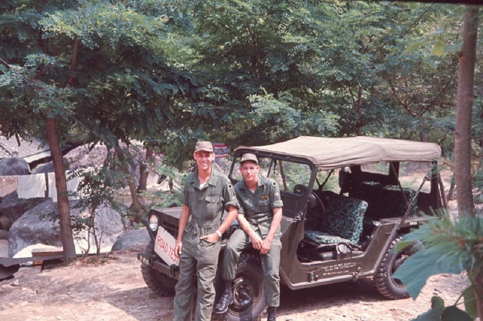 2023.08.08/ #아카이브 #기록 #엣사진 #안양유원지 #since1968/ 미군 짚차앞 그릴에 빨간 글씨로 흰바탕 판에 로드 테스트라고 적힌 표시판이 붙여진 도로주행 연습용 차량을 몰고 무더위를 식히기 위해 안양 유원지 계곡을 찾아온 주한 미군 운전병 훈련 교관과 신병이 찍은 1968년 8월의 안양유원지 풍경이다. photo : Mueller