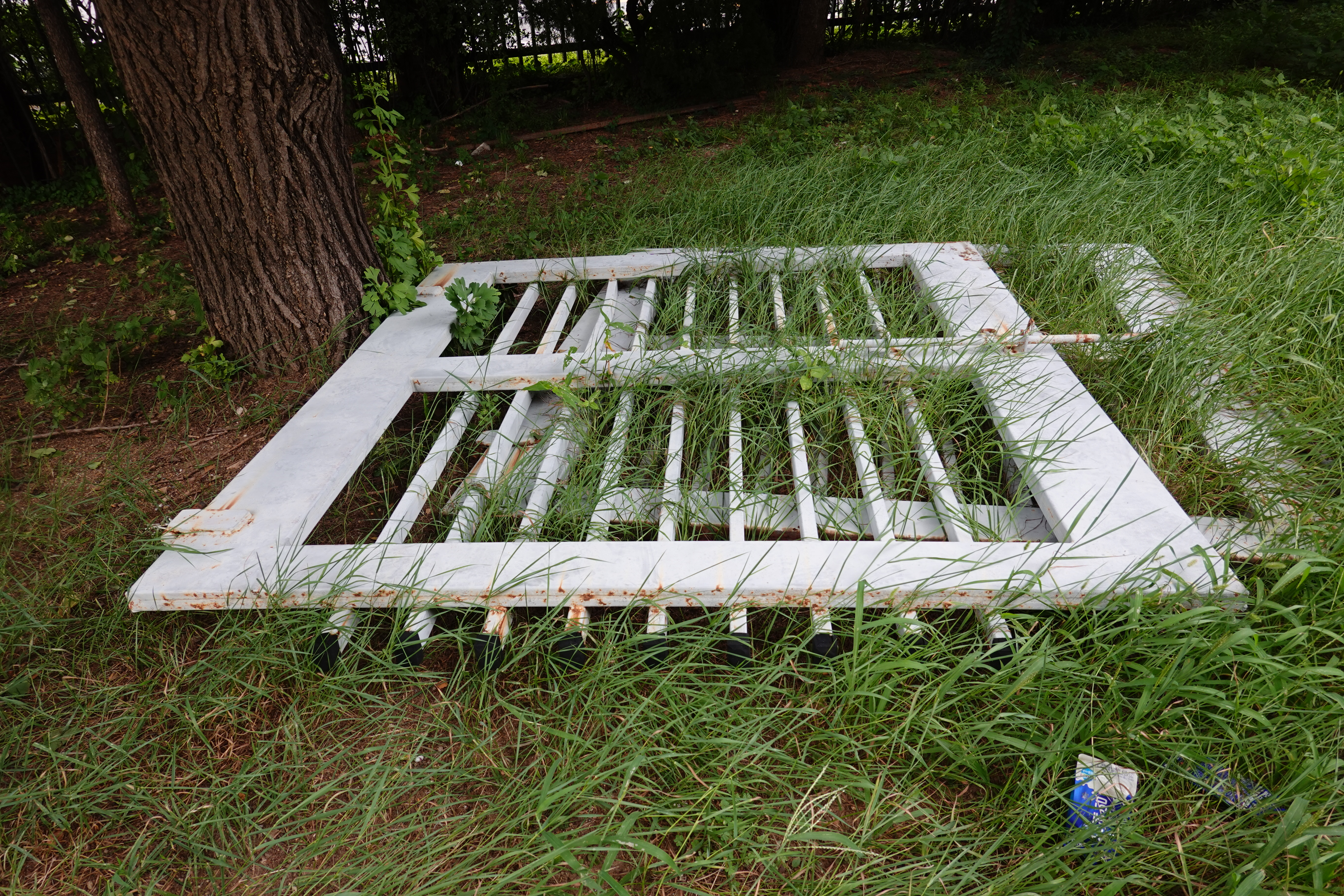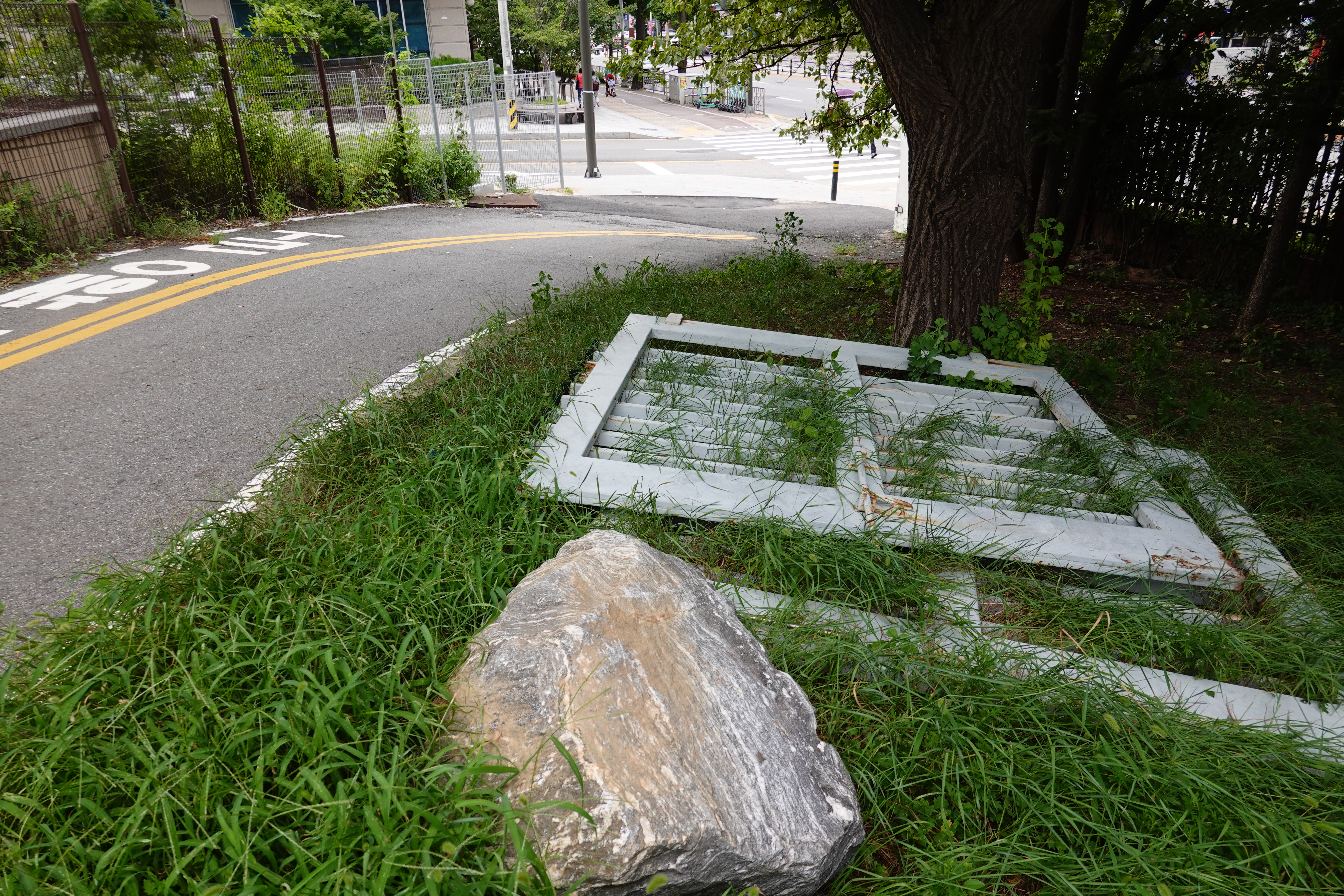 2023.08.09/ #에공 #도시기록 #안양6동 #옛검역원 #폐기물/ 옛검역원/ 검역원 북쪽 출입 철문이 땅바닥에 나딩글고 있어 오가는 시민들이 걸려 넘어지면서 다치지 않을까 우려된다. 이 철문은 검역원 북쪽 도로(소곡로)에 인도를 만들때 담장을 철거하면서 철거한것, 공사 끝난지가 언제인데 아직까지....