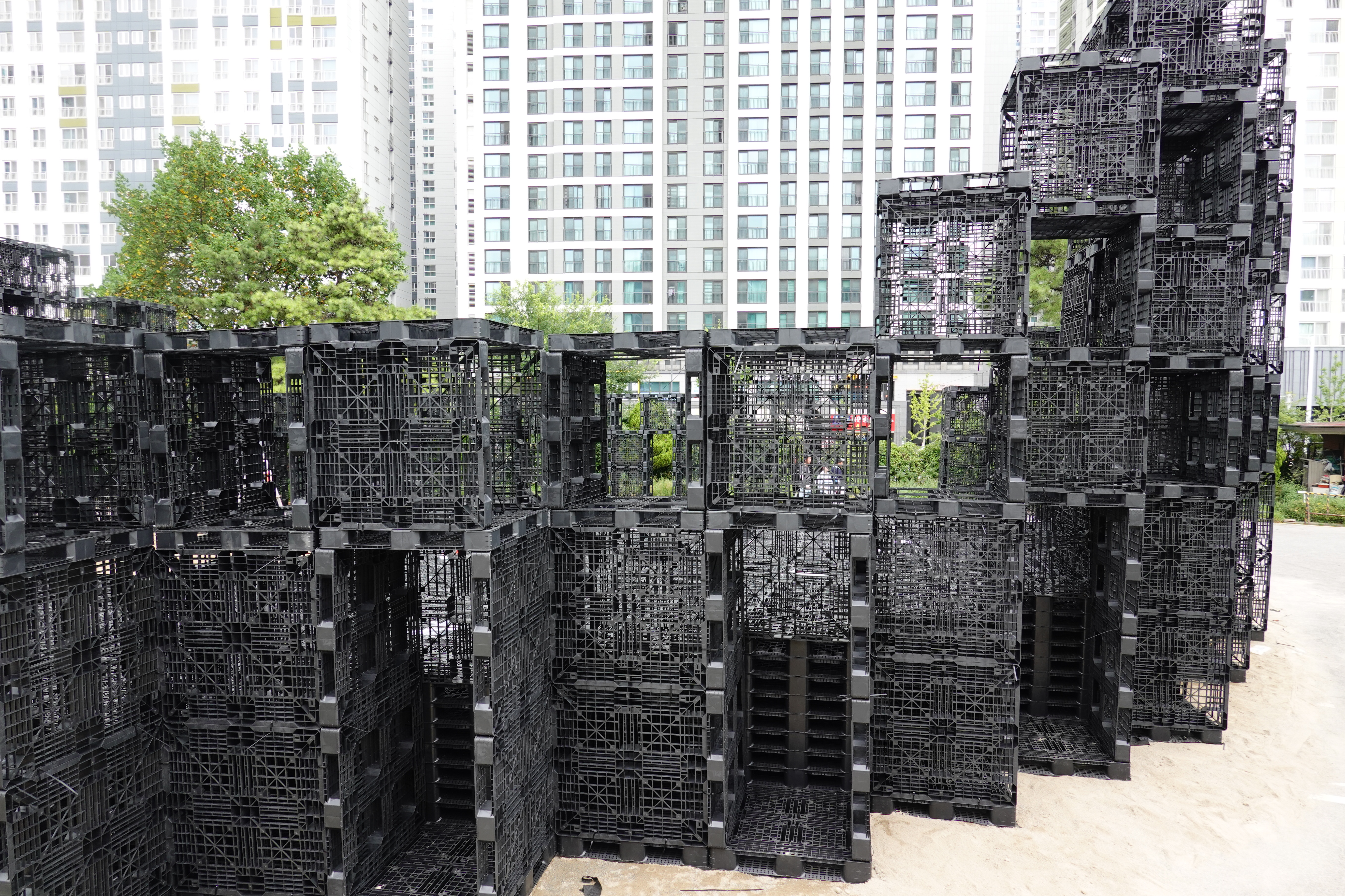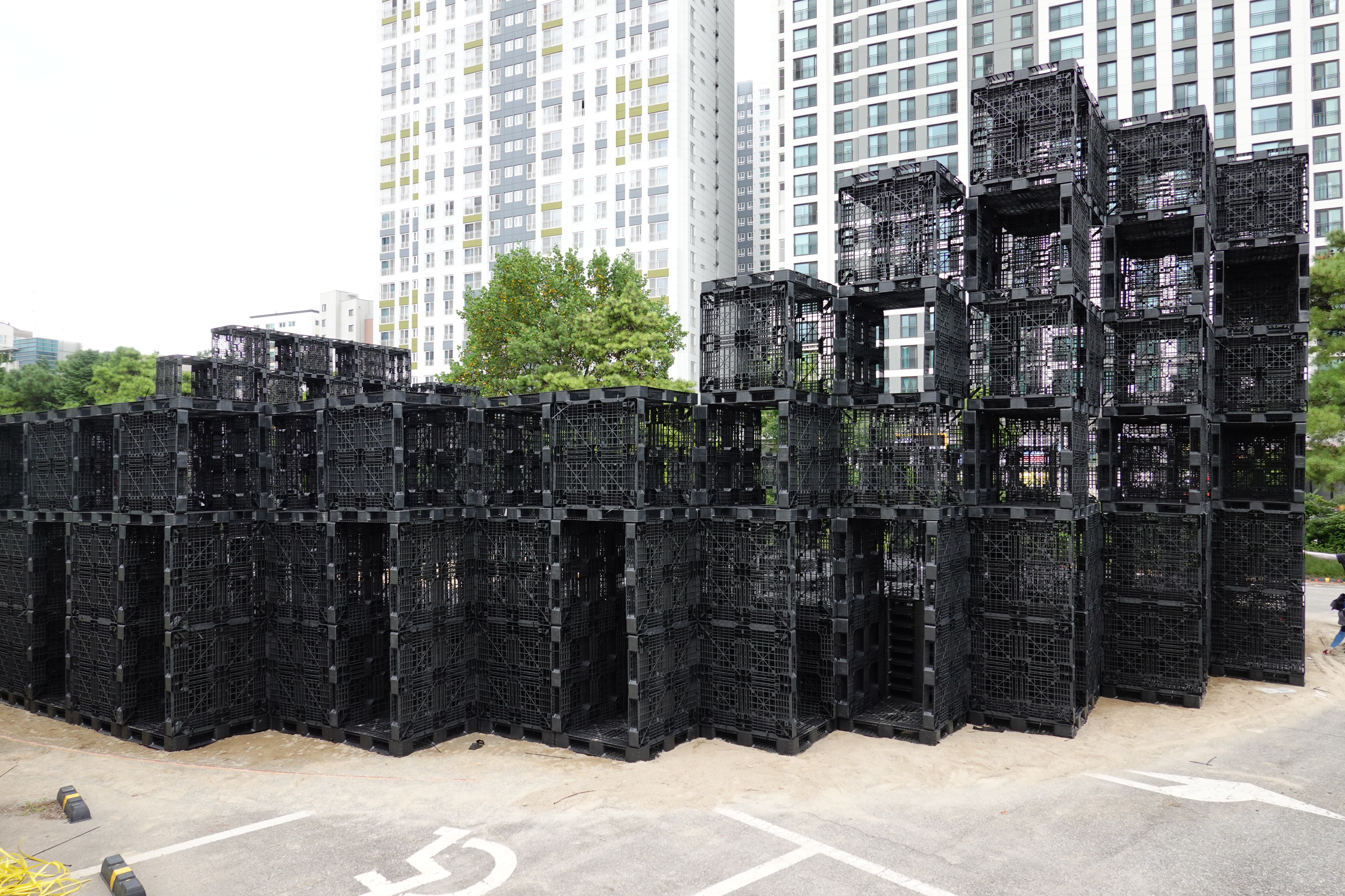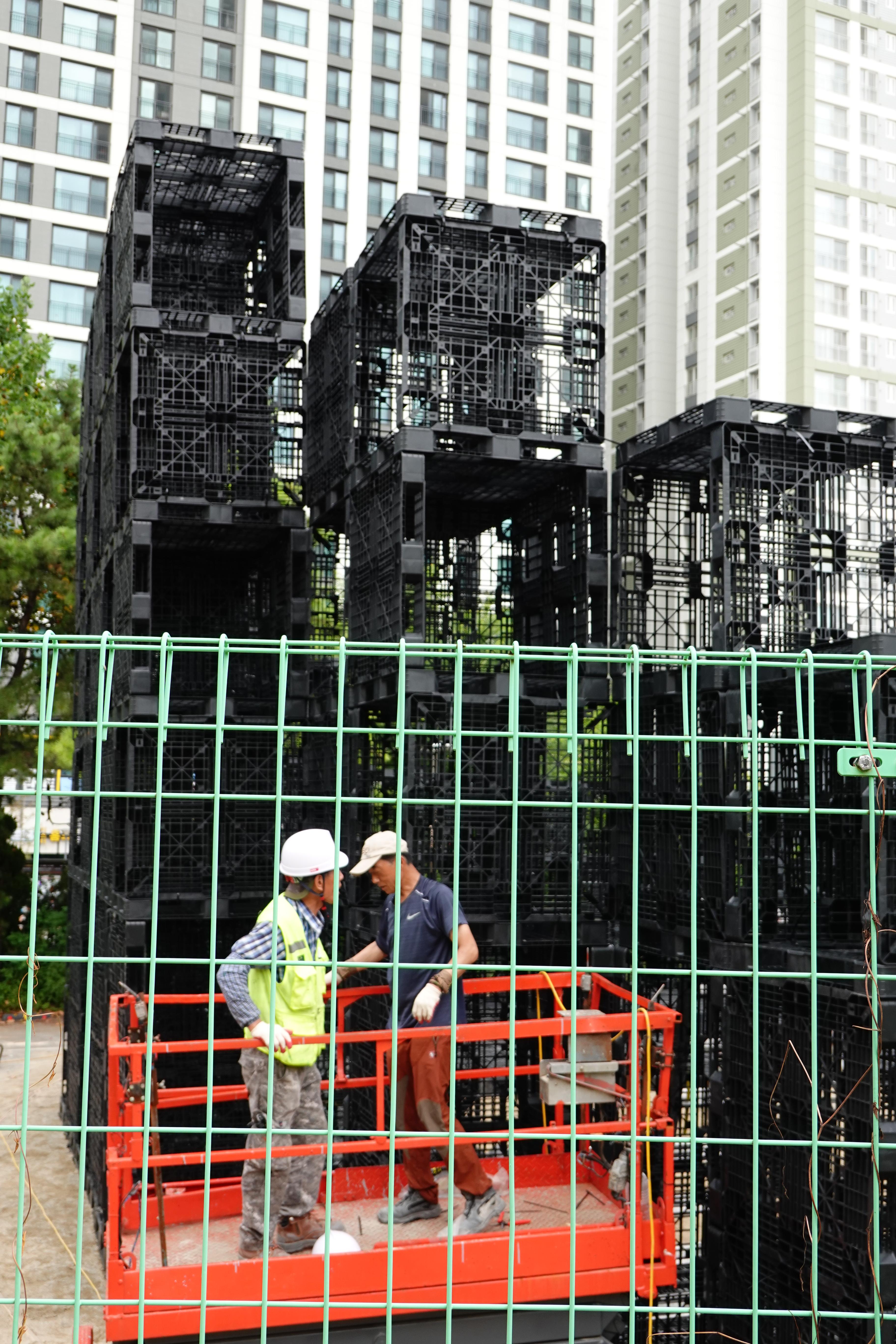 2023.08.09/ #도시기록 #안양 #APAP7 #안양공공예술프로젝트/ 메인행사장으로 오는 8월 25일개막식이 열리는 안양6동 옛검역원 주차장 자리에 설치중인 시설물. 태풍 카눈이 바람이 거세다는데 괜찮을까나. 보기에 위태롭다.