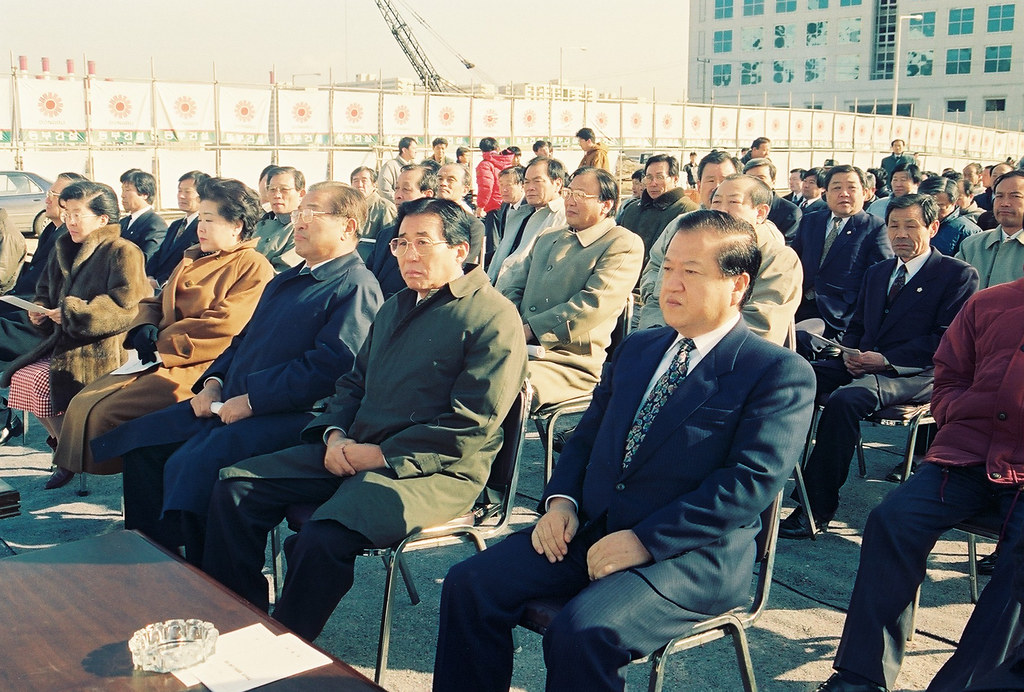 첫번째 사진 뒤 좌측에 보이는 건물은 지금은 철거돼 없어진 국토연구원인데 준공식을 갖기 직전의 모습이다. 국토연구원은 1994년 4월 17일 준공한 지하 2층~지상 10층(연면적 1만9천961㎡) 규모로 연구소다운 설계로 특특한 미를 뽐내 안양시로 부터 아름다운 건축물 대상을 받기도한 건축물이었다. 정부의 공기업 지방이전 정책에 따라 2017년 세종시로 연구원이 이전한후 매물로 내놨던 종전부동산이었는데 철거된 이후 현재 그 자리에는 오피스텔(평촌프푸지오센트럴파크)을 신축중에 있다. 이날 기공식에 참가한 사진속 인물을 보니 당시 국회의원었던 신영순, 김일주, 이인제의 얼굴이 보인다.