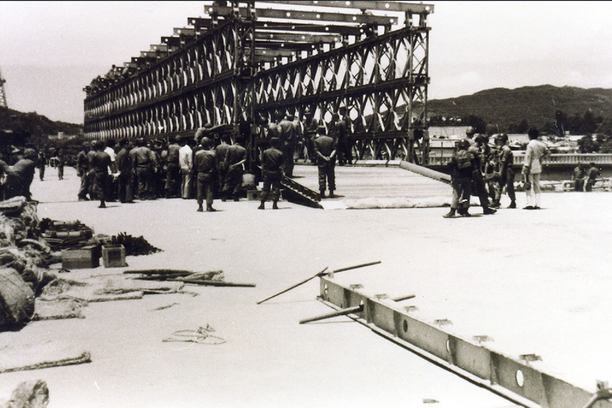 2023.08.22/ #아카이브 #옛사진 #기록 #기억 #77수해 #안양대홍수/ 1977년 안양천 안양대교가 수해로 붕괴돼 공병대대 군인들이 장간조립교를 구축하는 사진으로 국가기록원에 보존되어 있는 기록물이다. 장간조립교란 강철 트러스 구조로 만들어진 부재를 조립하여 만드는 교량으로 공병부대 일중 가장 힘들고 고된 일로 알려져 있다.