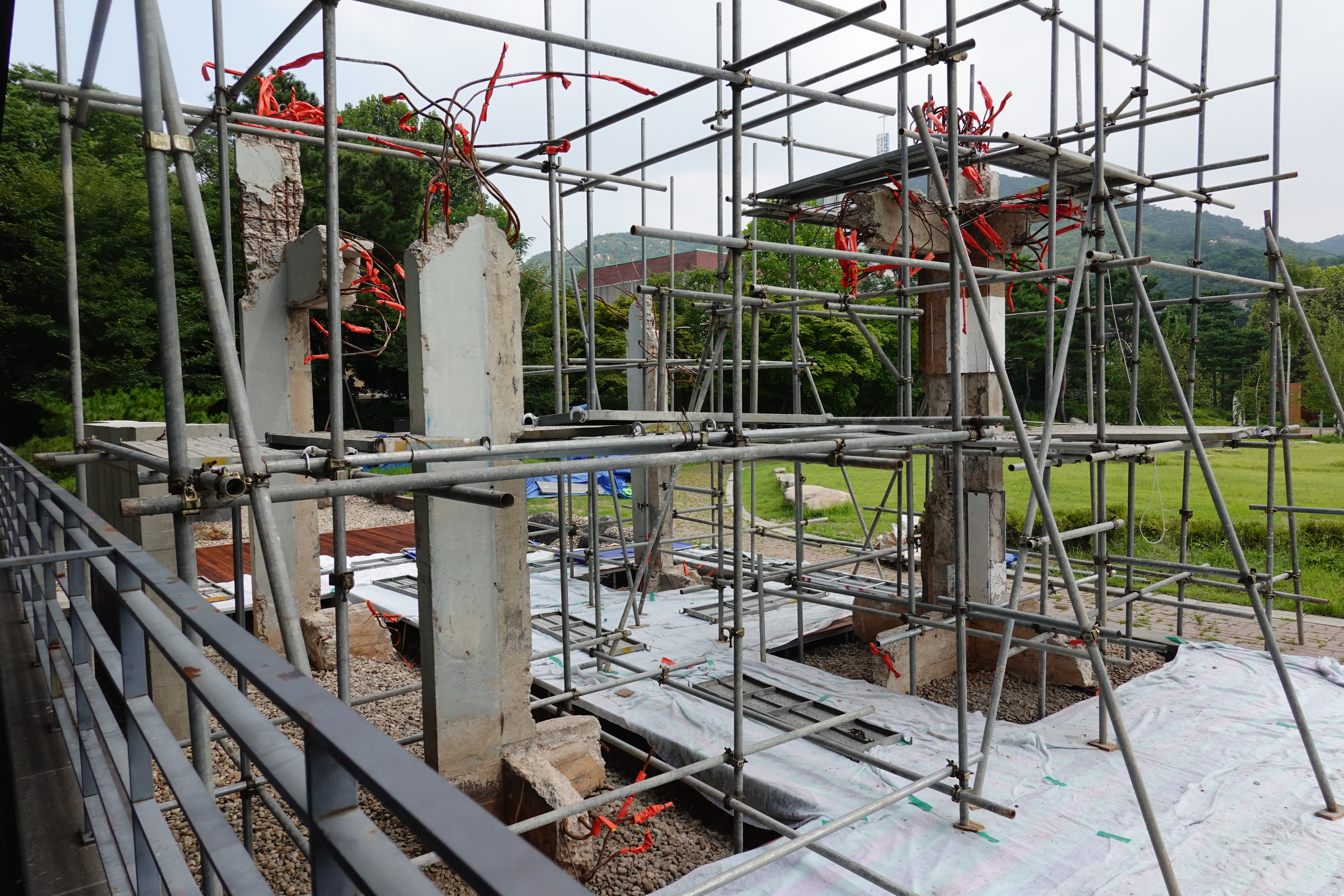 2023.08.18/ #도시기록 #건축전시회 #김중업 #안양예술공원/ 어느 건축가의 흔적. 안양박물관 특별전시관 앞에서 열리는 주한 프랑스대사관의 기증유뮬 특별기획전 <어느건축가의 흔적> 작품 설치가 한창인 현장을 들여다보다. 이번 전시는 건축가 김중업의 대표 작품인 주한 프랑스대사관 건축 부재 일부를 기중받아 선보이는 뜻깇은 자리로 건축 문화유산의 보존과 활용이라는 측면에서 의미있는 전시회다. 개막식은 9월6일 오후3시이다.