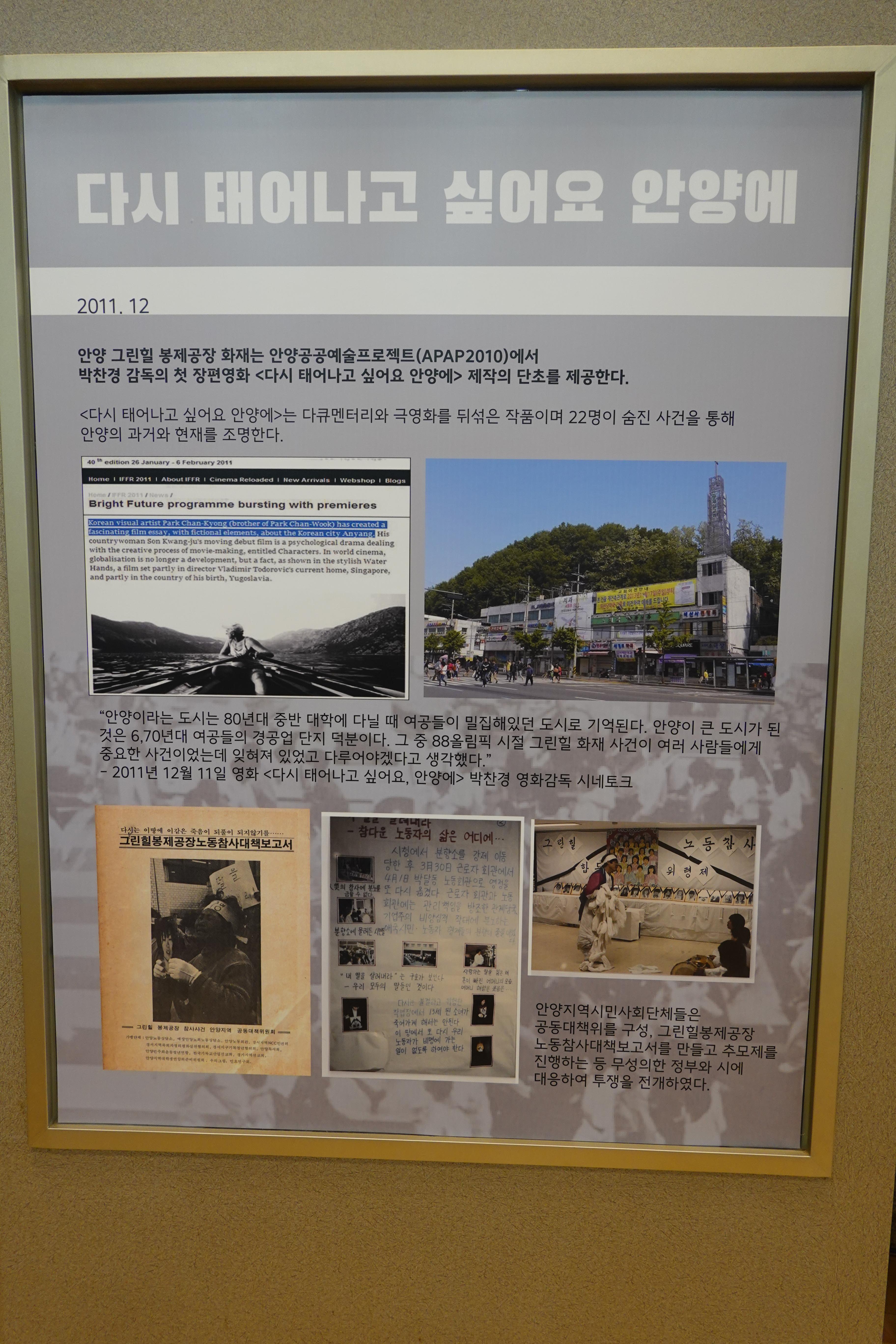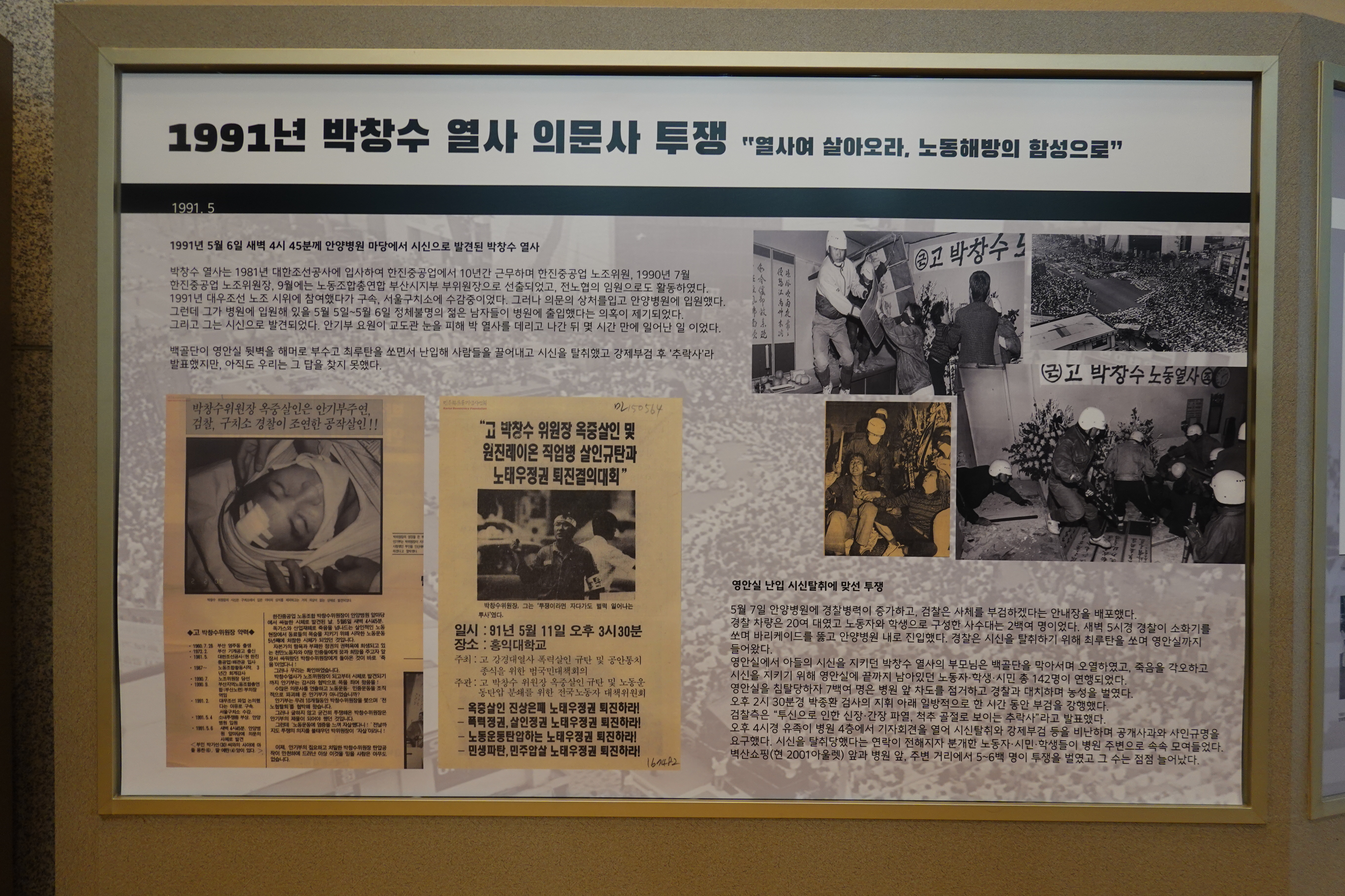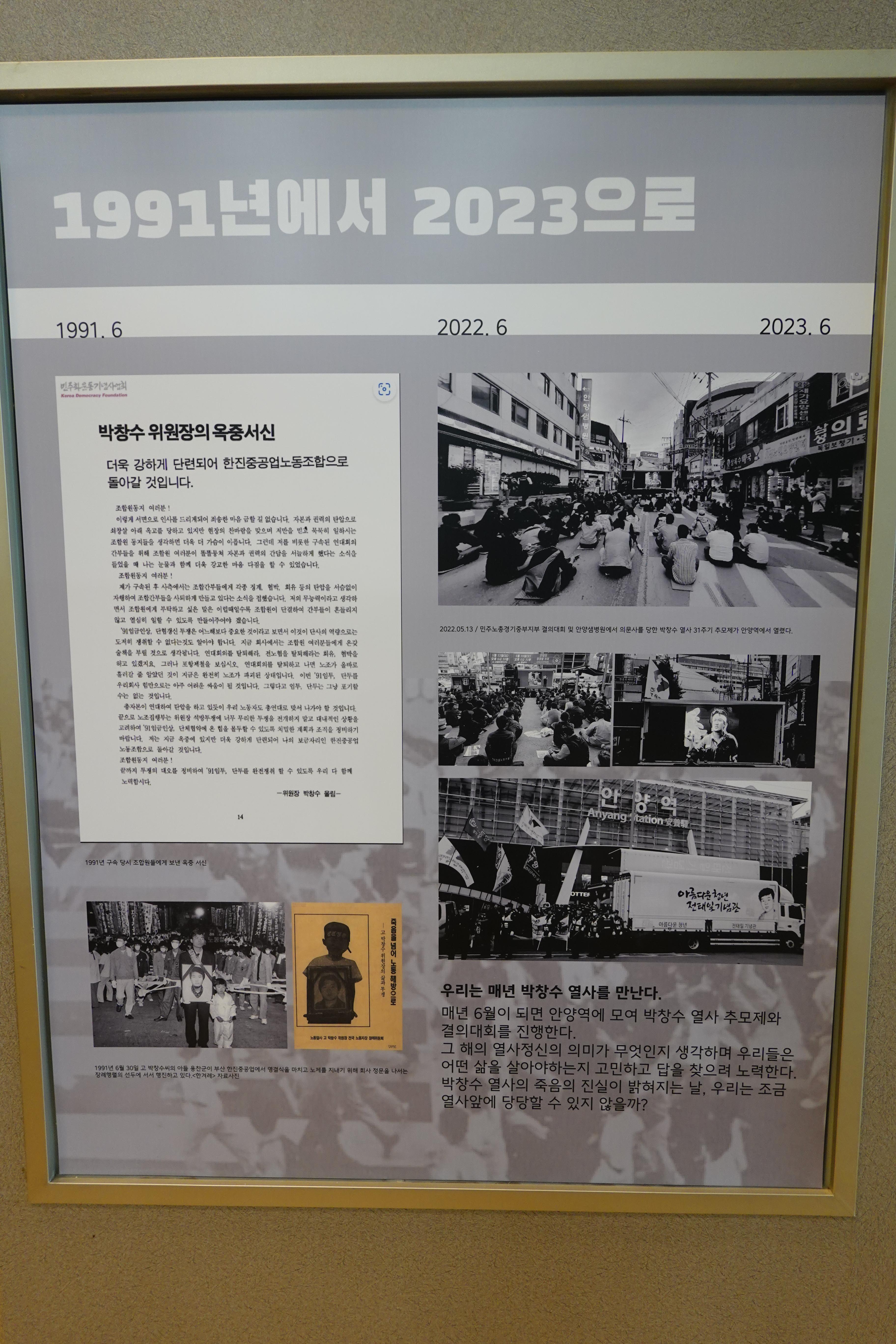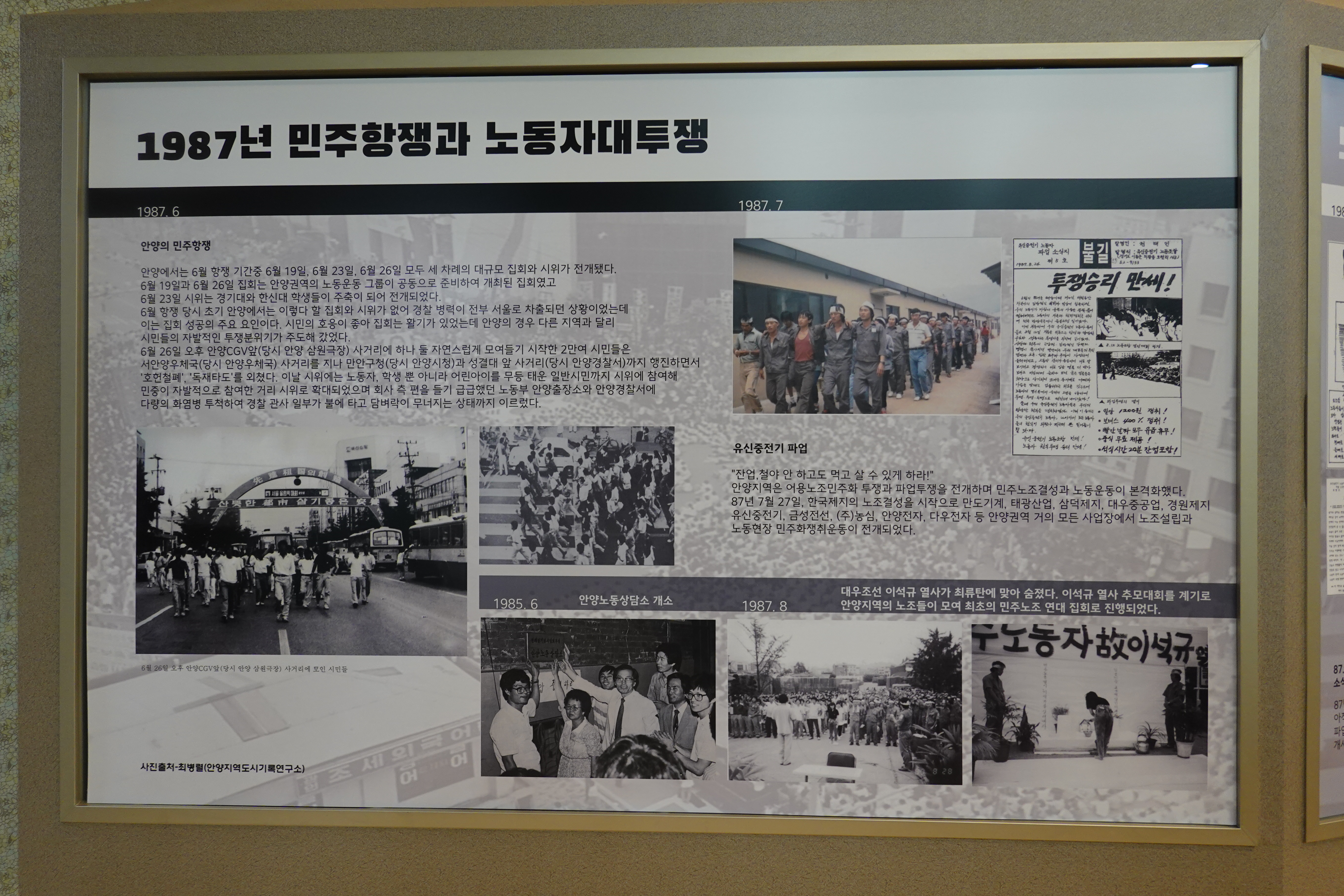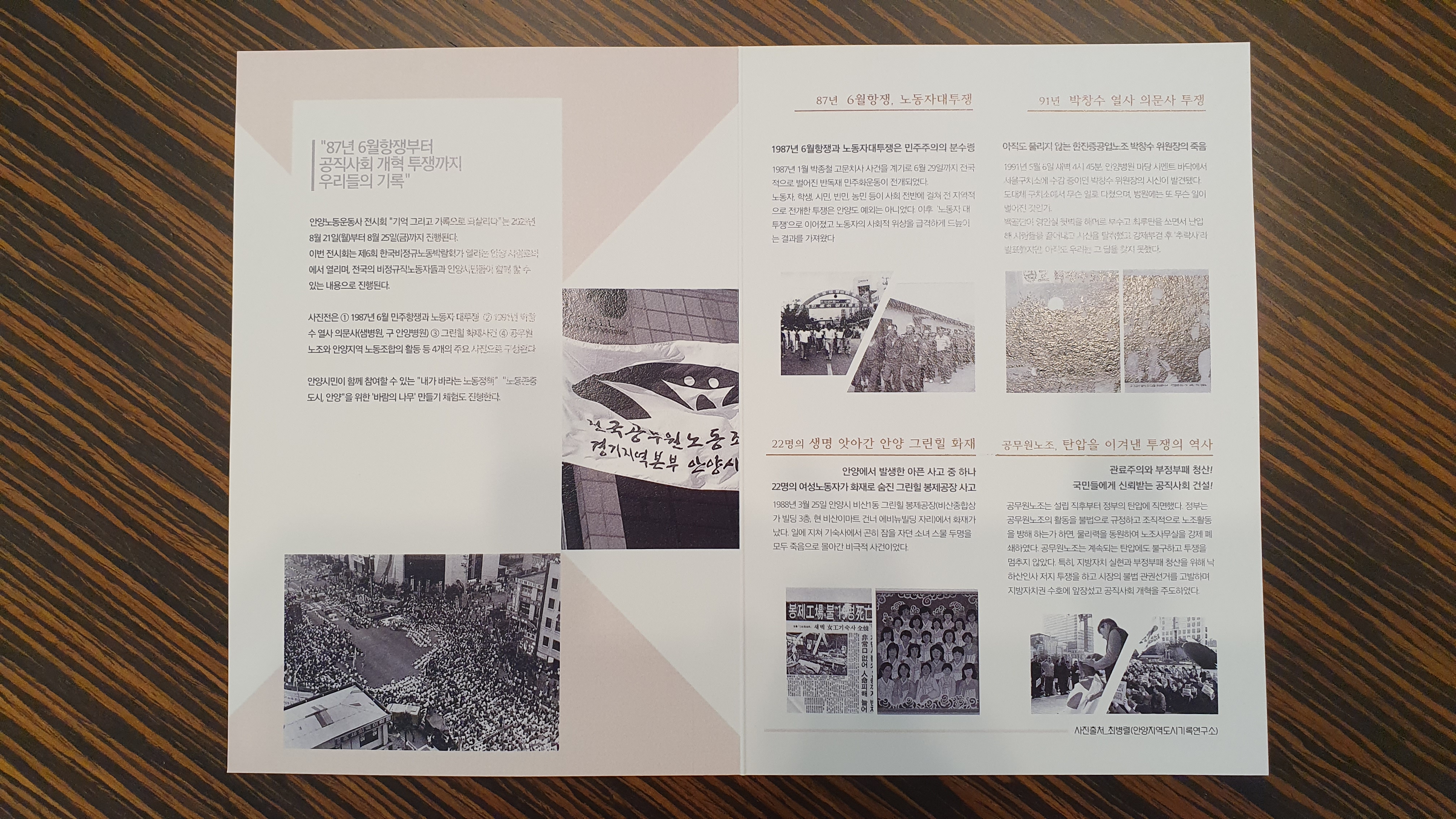 ▲1987년 6월 민주항쟁과 노동자 대투쟁 ▲그린힐 화재 노동자 사망사건 ▲1991년 박창수 열사 의문사 ▲공무원노조와 안양지역 노동조합의 활동 등 4개의 주요 사건을 중심으로 전시를 구성했으며 모니터 영상으로는 안양지역 노동자들의 삶과 투쟁을 기록으로 확인할 수 있다.
