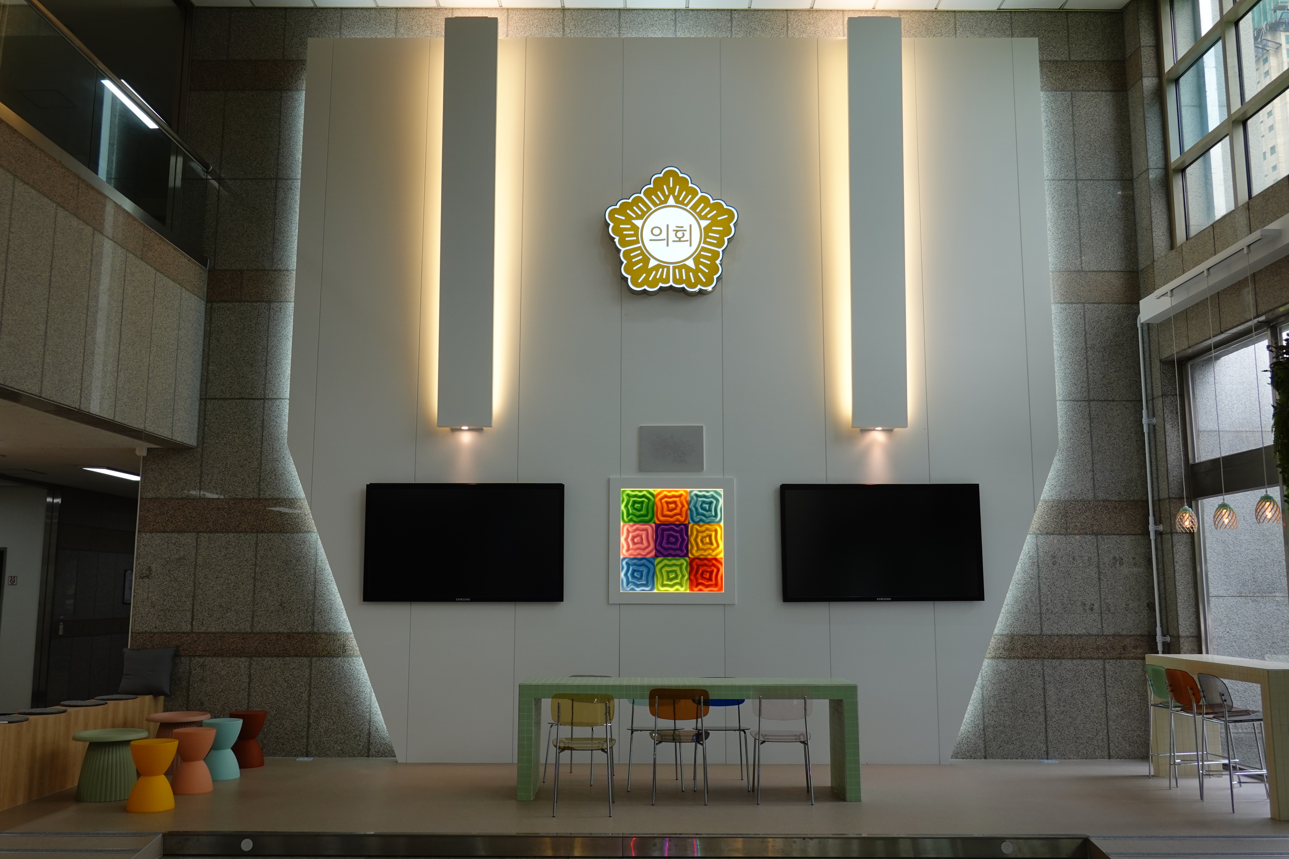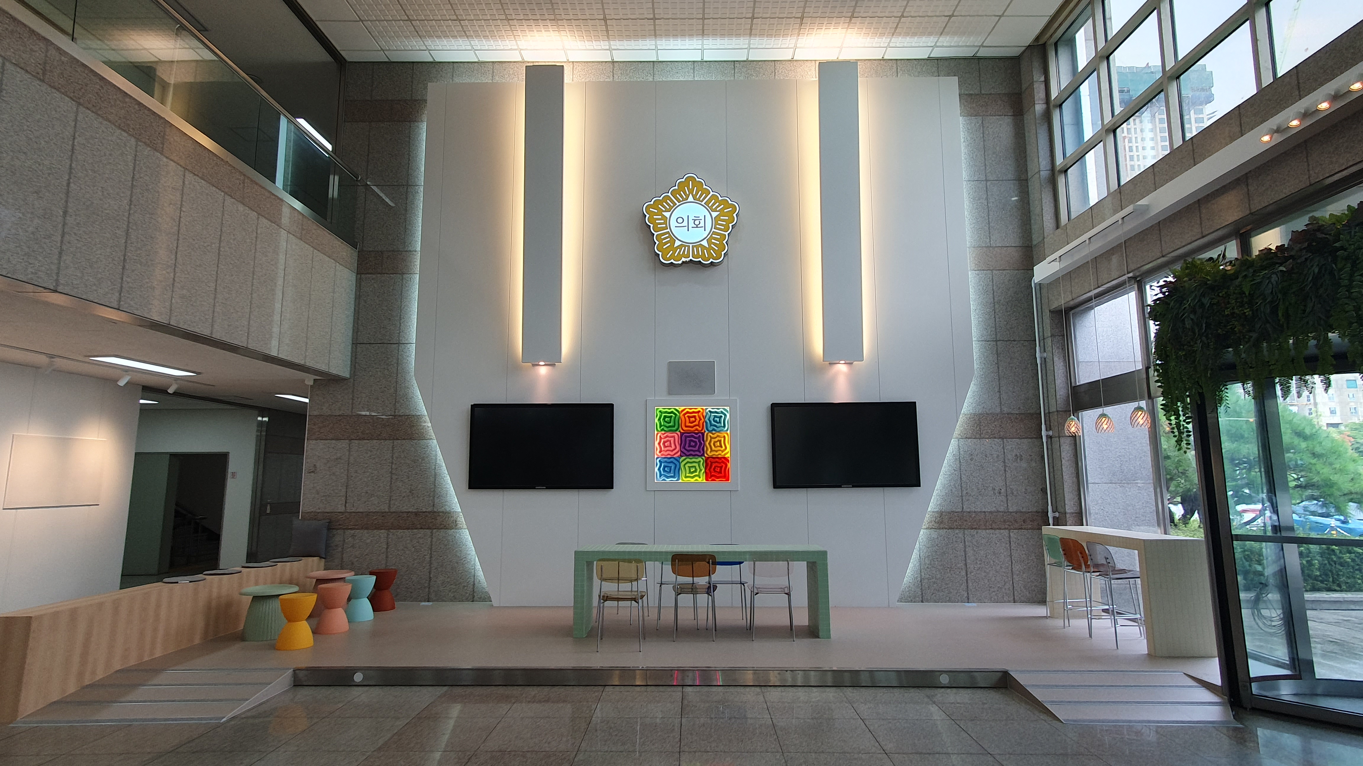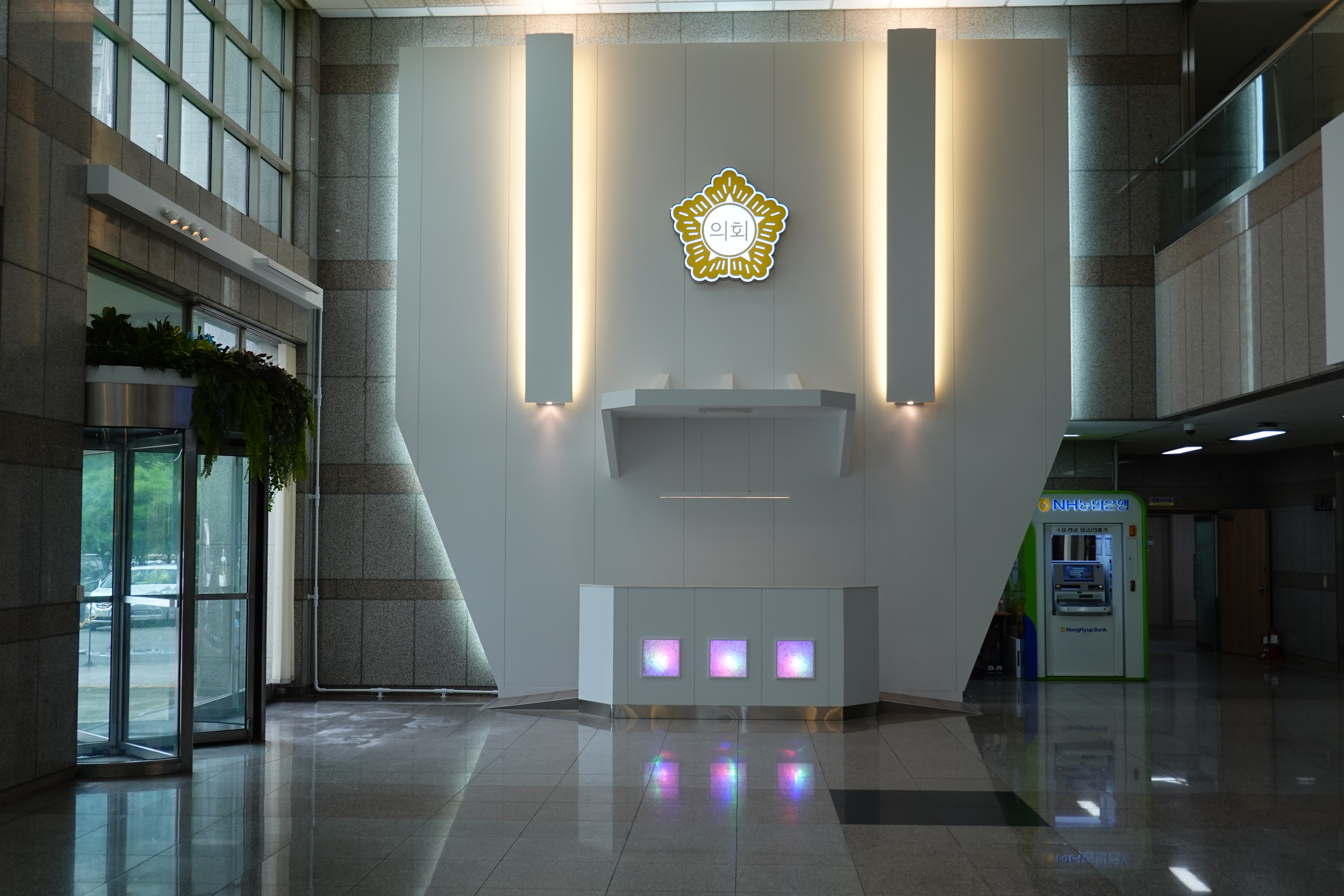 2023.08.23/ #도시기록 #안양시의회 #인테리어 #디자인/ 안양시의회 1층 로비가 리모델링 공사를 통해 깔끔하고 시원스럽게 트인 공간으로 바뀌었다. 휴게공간의 벽 파동액자, 조명등. 의자와 테이블까지 곳곳에 리모델링을 기획한 안양시 도시디자인팀 양한규 보좌관의 주특기인 3D프린팅 기술을 적용한 모습이 보이고 밝기를 조절하는 인포데스크 조명디자인 등 구석구석 작은 디테일이 엿보인다. 장애인의 접근 편리성을 도입한 부분도 좋다. 그런데 대형 의회 마크를 양쪽 벽면에 각각 하나씩 두개나 부착했을까. 디자인상 이유가 있겠지만 왠지 어색하다. 한쪽엔 다른 디자인을 했더라면...