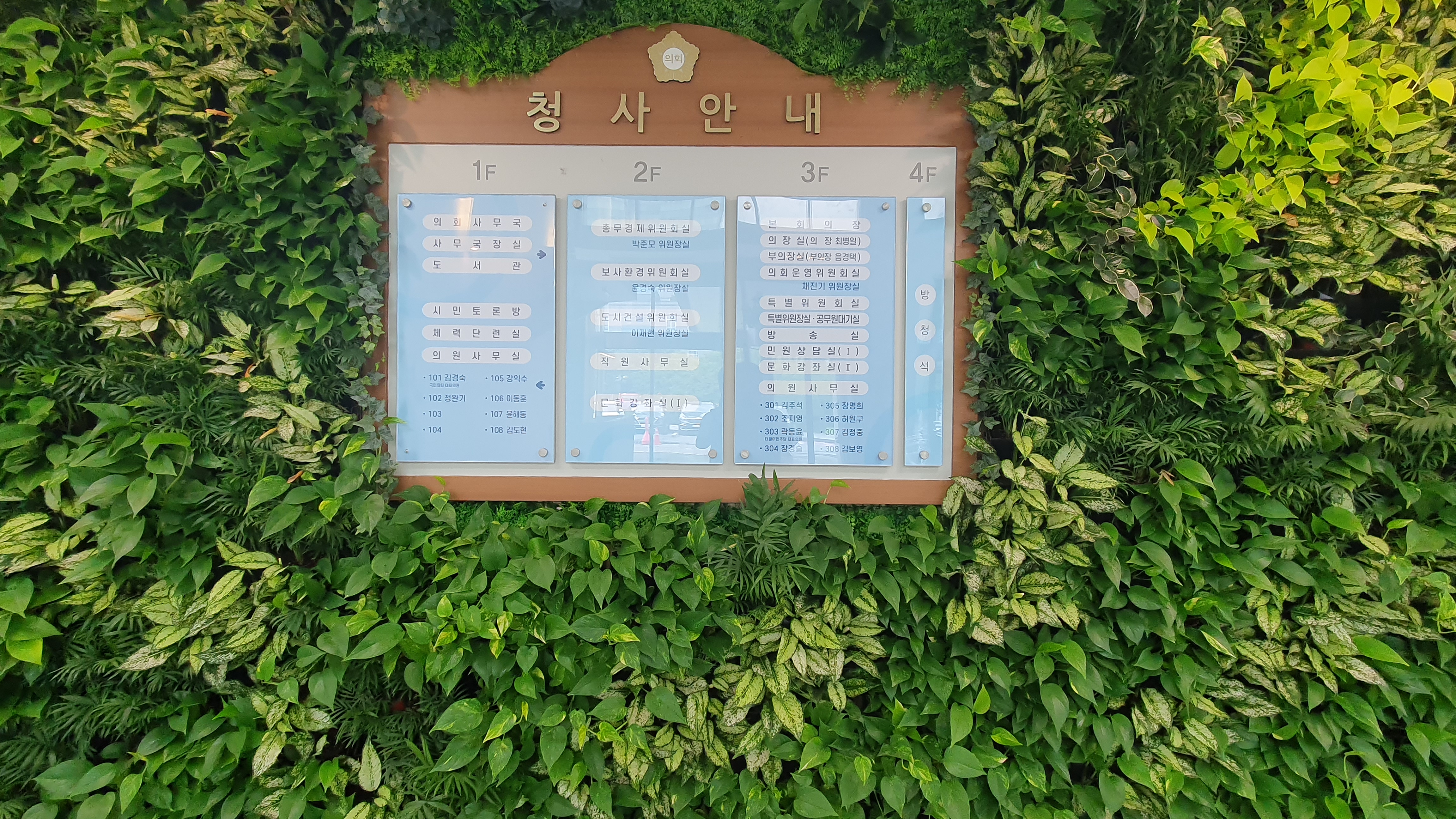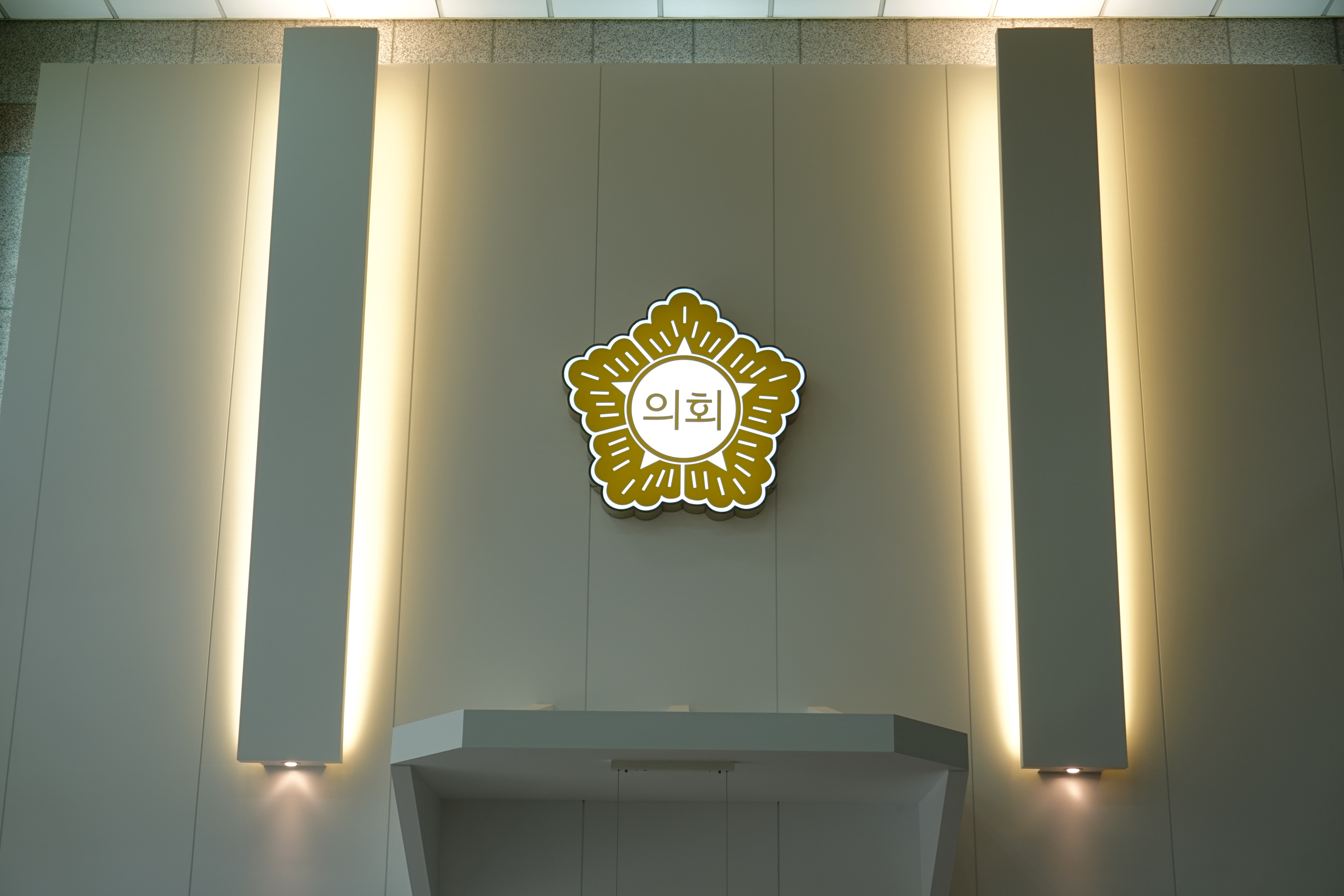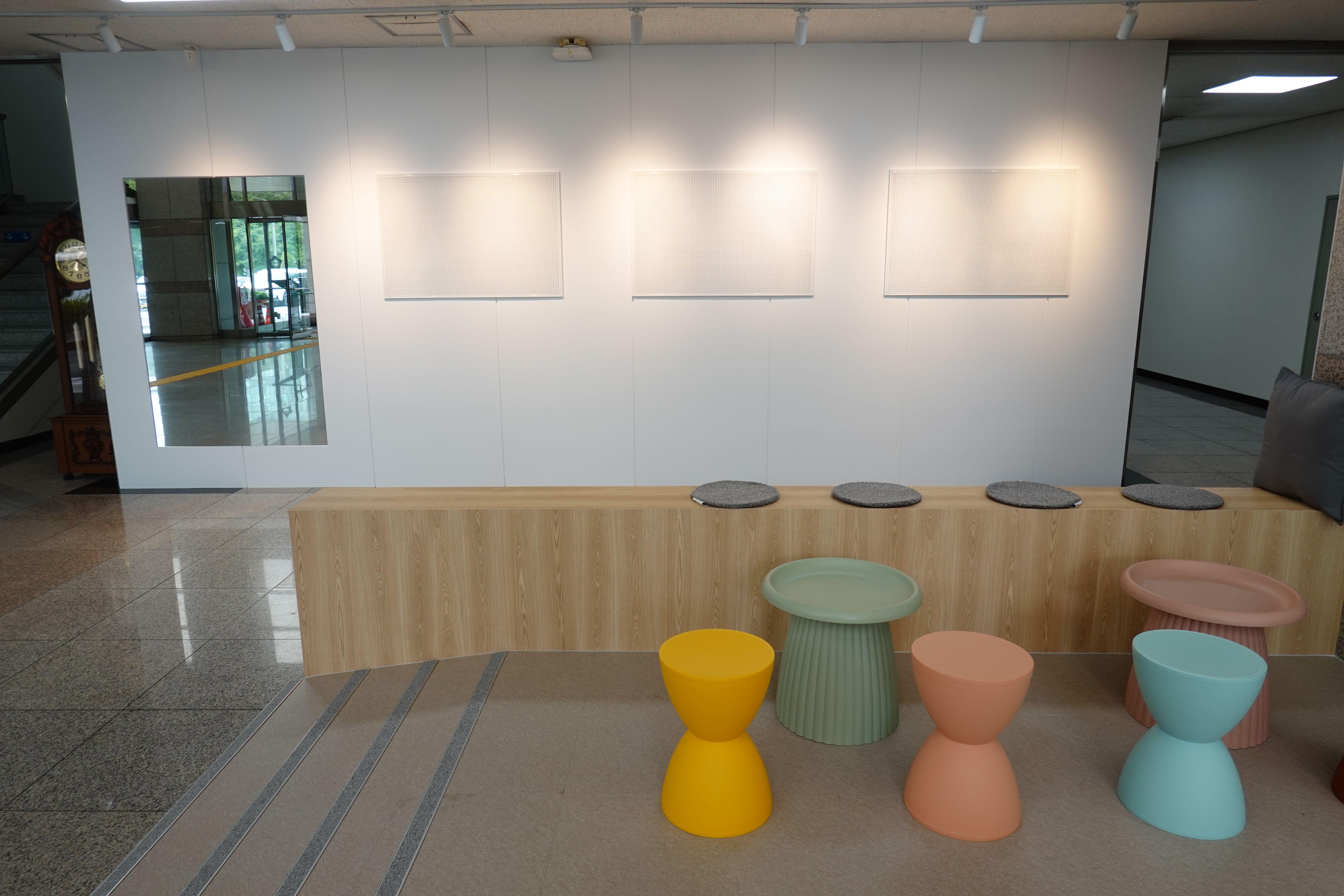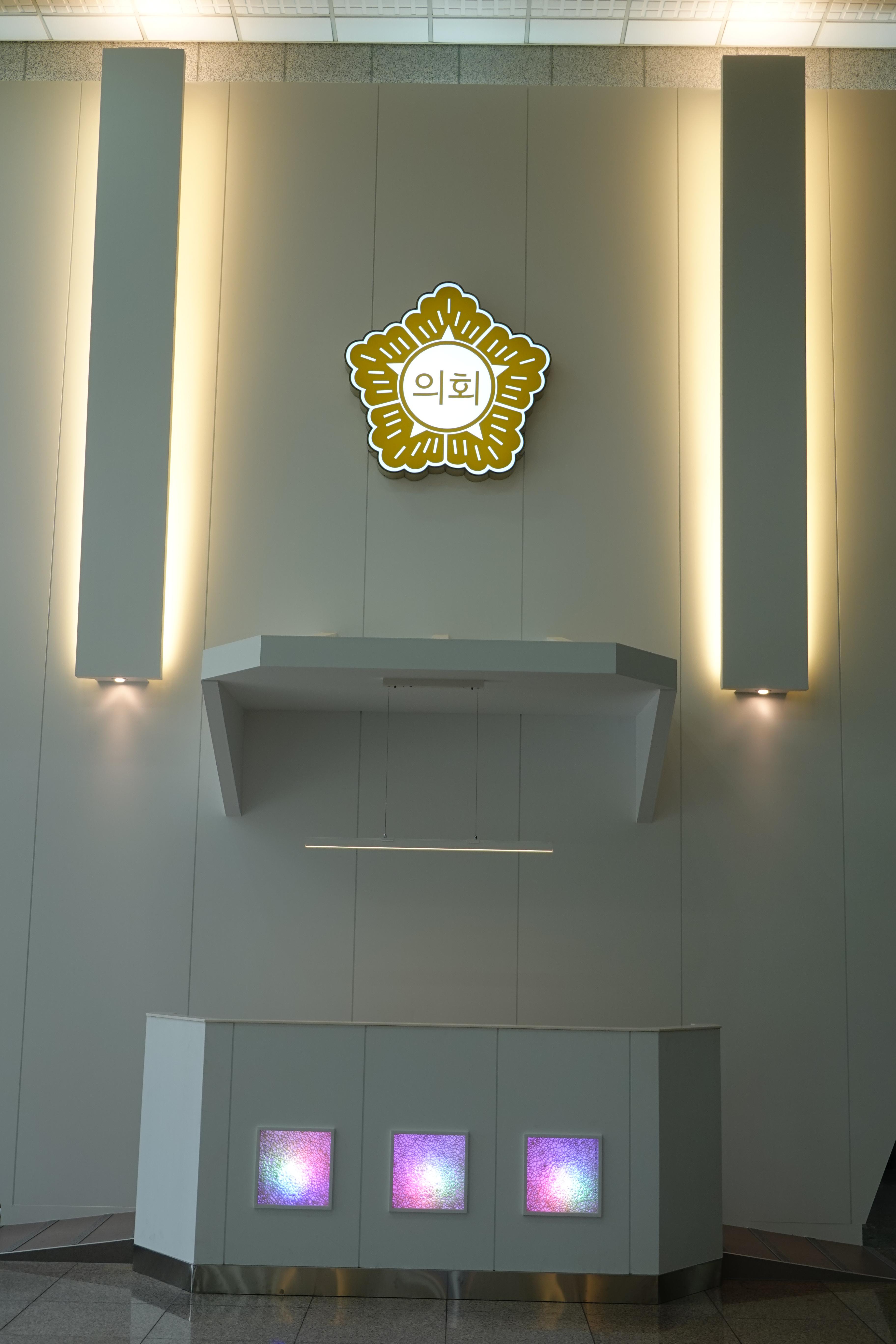 2023.08.23/ #도시기록 #안양시의회 #인테리어 #디자인/ 안양시의회 1층 로비가 리모델링 공사를 통해 깔끔하고 시원스럽게 트인 공간으로 바뀌었다. 휴게공간의 벽 파동액자, 조명등. 의자와 테이블까지 곳곳에 리모델링을 기획한 안양시 도시디자인팀 양한규 보좌관의 주특기인 3D프린팅 기술을 적용한 모습이 보이고 밝기를 조절하는 인포데스크 조명디자인 등 구석구석 작은 디테일이 엿보인다. 장애인의 접근 편리성을 도입한 부분도 좋다. 그런데 대형 의회 마크를 양쪽 벽면에 각각 하나씩 두개나 부착했을까. 디자인상 이유가 있겠지만 왠지 어색하다. 한쪽엔 다른 디자인을 했더라면...