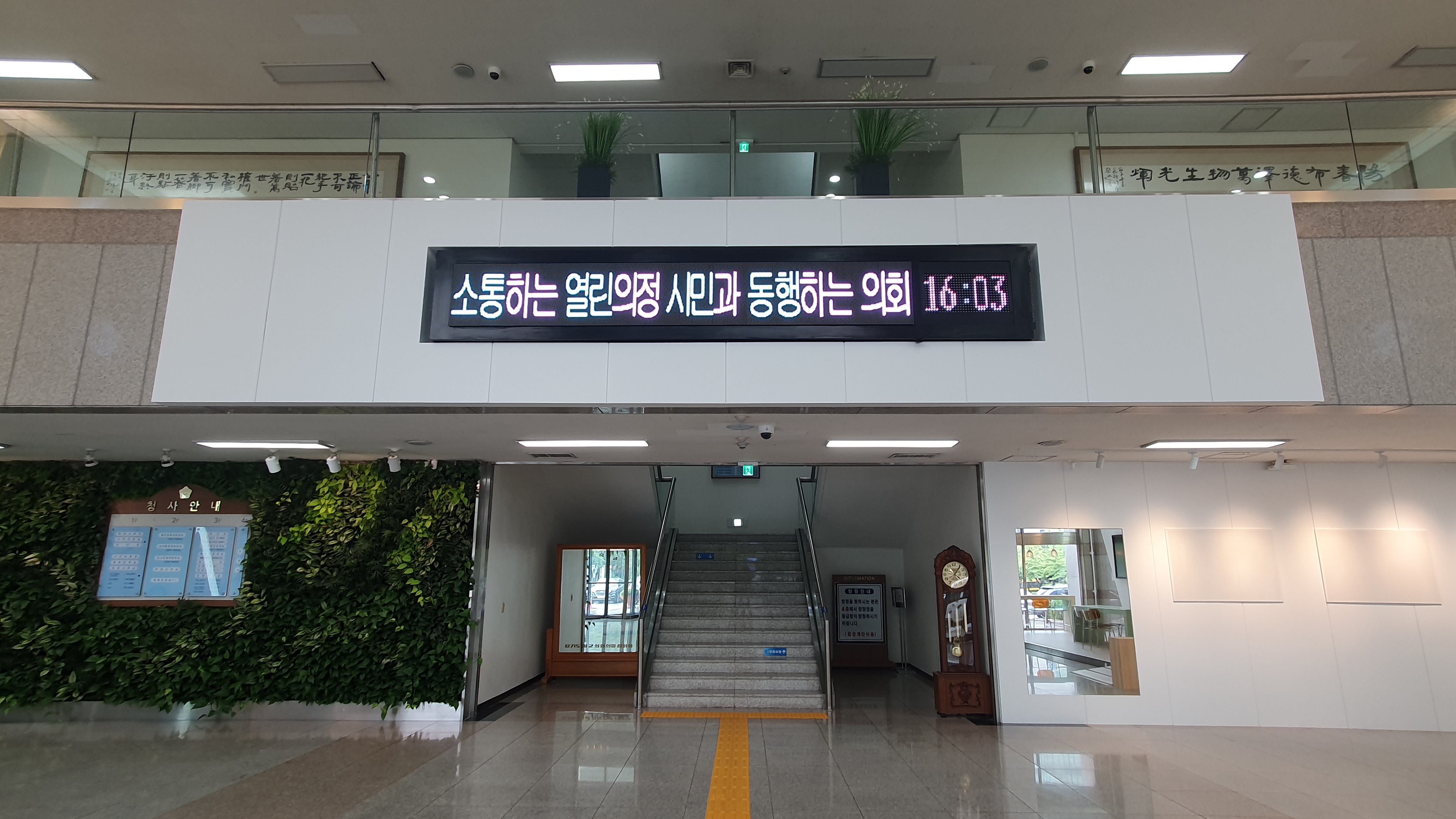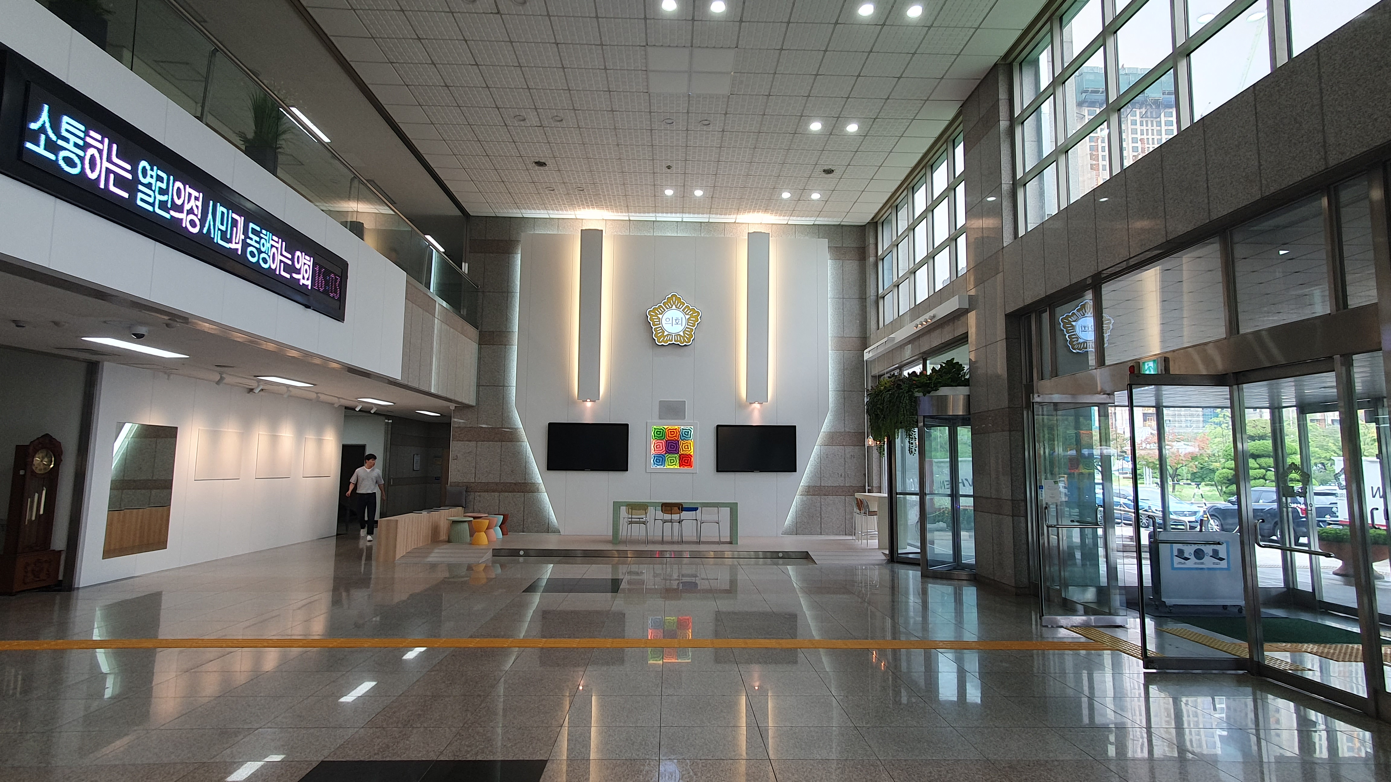2023.08.23/ #도시기록 #안양시의회 #인테리어 #디자인/ 안양시의회 1층 로비가 리모델링 공사를 통해 깔끔하고 시원스럽게 트인 공간으로 바뀌었다. 휴게공간의 벽 파동액자, 조명등. 의자와 테이블까지 곳곳에 리모델링을 기획한 안양시 도시디자인팀 양한규 보좌관의 주특기인 3D프린팅 기술을 적용한 모습이 보이고 밝기를 조절하는 인포데스크 조명디자인 등 구석구석 작은 디테일이 엿보인다. 장애인의 접근 편리성을 도입한 부분도 좋다. 그런데 대형 의회 마크를 양쪽 벽면에 각각 하나씩 두개나 부착했을까. 디자인상 이유가 있겠지만 왠지 어색하다. 한쪽엔 다른 디자인을 했더라면...