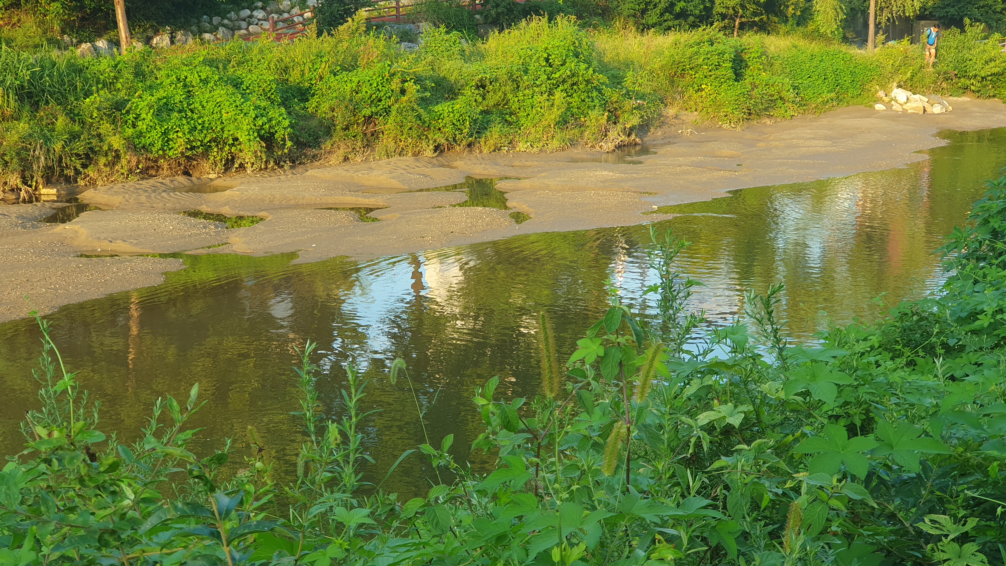 2023.09.02/ #도시기록 #학의천 #생태 #동안교/ 안양 학의천 동안교 윗쪽 하천에 모래톱이 곳곳에 생겨 모래 삼각주가 점차 커지고 있다. 원인이 무엇일까. 관양2동사무소옆 복개하천인 갈현천 상류 과천지식정보타운 공사 현장에서 내려오는 흙탕물속의 침전물 때문이 아닐까 싶기도 한데...