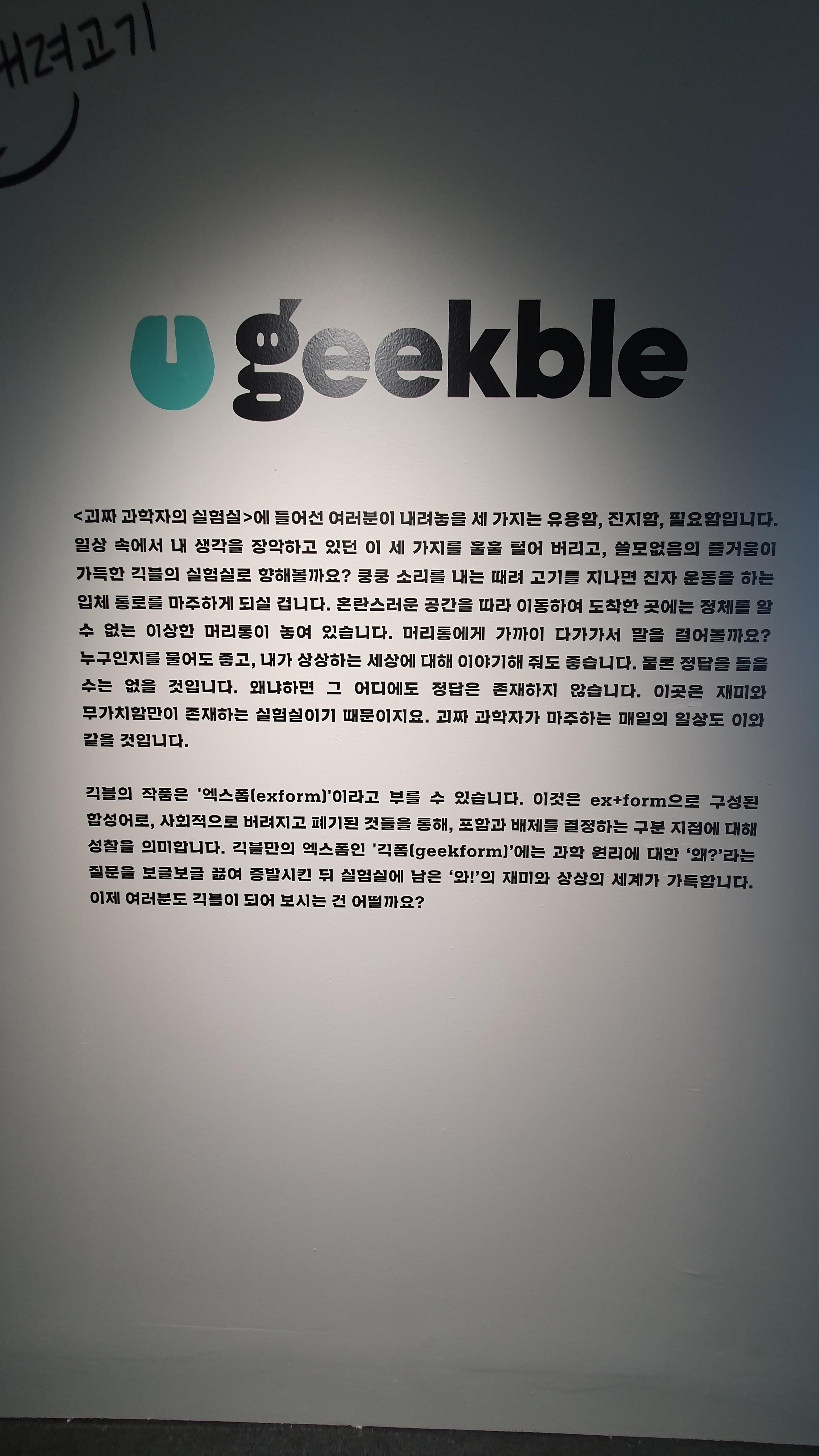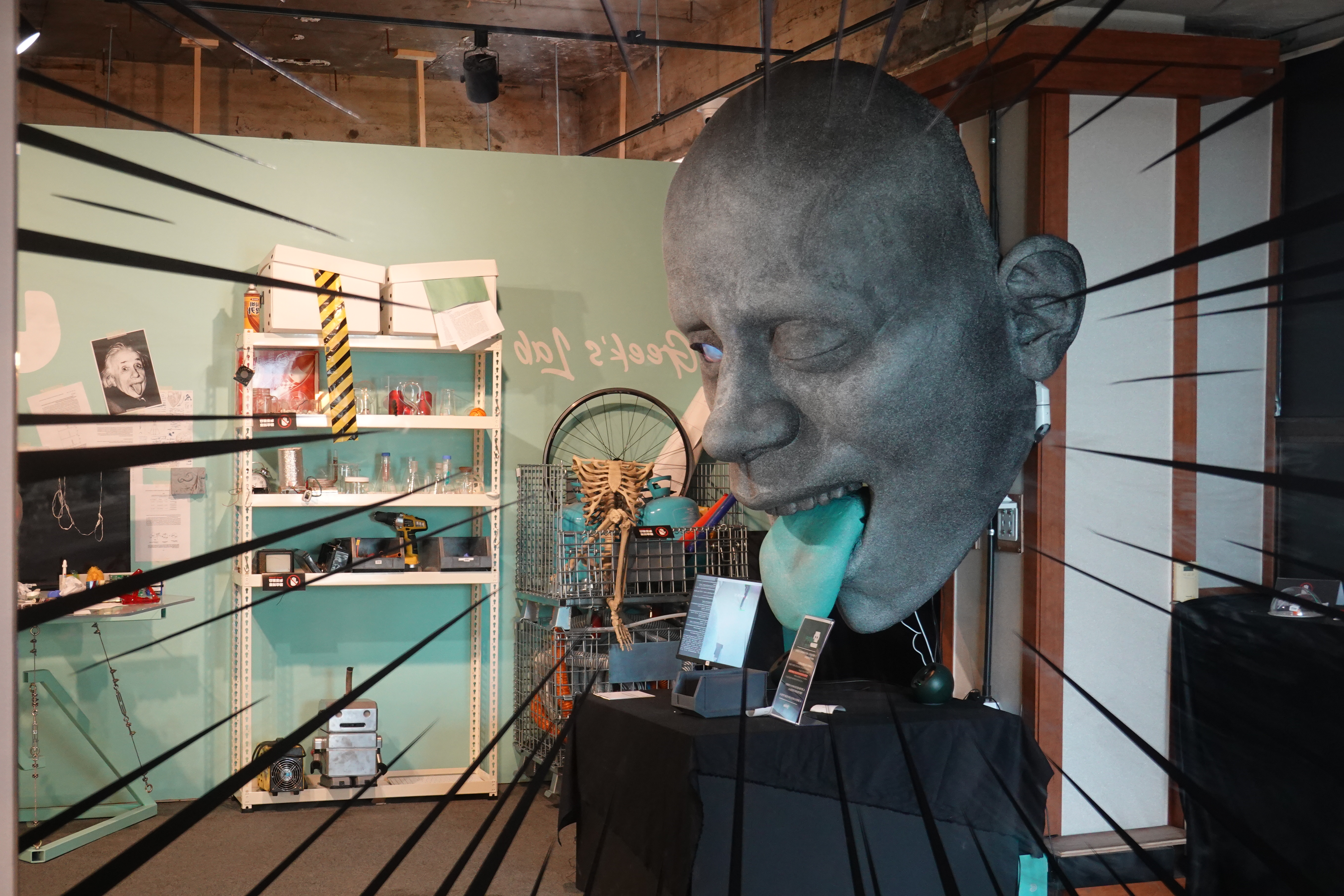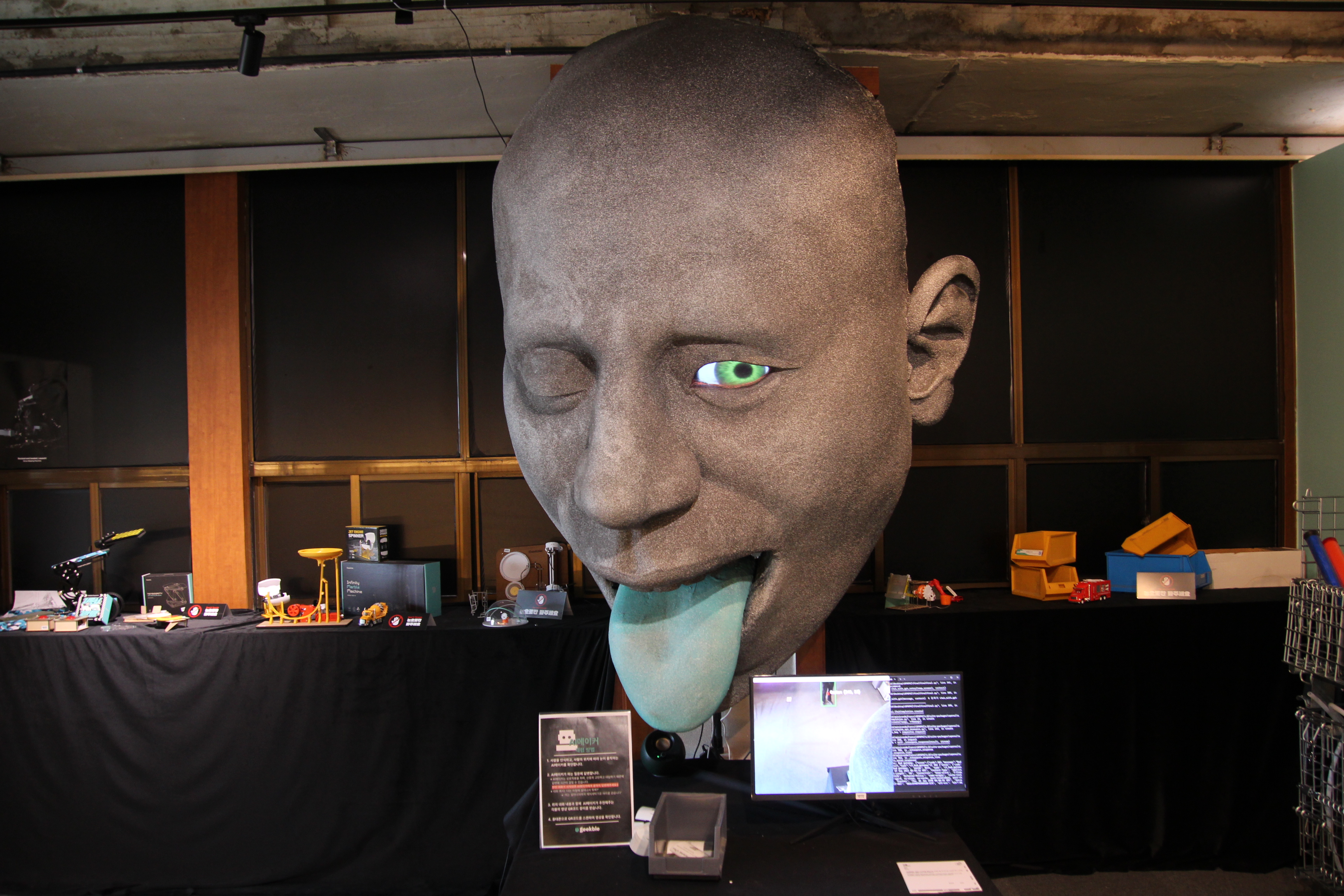 2023.09.08/ #APAP7 #안양공공예술프르젝트 #엣검역원 #긱블/ 요즘 초등학생들 사이에서 아주 인기라는 긱블의 작품. <괴짜과학자 실험실>에는 한쪽 눈만 뜨고 혀를 내밀고 있는 아주 커다란 얼굴이 있다. 긱블의 <AI 메이커>이다. 긱블은 과학 교육 회사, 과학공학적인 메이킹을 하는 100만 유튜버들이다. 과짜과학자 실혐실에는 신기한것들로 가특차있다.