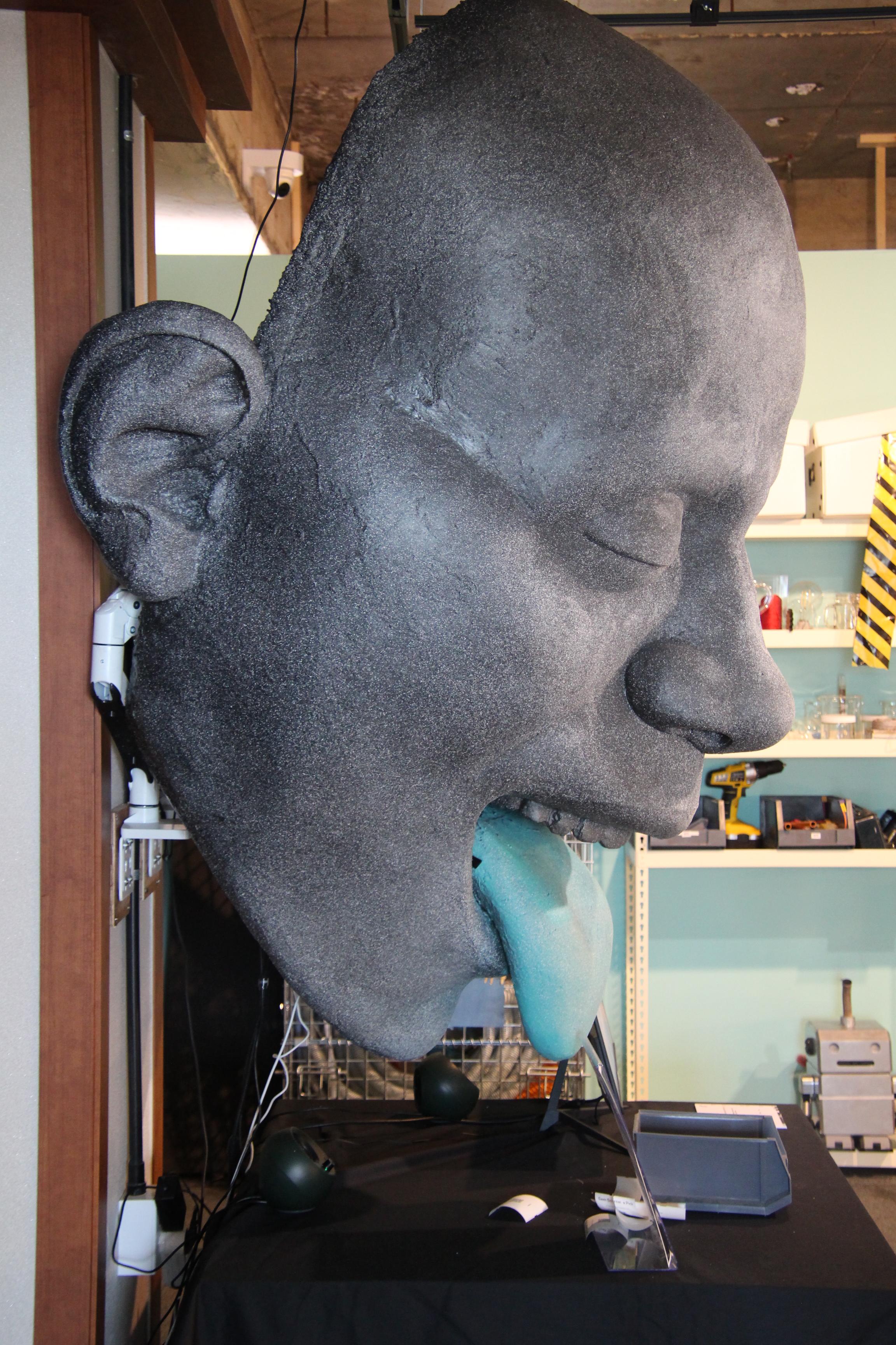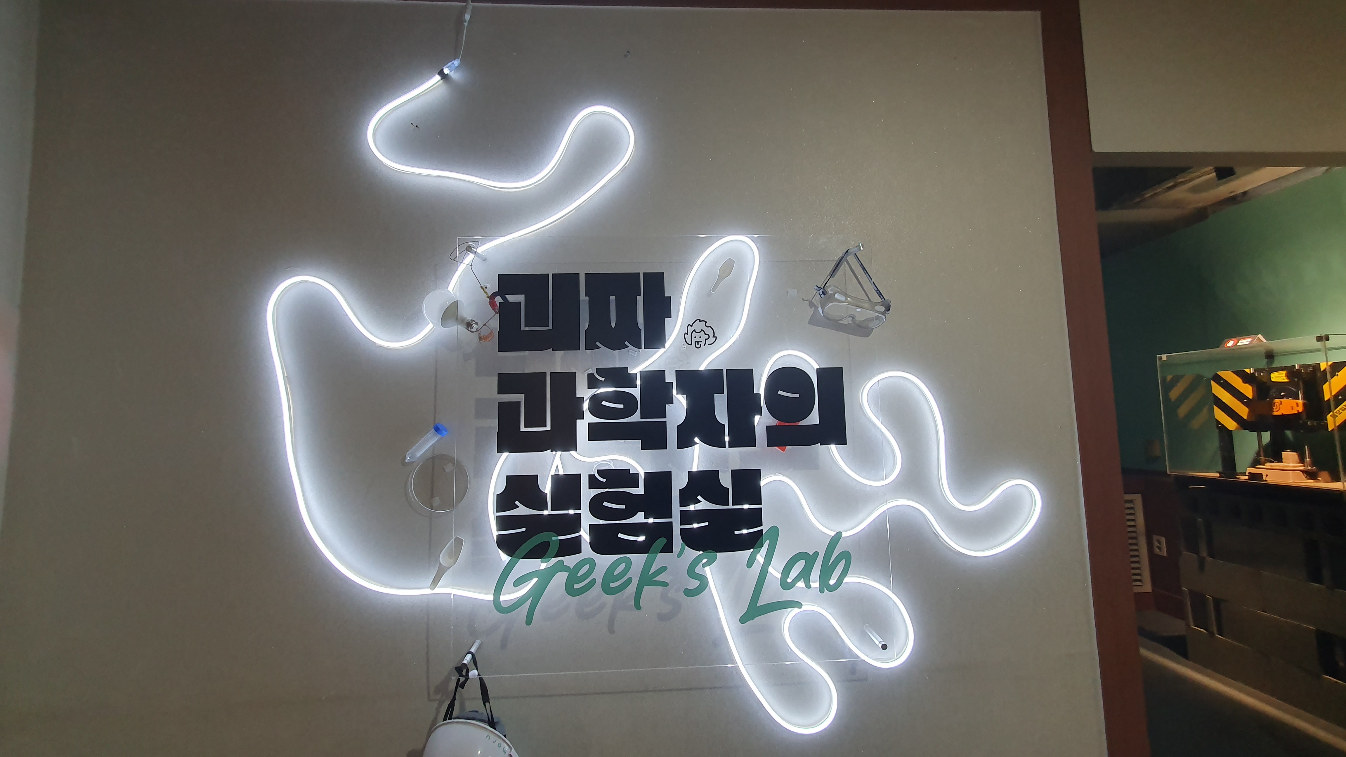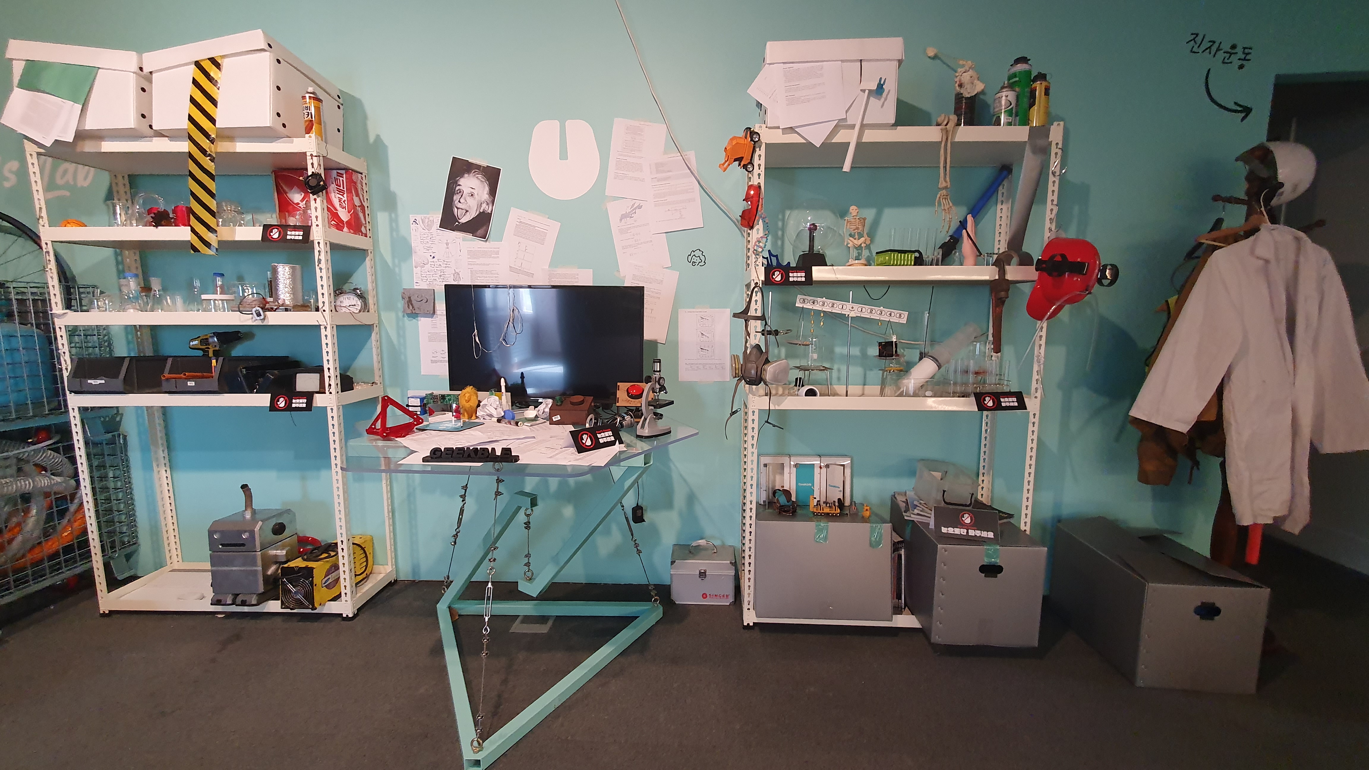 2023.09.08/ #APAP7 #안양공공예술프르젝트 #엣검역원 #긱블/ 요즘 초등학생들 사이에서 아주 인기라는 긱블의 작품. <괴짜과학자 실험실>에는 한쪽 눈만 뜨고 혀를 내밀고 있는 아주 커다란 얼굴이 있다. 긱블의 <AI 메이커>이다. 긱블은 과학 교육 회사, 과학공학적인 메이킹을 하는 100만 유튜버들이다. 과짜과학자 실혐실에는 신기한것들로 가특차있다.