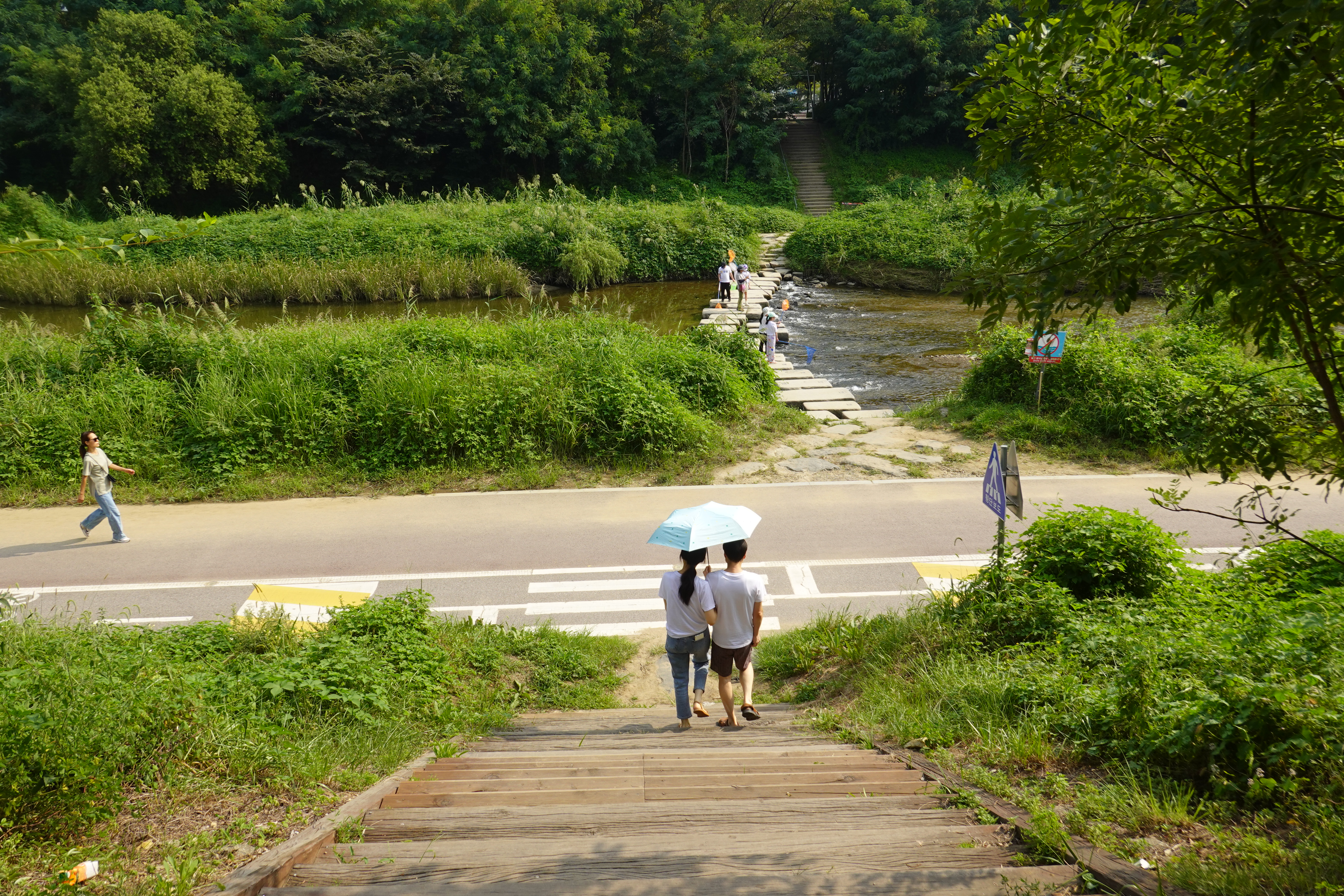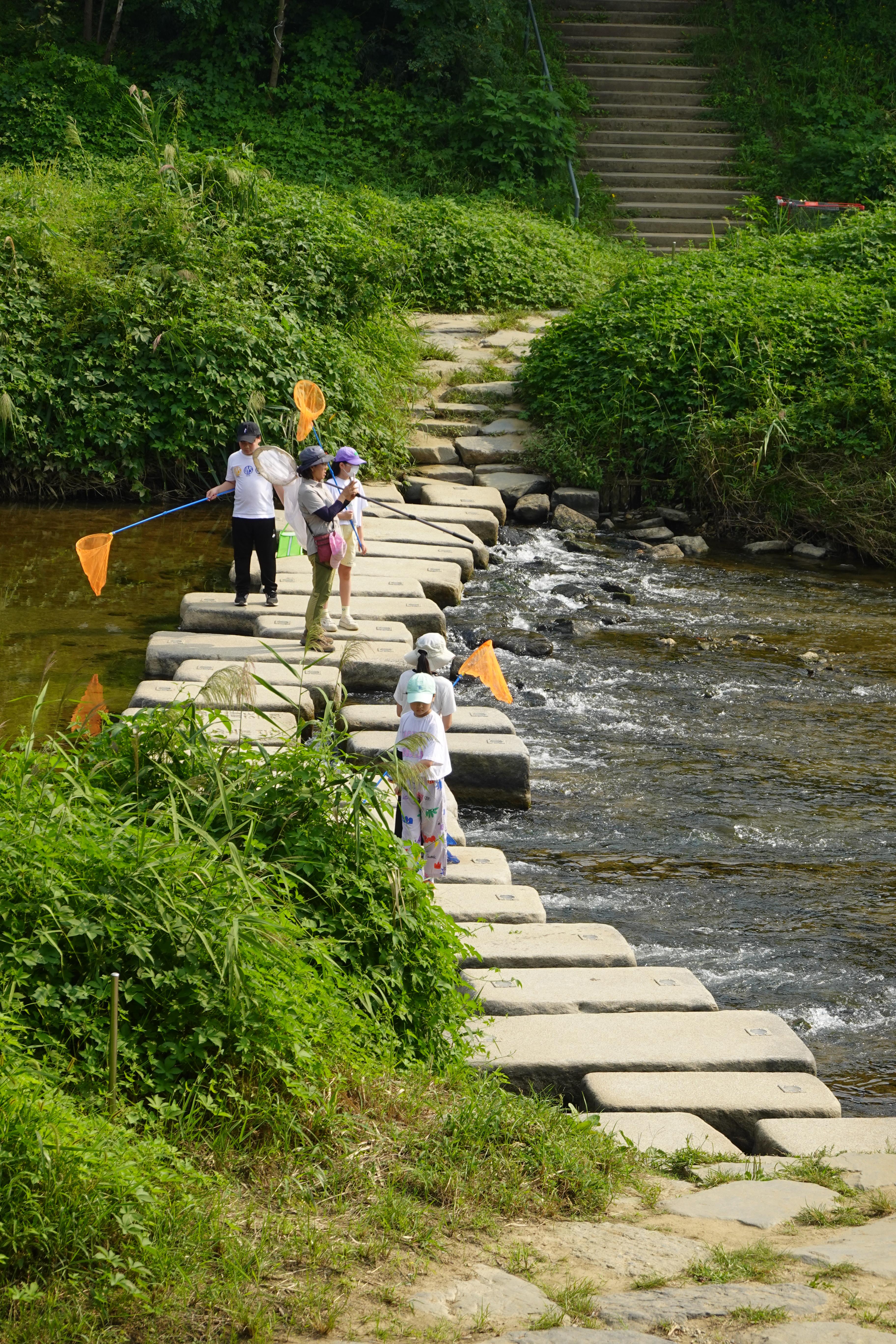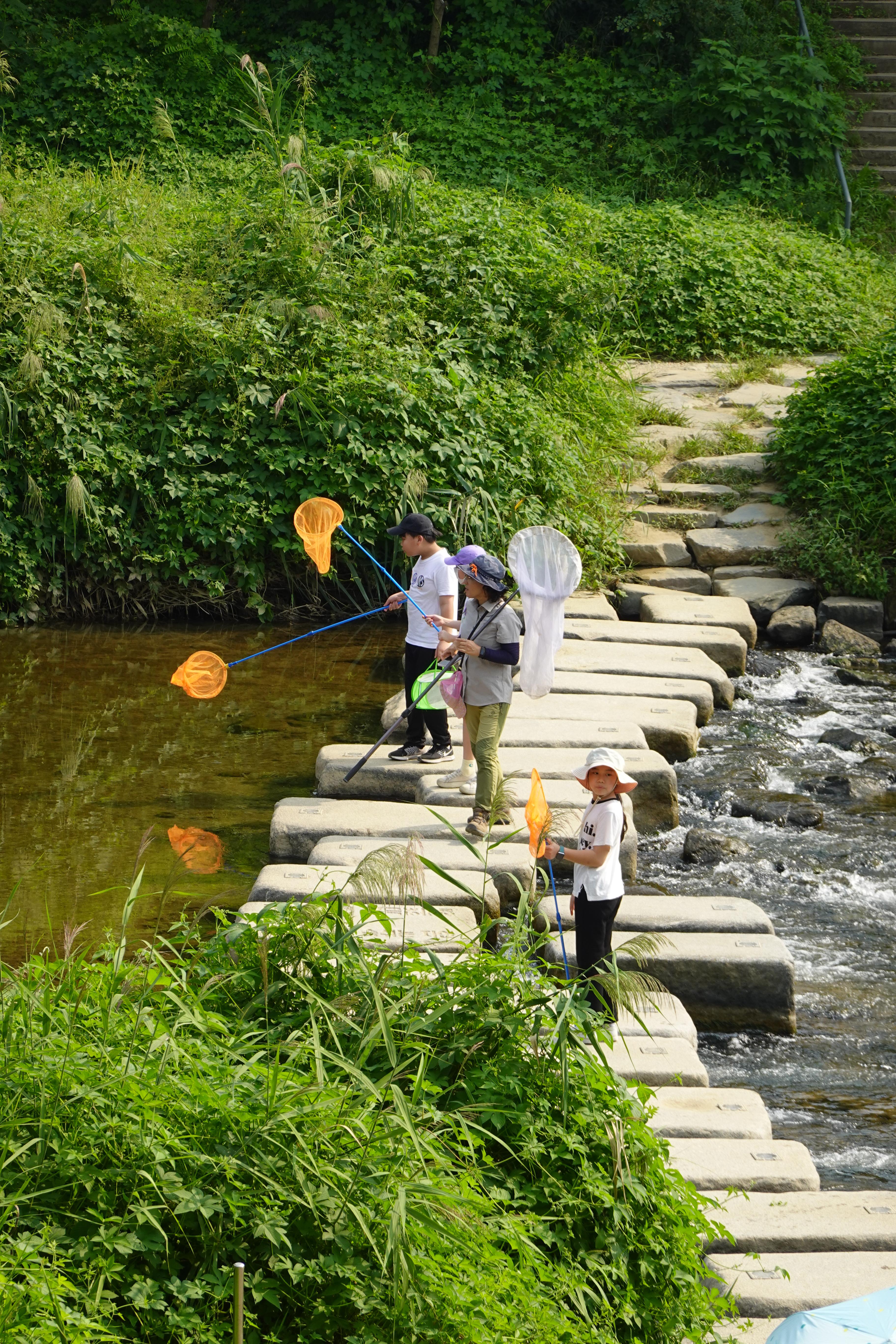 2023.09.10/ #도시 #생태 #안양 #학의천 안양 학운공원앞 학의천 돌다리에서 만난 잠자리채를 든 아이들과 선생님. 어디 학교 학생들인지 물어보니 안양남초란다. 한 아이는 채집한 잠자리와 나비를 보여주면서 신이났다. 침팬지의 대모 제인 구달 박사를 아는 사람 물어보니 여학생 한명이 안다고 답한다. 제인 구달 박사가 2004년 안양을 방문했고 생태하천으로 회복한 학의천을 찾아 너희들이 서있는 돌다리에서 물고기도 방사했다고 하니 아이들도 선생님도 깜짝 놀란다.