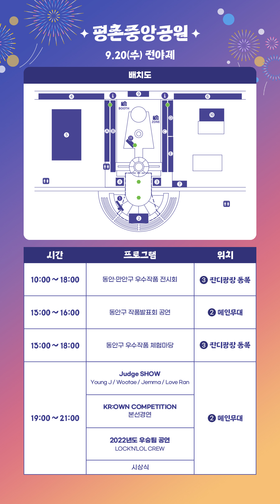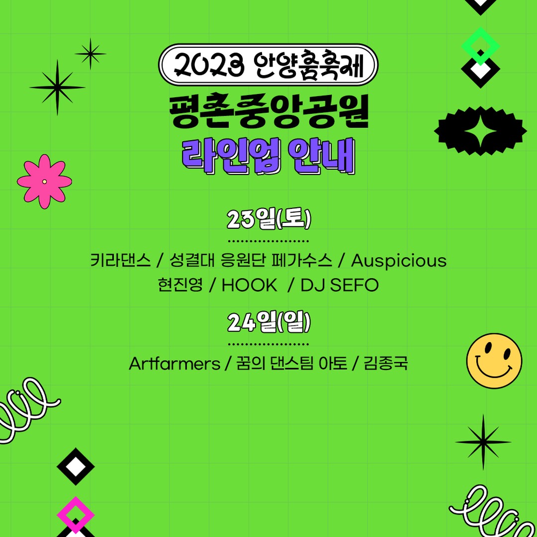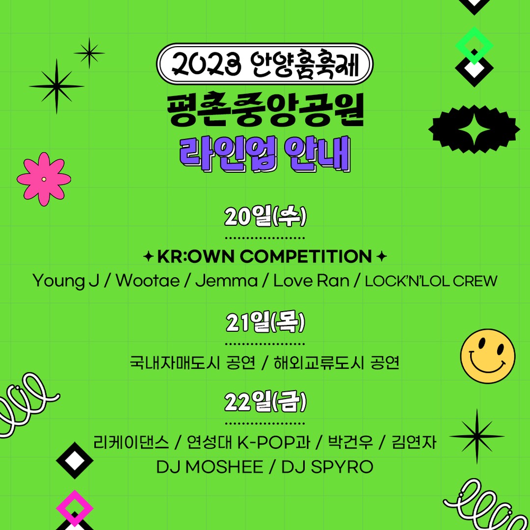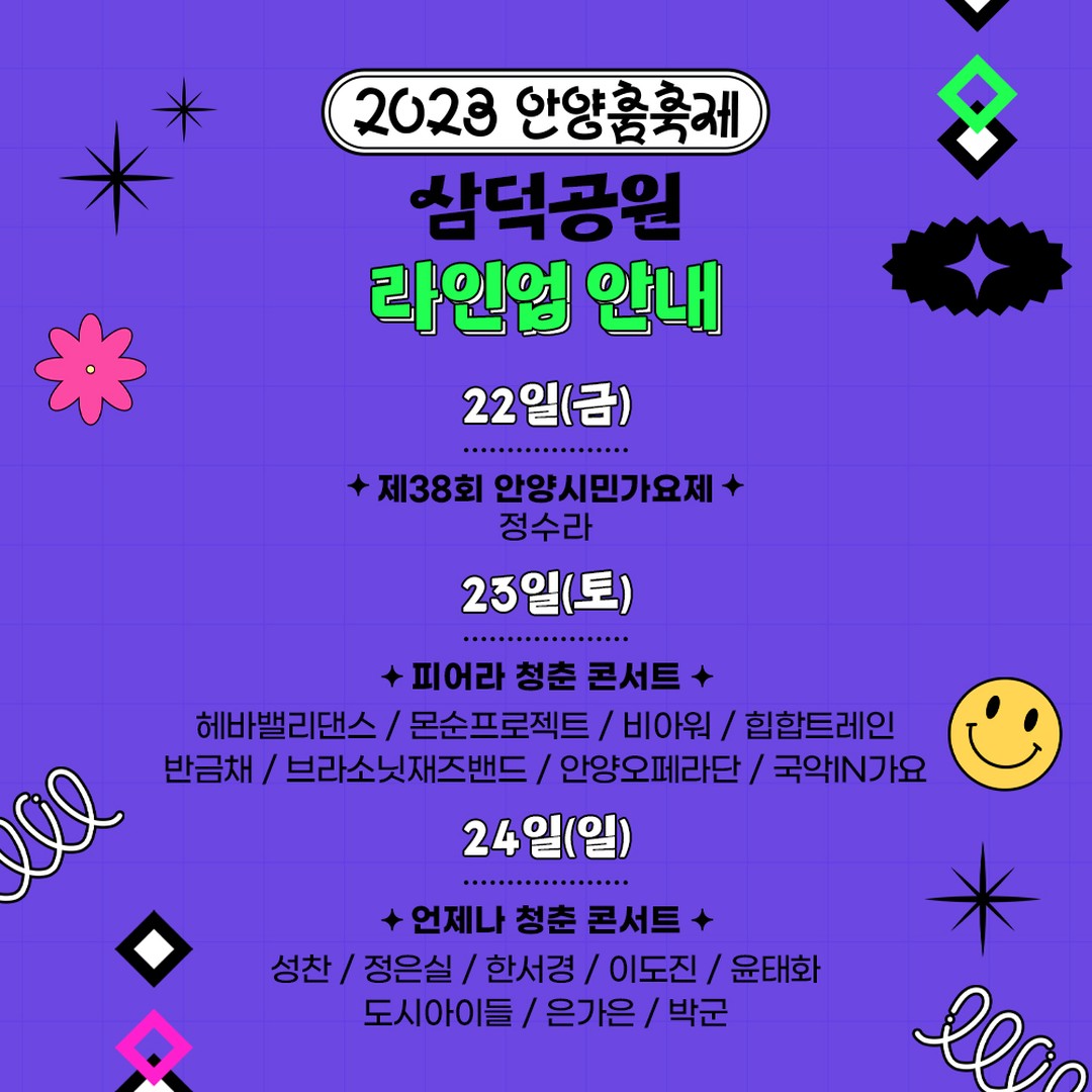 평촌중앙공원에서는 K-POP 댄스대회'크라운컴페티션'의 전년도 우승팀(LOCKNLOL CREW) 축하공연(20일), 김연자(22일), 현진영(23일), 안무가 아이키가 속한 댄스크루 HOOK(23일), 김종국(24일) 등의 공연이 열리고, 삼덕공원에서는 제38회 안양시민가요제(22일)와 정수라(22일), 박군(24일), 은가은(24일) 등의 공연이 펼쳐질 예정이다.
