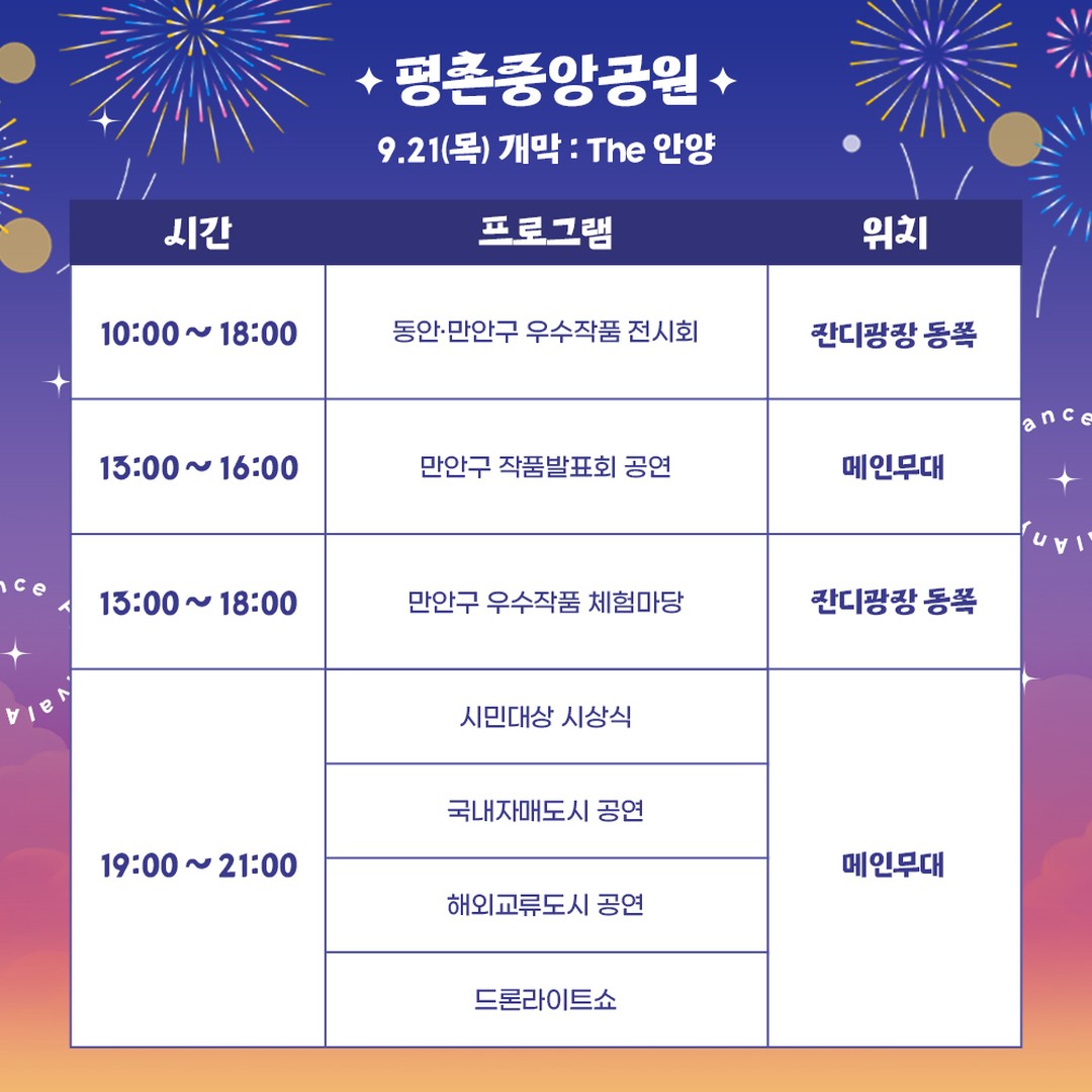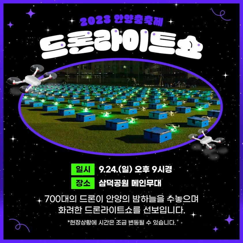 축제 기간에 드론 라이트쇼도 펼쳐진다. 평촌중앙공원(21일)에서는 '춤'을 주제로, 삼덕공원(24일)에서는 '추석'을 주제로 21시에 드론 700대가 안양 밤하늘을 수놓을 예정이다.