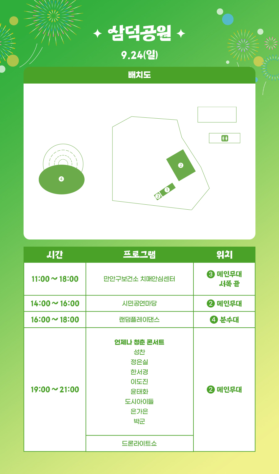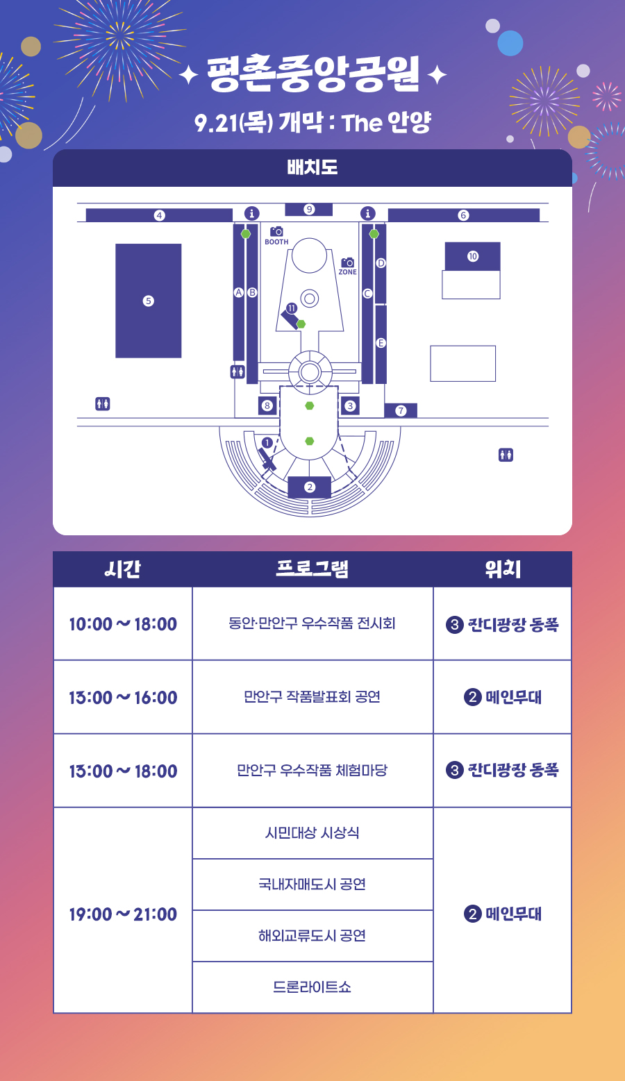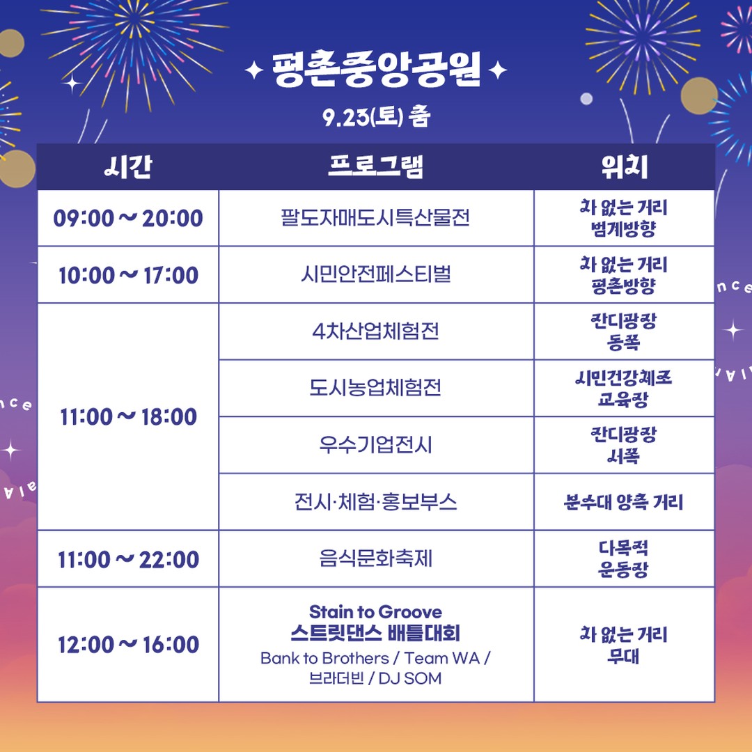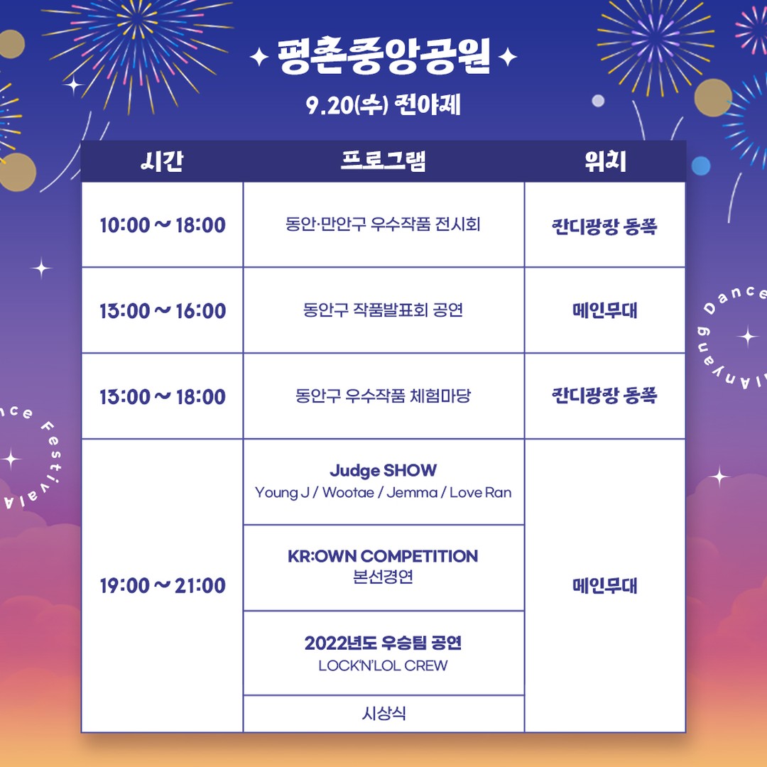 평촌중앙공원에서는 K-POP 댄스대회'크라운컴페티션'의 전년도 우승팀(LOCKNLOL CREW) 축하공연(20일), 김연자(22일), 현진영(23일), 안무가 아이키가 속한 댄스크루 HOOK(23일), 김종국(24일) 등의 공연이 열리고, 삼덕공원에서는 제38회 안양시민가요제(22일)와 정수라(22일), 박군(24일), 은가은(24일) 등의 공연이 펼쳐질 예정이다.