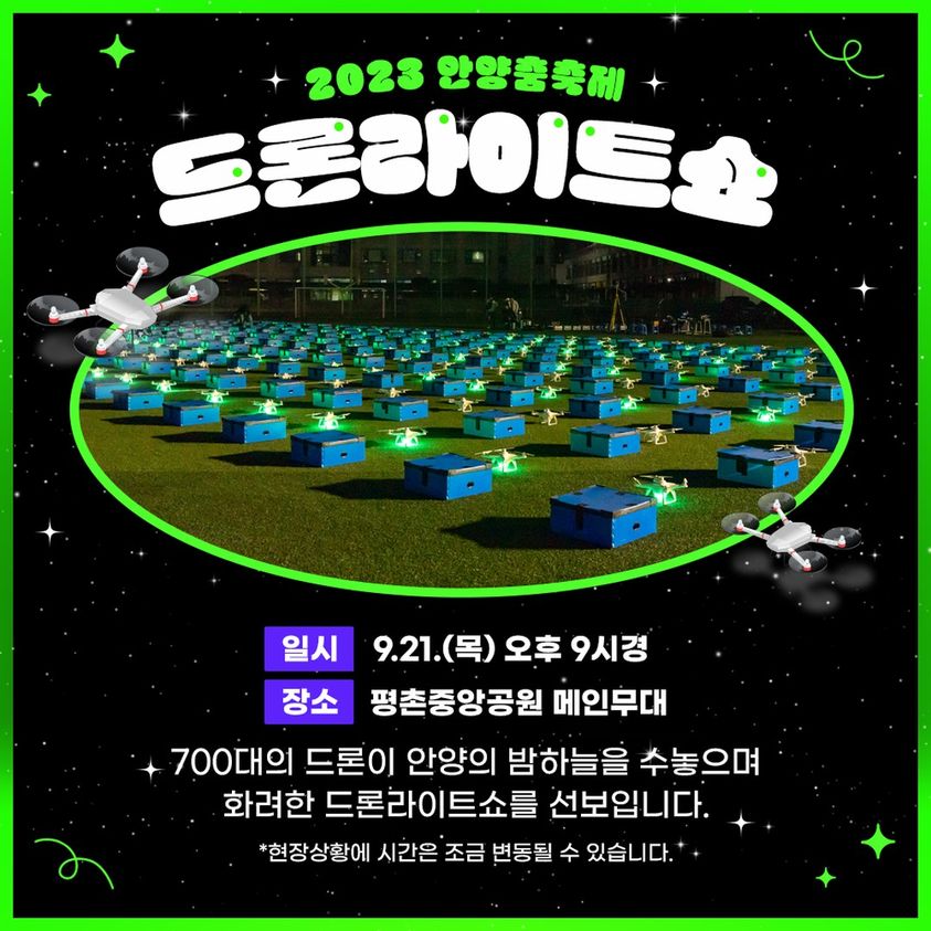 축제 기간에 드론 라이트쇼도 펼쳐진다. 평촌중앙공원(21일)에서는 '춤'을 주제로, 삼덕공원(24일)에서는 '추석'을 주제로 21시에 드론 700대가 안양 밤하늘을 수놓을 예정이다.