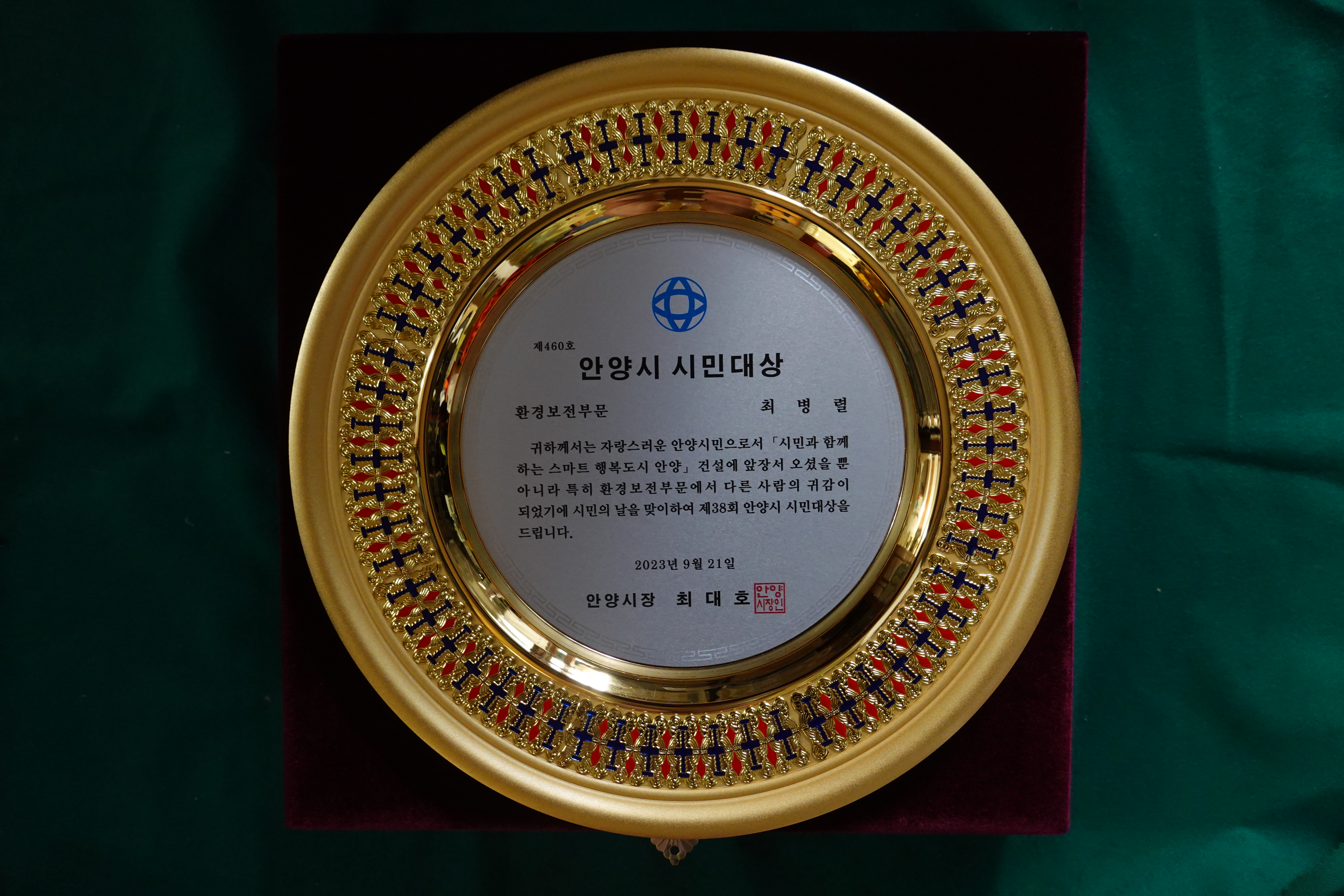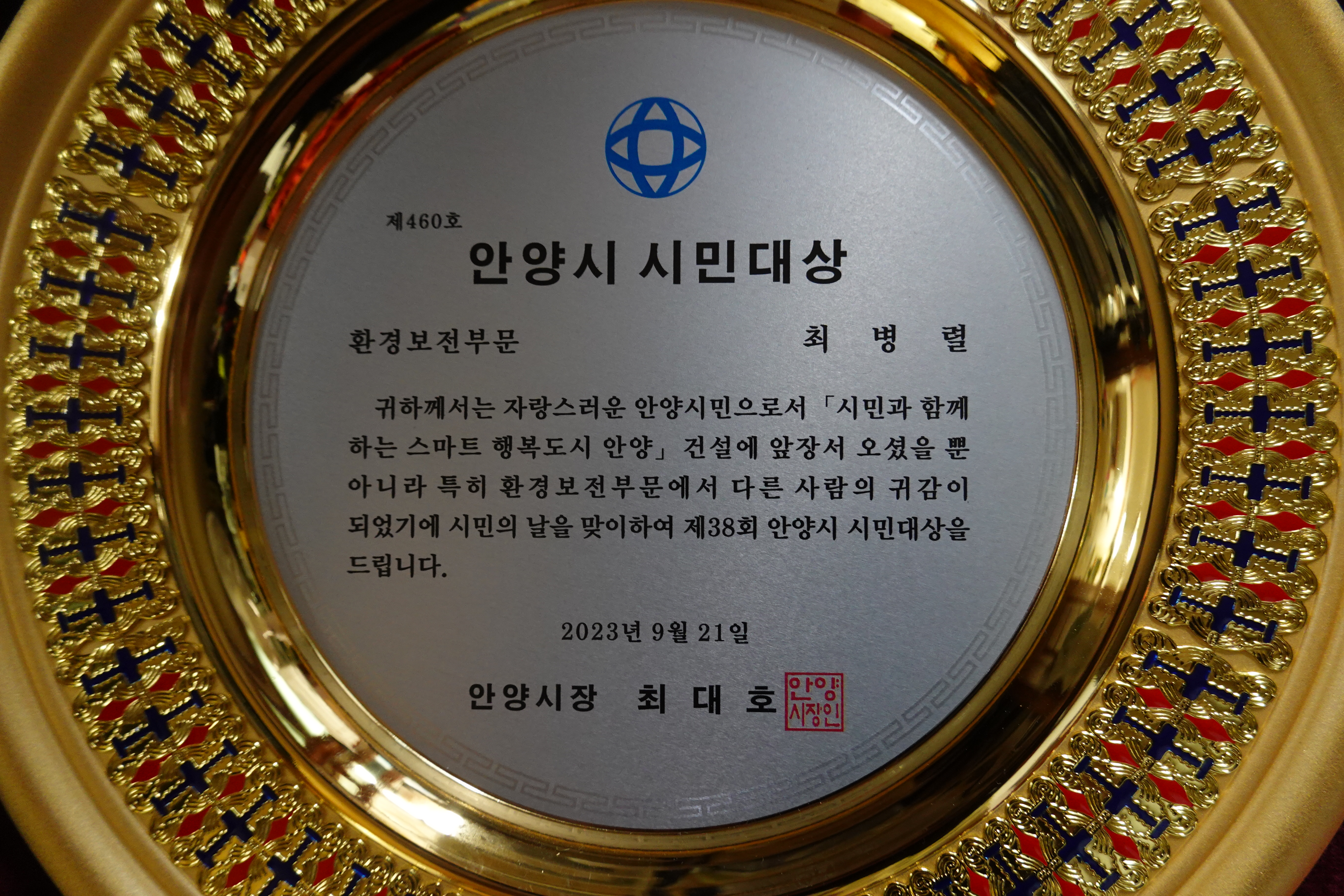 안양시민대상은 지역 발전을 위해 사회 각 분야에서 근면 성실하게 노력하고 봉사하는 등 뚜렷한 공적이 있는 시민에게 수여하는 상이다.