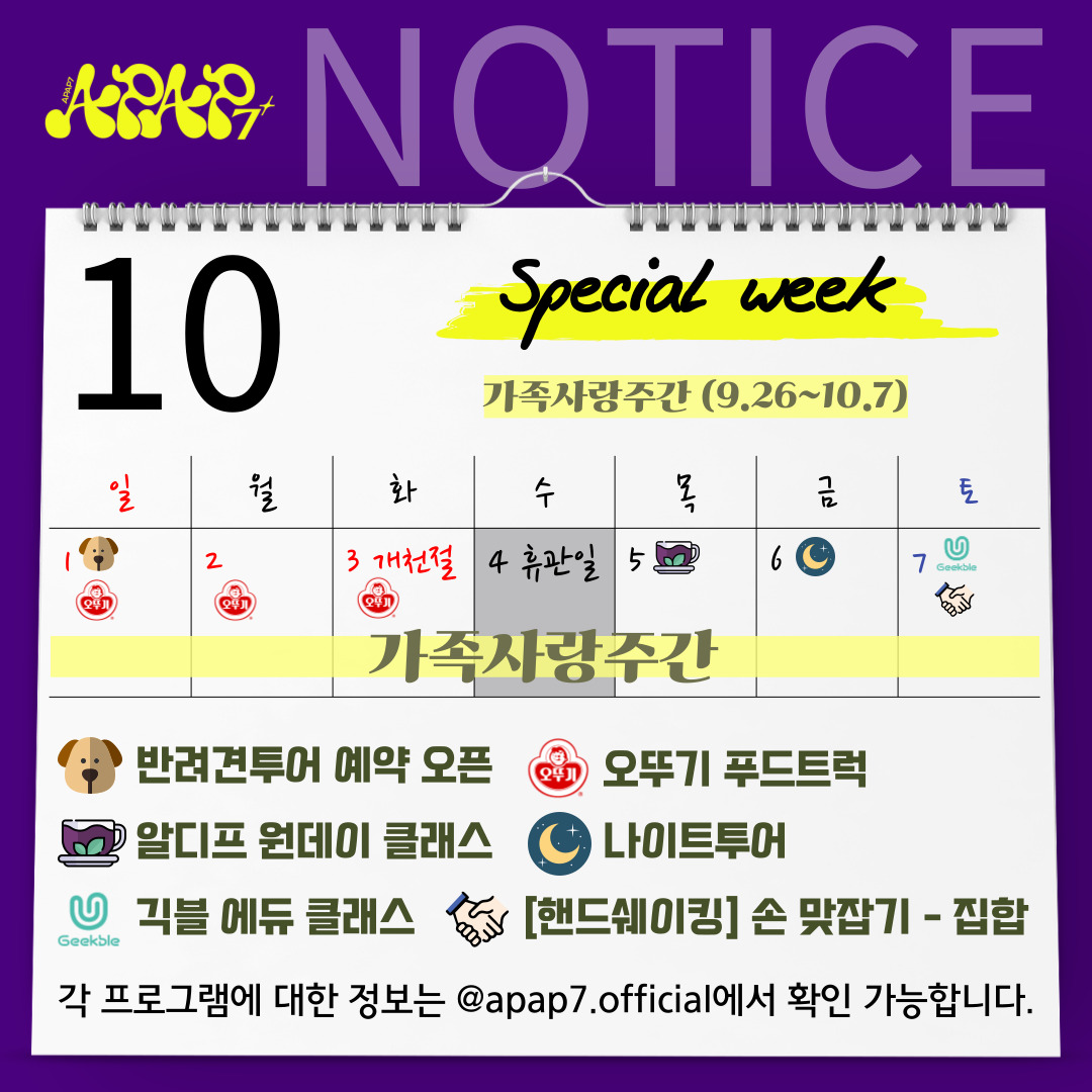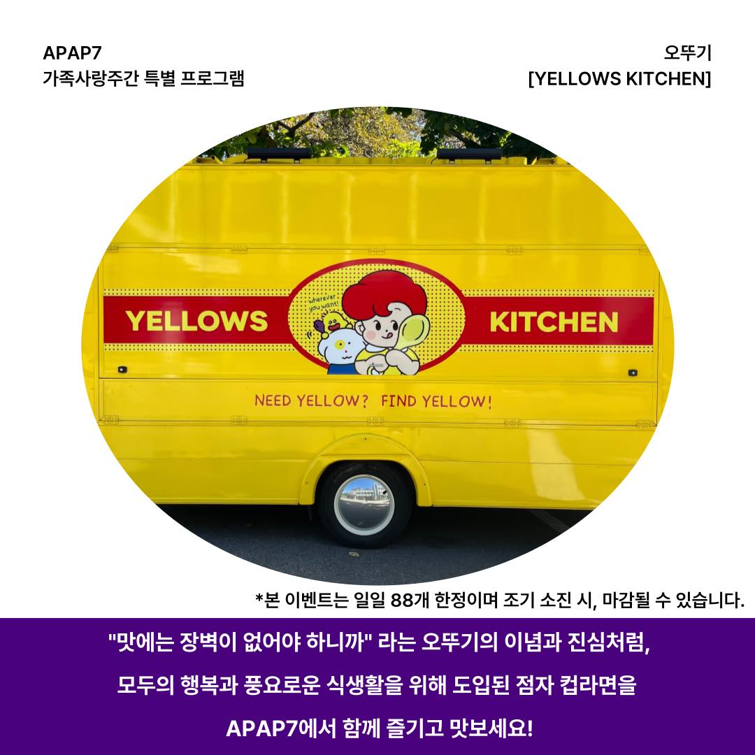 APAP7에서 가족사랑주간을 맞아 안양지역 기업인 오뚜기와 함께하는 특별 프로그램을 10월 1일부터 3일까지 진행중으로 관람객을 대상으로 점자 표기로 제작된 오뚜기 컵라면을 무료 제공한다. 다만 본 이벤트는 일일 88개 한정이며 조기 소진 시, 마감될 수 있다.