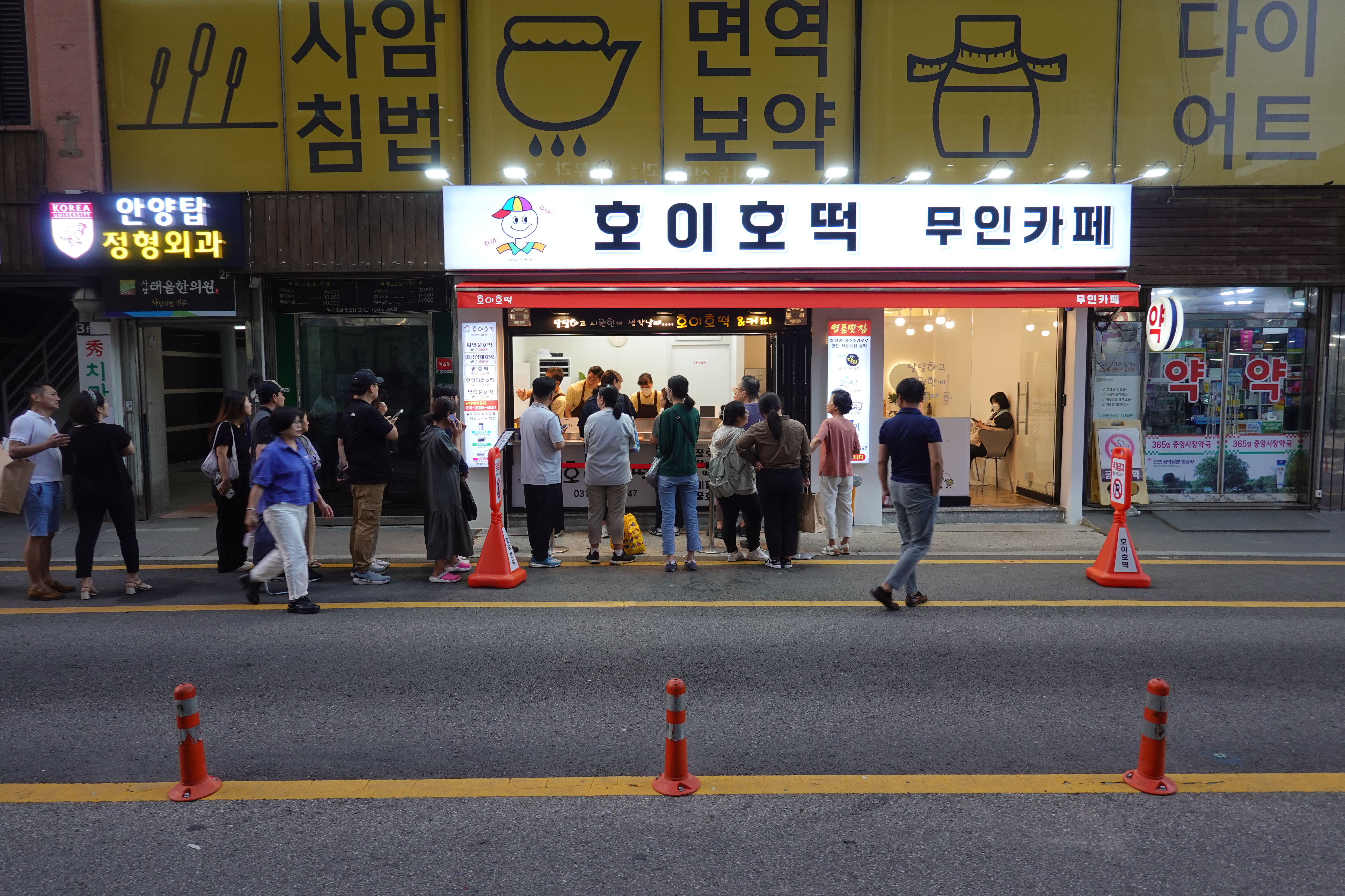 2023.09.28/ #도시기록 #호떡집 #중앙시장 #호이호떡/ 중앙시장 1문입구 노점으로 있던 호이호떡이 안양로 303번길 삼세약국앞에 점포를 임대해 이전했다. 노점상이 점포주가 됐다. 무인카페까지 운영영하는 호떡집앞에 긴줄이 서기는 예나 지금이나 마찬가지로 인기.