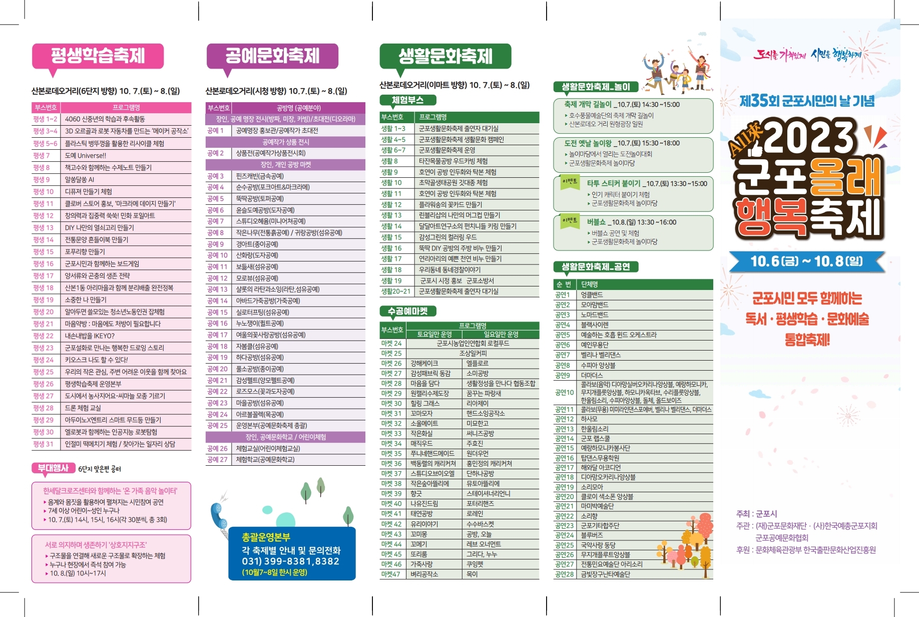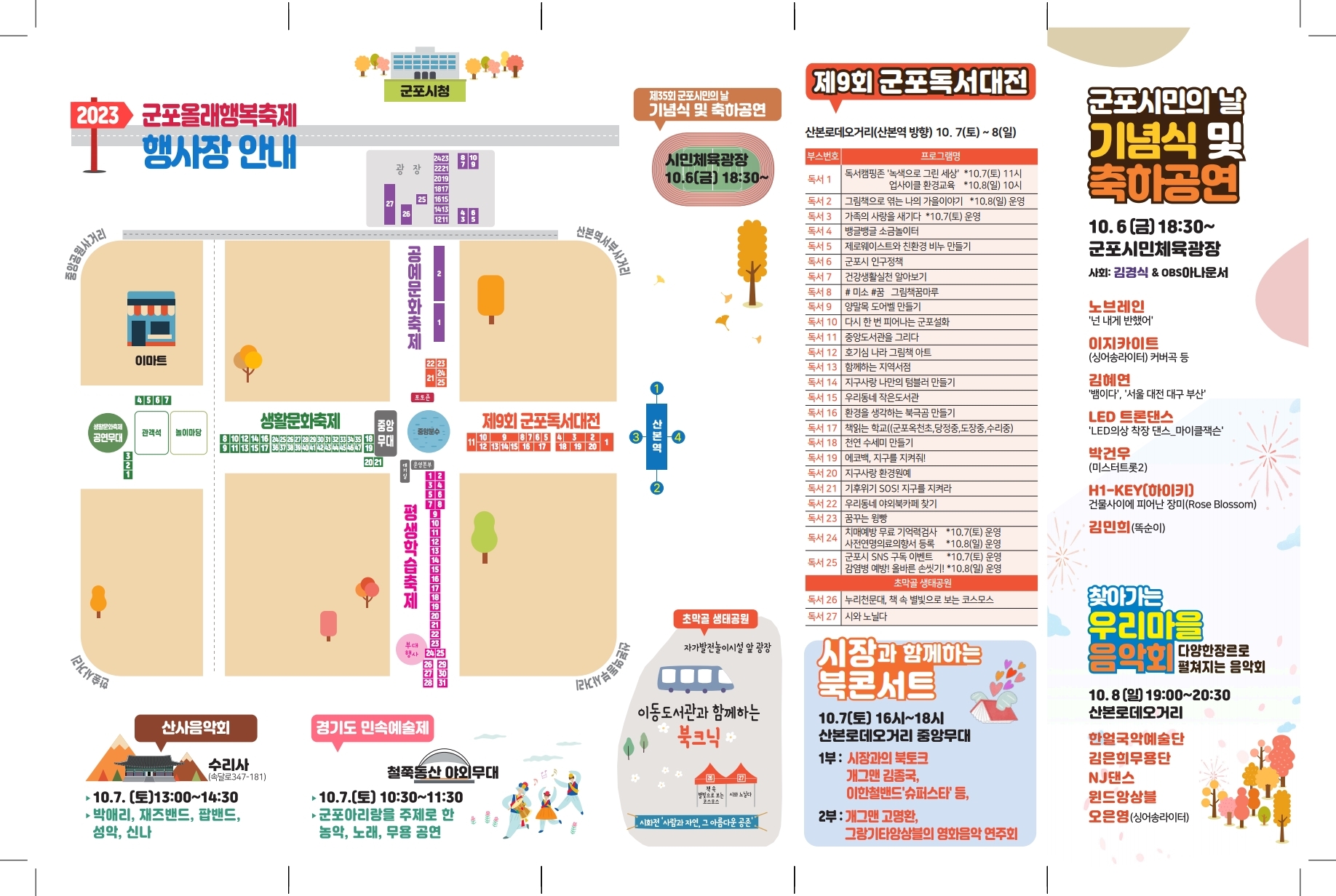 다음 날인 7일에는 수리사에서 가을의 정취를 느끼고 힐링의 시간을 만끽할 수 있는 '산사음악회'가 열리고, 산본 로데오거리에선 분수대를 중심으로 산본역 방향으로 '책으로 품은 세상'이라는 슬로건 아래 학술강연, 북콘서트, 전시, 독서체험 등 '제9회 군포독서대전'이 펼쳐진다. 또 6단지 세종아파트 방향 거리에선 평생학습기관 및 학습동아리와 함께 시민체험공연, 체험활동 등으로 학습을 공유하고 나누는 '제10회 평생학습축제'가 진행되고 각 분야의 공연과 체험 놀이마당이 운영되는 '생활문화축제'도 함께 어울린다.