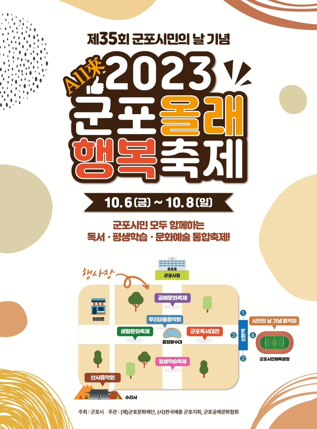 제35회 시민의 날을 기념해 열리는 이번 축제는 기념음악회를 비롯 제9회 군포독서대전, 평생학습축제, 생활문화축제, 공예문화축제, 찾아가는 우리마을 음악회 등 다양한 볼거리와 체험행사 등이 있는 가을축제들을 통합해 열리는 것이 특징이다.