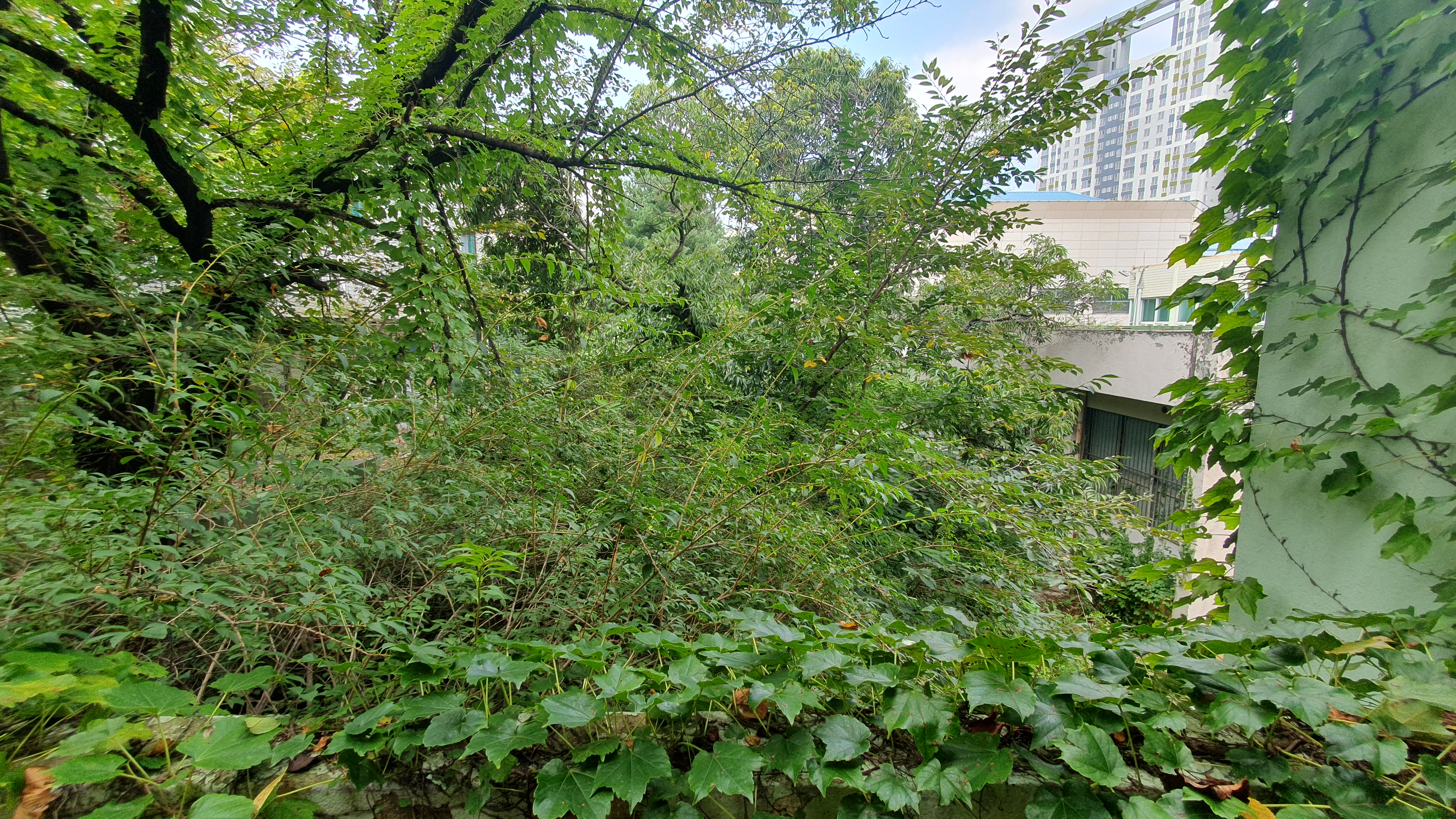 2023.09.29/ #도시기록 #안양6동 #옛검역원 #생태/ 안양6동에 자리한 구 농림축산검역본부(엣 국립수의과학검역원)이 2016년 경북 김천으로 이전한후 안양시가 매입하면서 활용방안을 찾기까지 울타리가 쳐져 출입금지구역이 된 검역원 뒷쪽 공간. 지난 6년간 사람이 발길이 끊겼던 공간을 자연이 점령하면서 점차 원시림으로 변하는 생태계의 변화를 볼수 있다. 검역원 뒷뜰에는 한때 수리산에서 담장을 넘어 들어온 것으로 추정되는 고라니 가족 한쌍이 새끼를 낳고 네마리가 되어 살다가 2018년 11월 세마리(포획과정에서 한마리는 죽음)가 포획되어 다시 수리산에 방사되기도 했다.