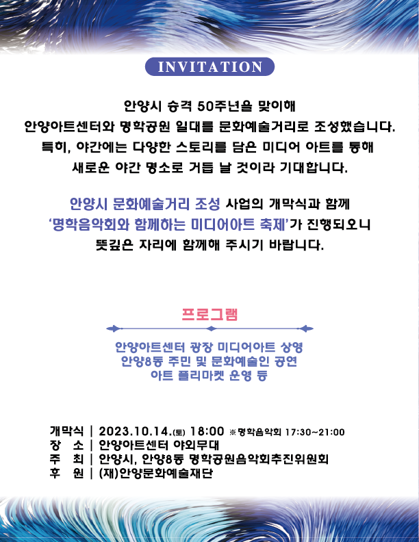 안양 시 승격 50주년 기념 명학음악회와 함께하는 미디어아트 축제가 먕학공원음악회 추진위원회 주최로 오는 14일 오후5시30분부터 안양아트센터 야외무대와 명학공원 일원에서 열린다.