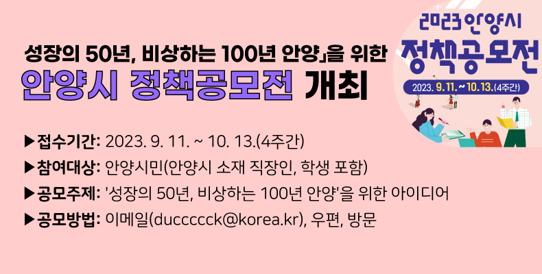 안양시가 시 승격 50주년을 맞아 성장의 50년, 비상하는 100년 안양을 위한 '2023년 안양시 정책공모전' 개최한다.