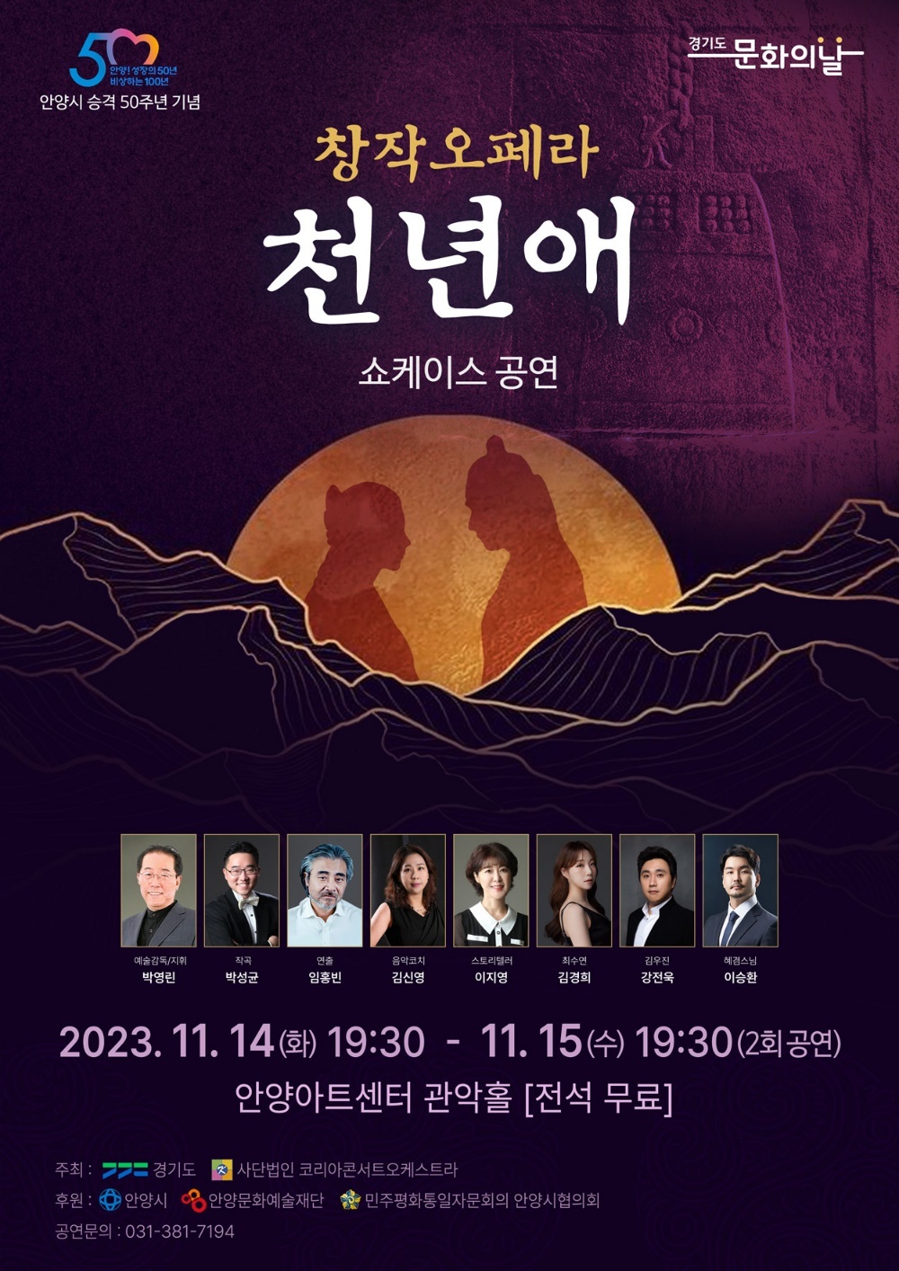동아시아 유일의 마애종이 가진 문화적 가치를 알리고, 명소로 만들기 위한 노력의 일환으로 제작한 창작오페라 '천년애' 쇼케이스 공연이 오는 11월14일과 15일 이틀간 안양아트센터 관악홀에서 펼쳐진다