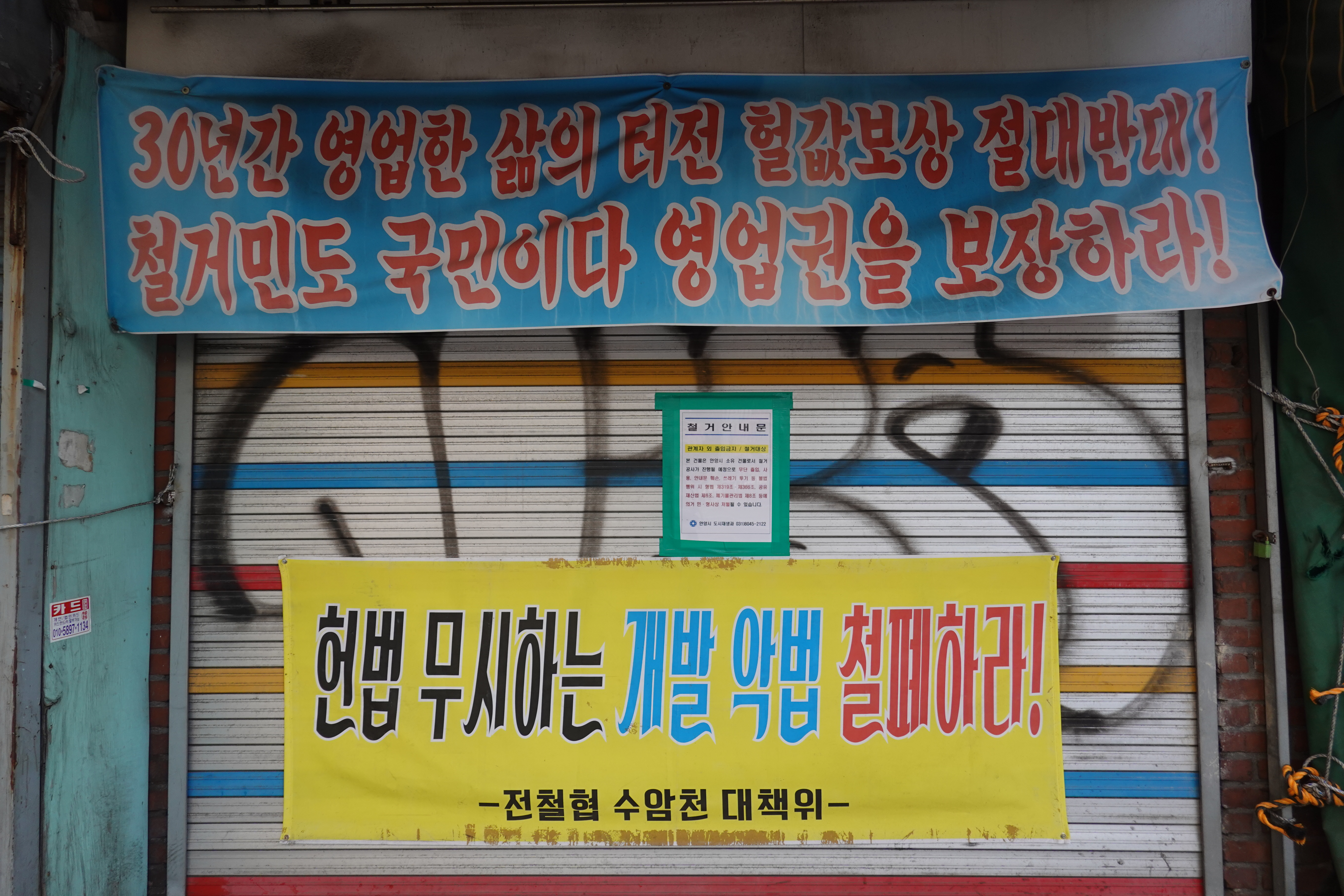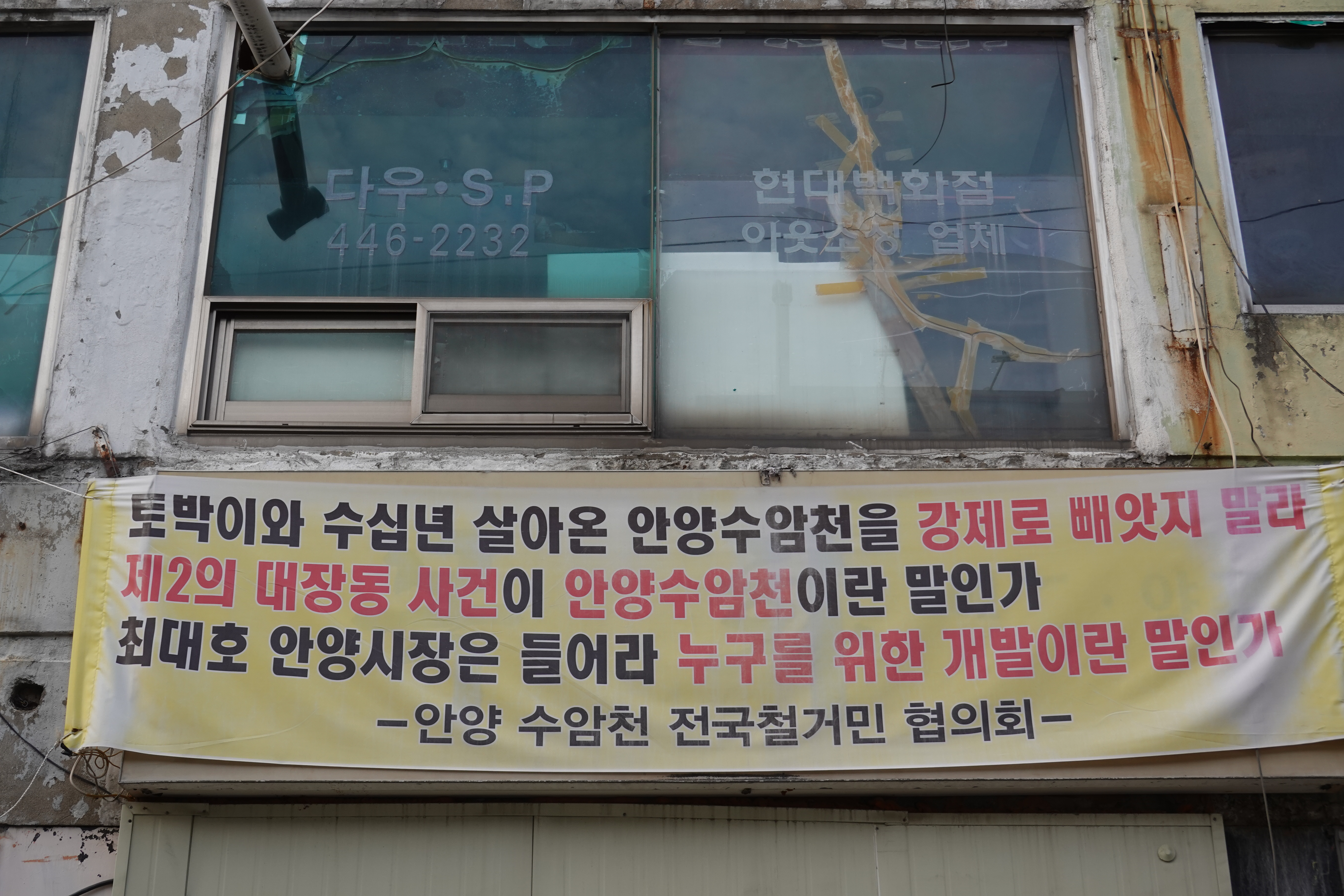 2023.10.18/ #도시기록 #안양 #안양역공구상가 #강제수용 #반발/ 수암천 지하저류조 조성으로 건물과 토지에 대한 강제수용으로 반발과 아룸과 진통이 있는 안양역앞 공구상가의 모습.