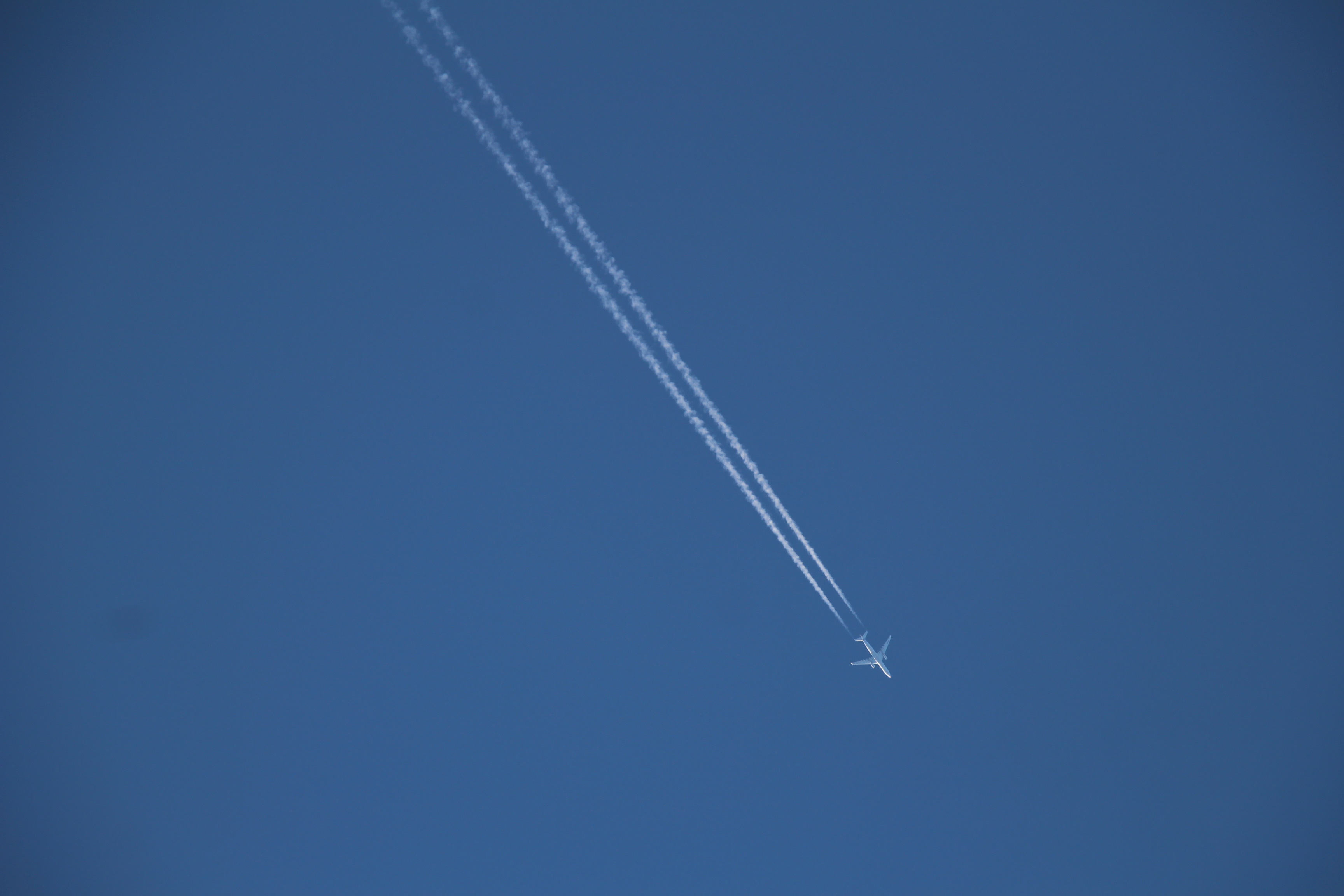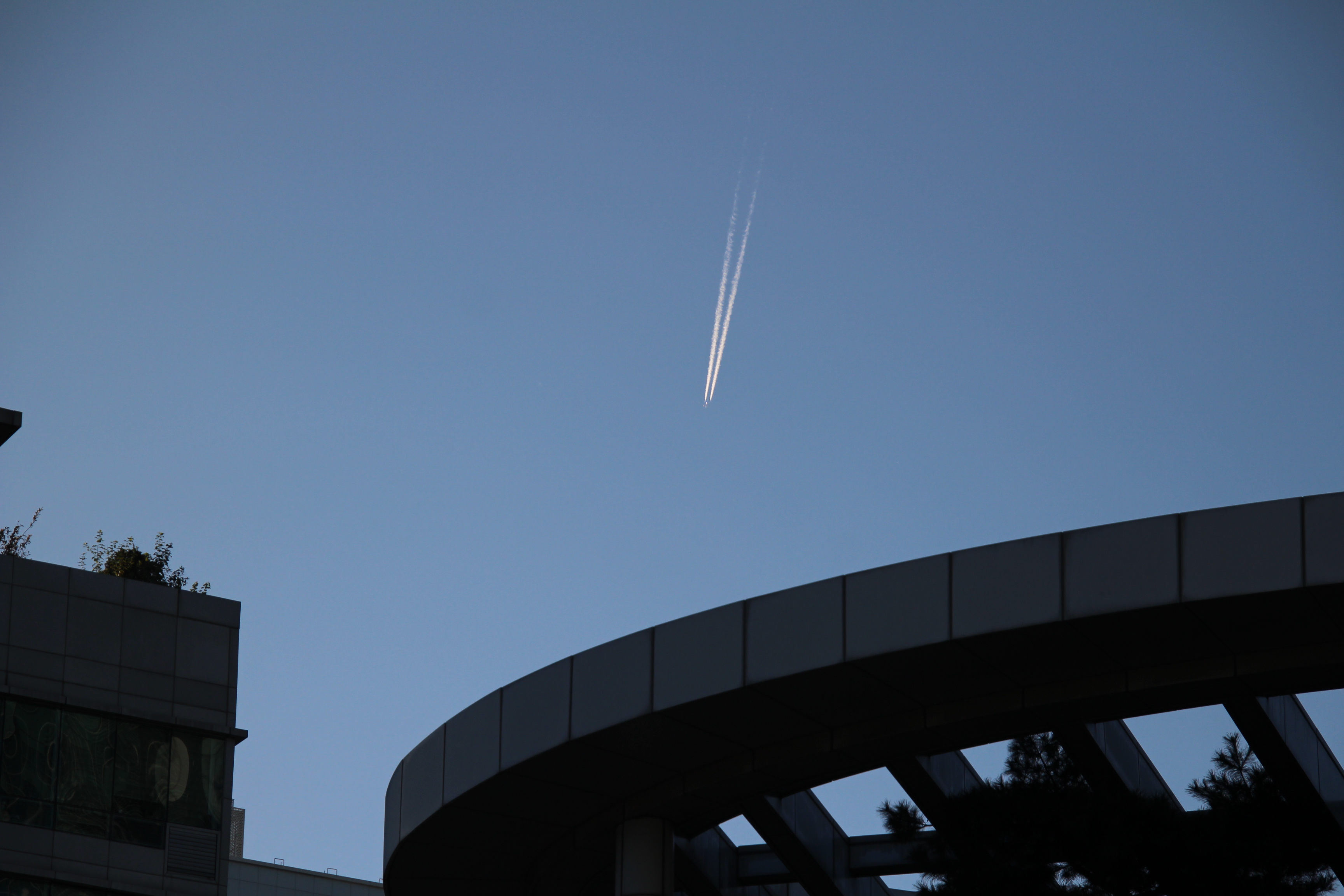 2023.10.21/#도시기록/ #도시기록 #비행기 #고공 #비행운/ 하얀 분필로 선을 듯 높은 하늘을 날아가는 비행기들. 고도를 블때 한반도를 통과하는 외국 비행기인듯. 안양 하늘은 수많은 비행기들이 지나다니는 비행기길(항로)이다.