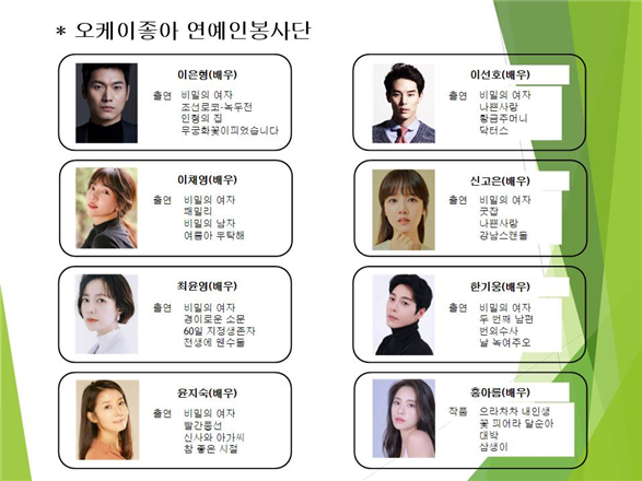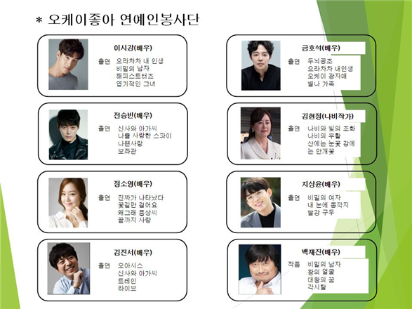 행사관계자에 따르면 오케이좋아 연예인봉사단은 KBS드라마 [신사와아가씨] 출연진이 오케이좋아 연예인봉사단을 창단하고 첫 행사로 안양을 찾아와 지난달 6월8일 안양아트센터 야외광장에서 연예인 공연과 함께 안양의 어르신 500여분께 사랑의 짜장 나눔 행사를 실시한바 있어 이번 10월 행사가 안양에서의 두번째 봉사활동이다.