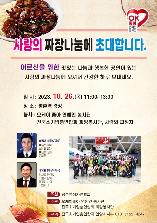 평촌역상가연합회가 주최하고 오케이좋아 연예인붕사단과 전국소기업총연합회 희망봉사단이 주관하는 이날 행사는 사랑의 짜장차가 출동해 안양의 어르신 1004분께 사랑의 짜장나눔을 한다.