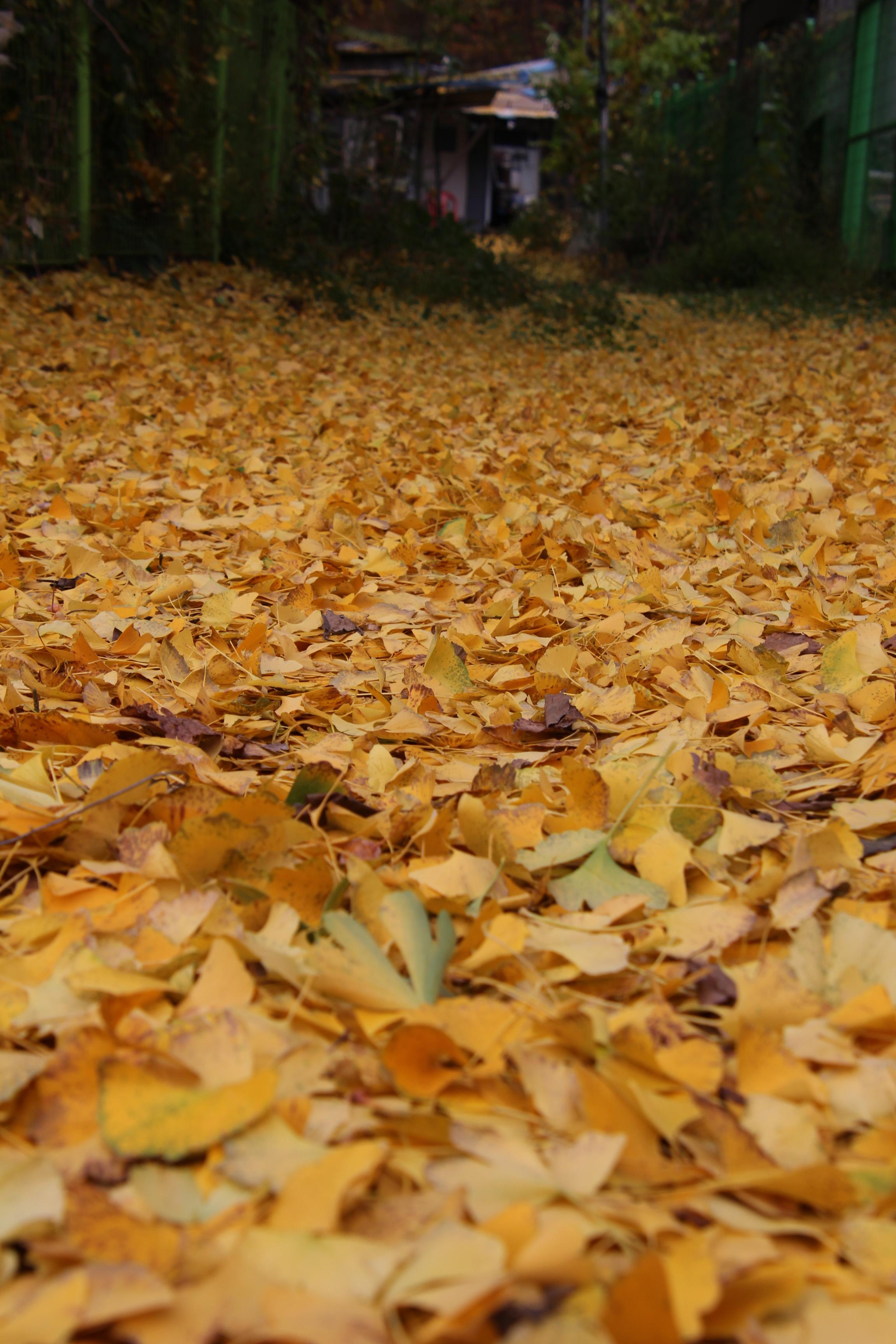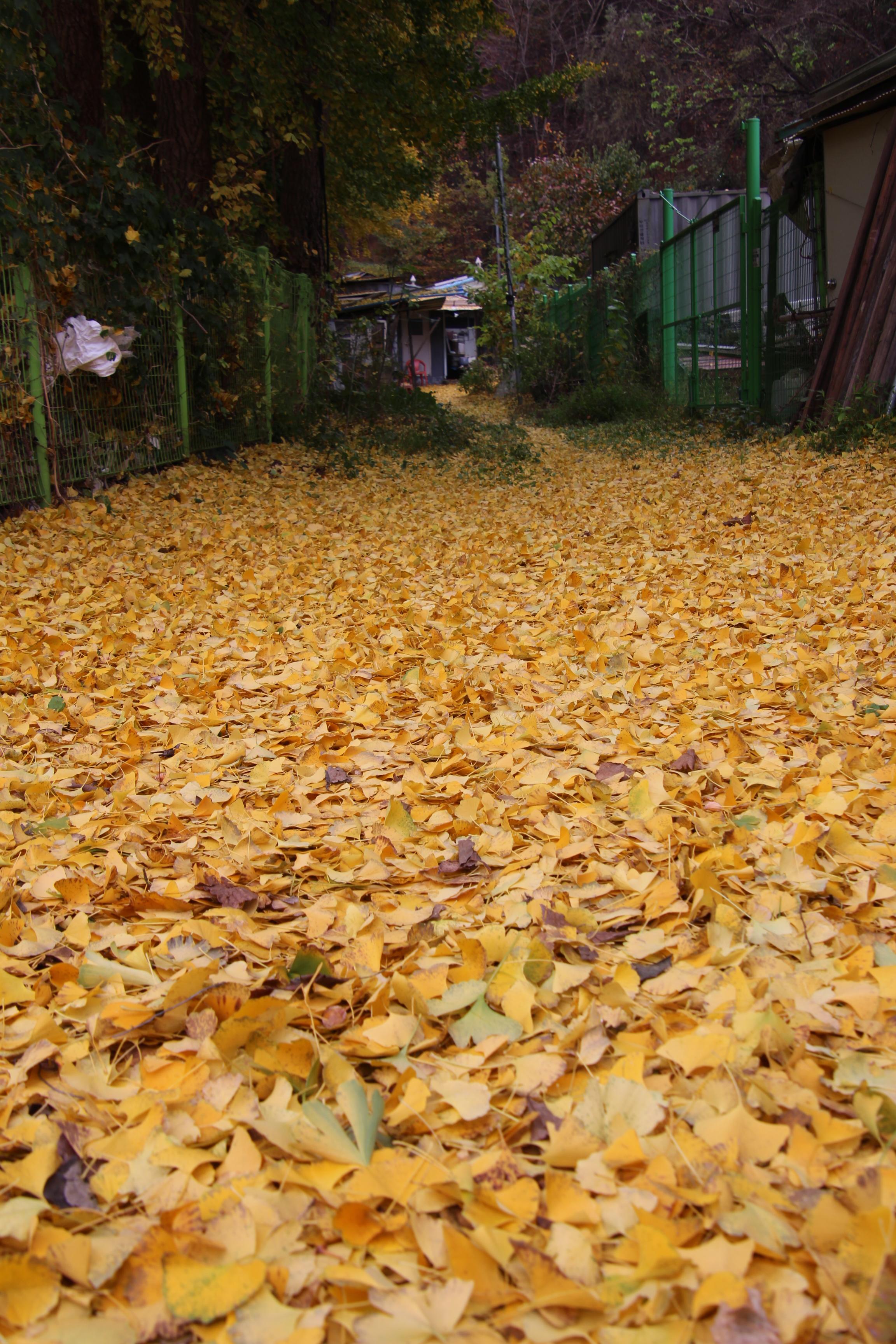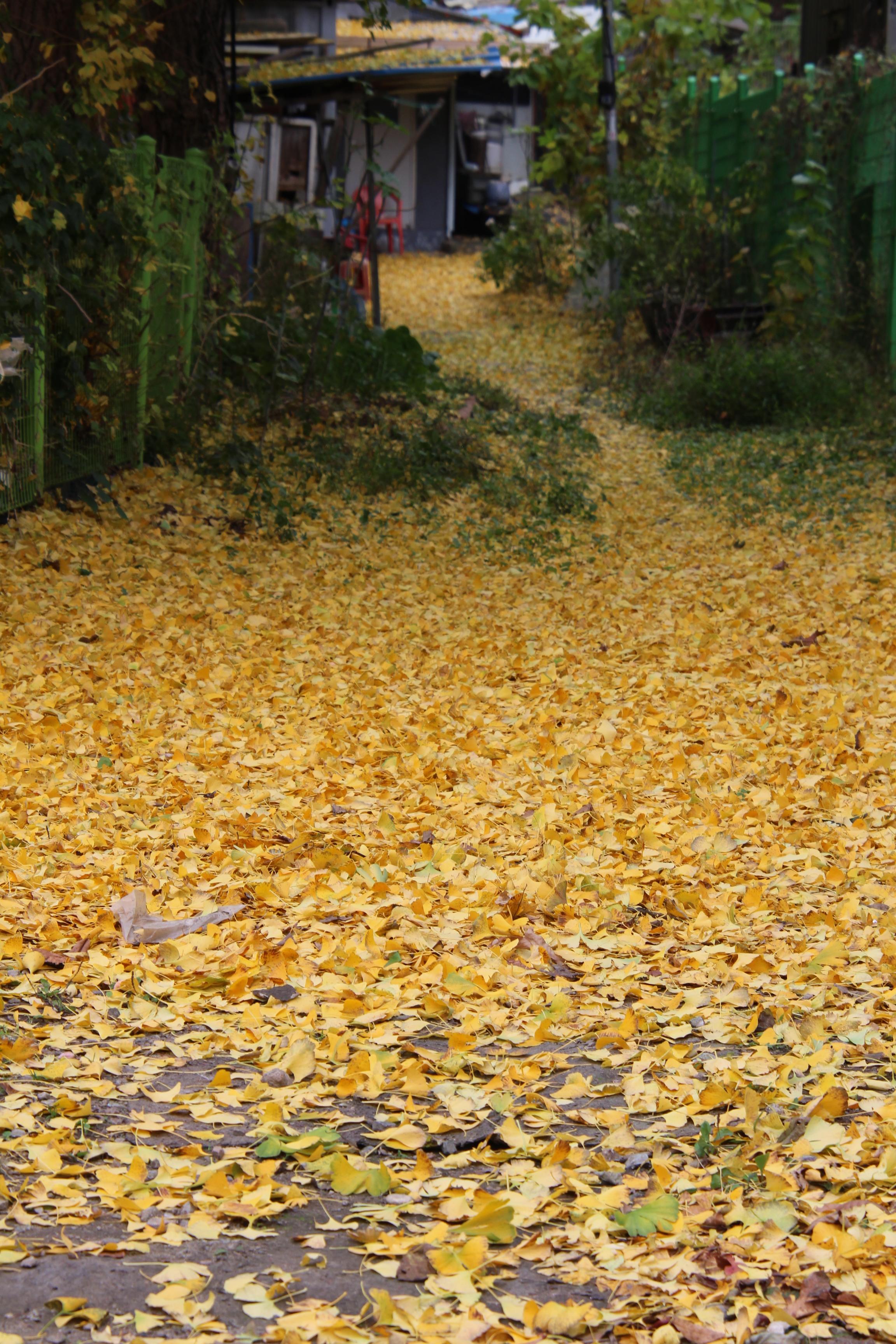 2023.11.03/ #도시기록 #안양 #은행나무/ 병목안시민공원 앞 하천 (수암천) 건너편 폐업한 한증막 뒷편 샛길. 은행나무에서 떨어진 은행잎이 쌓이며 노란 카페트가 깔린듯하다.