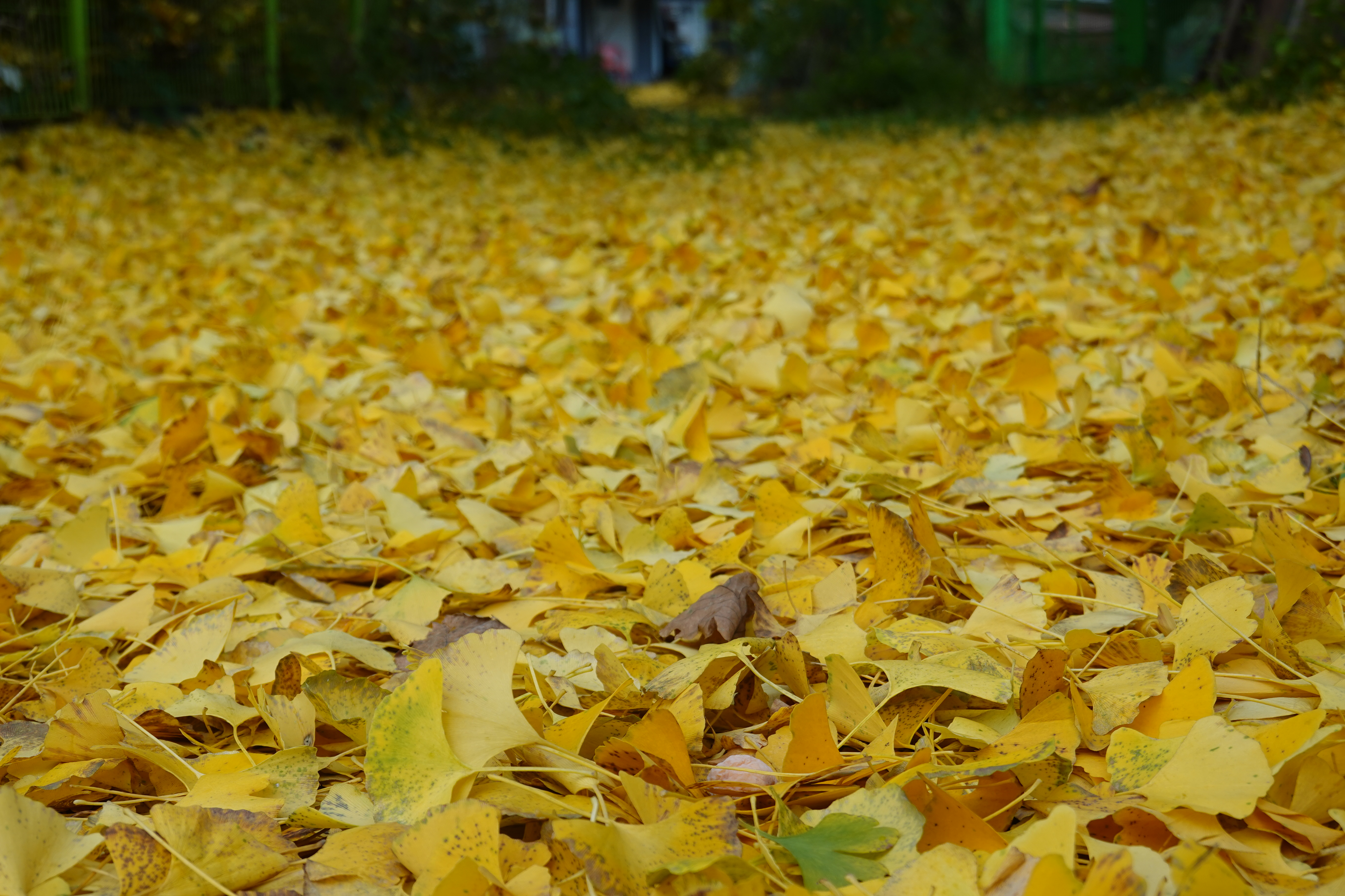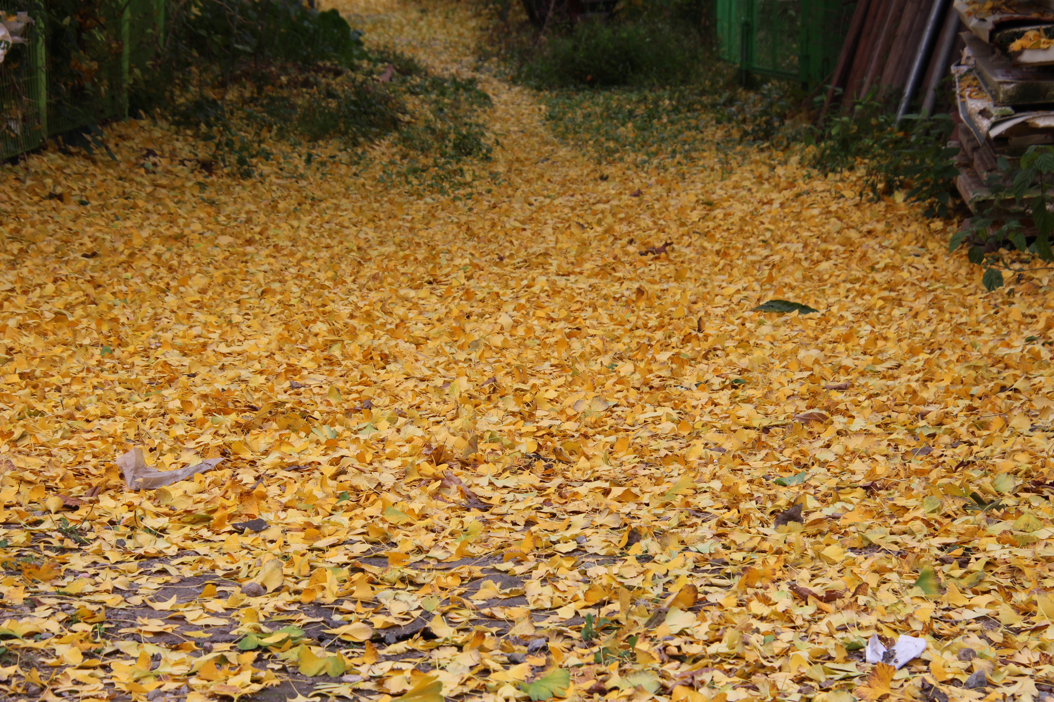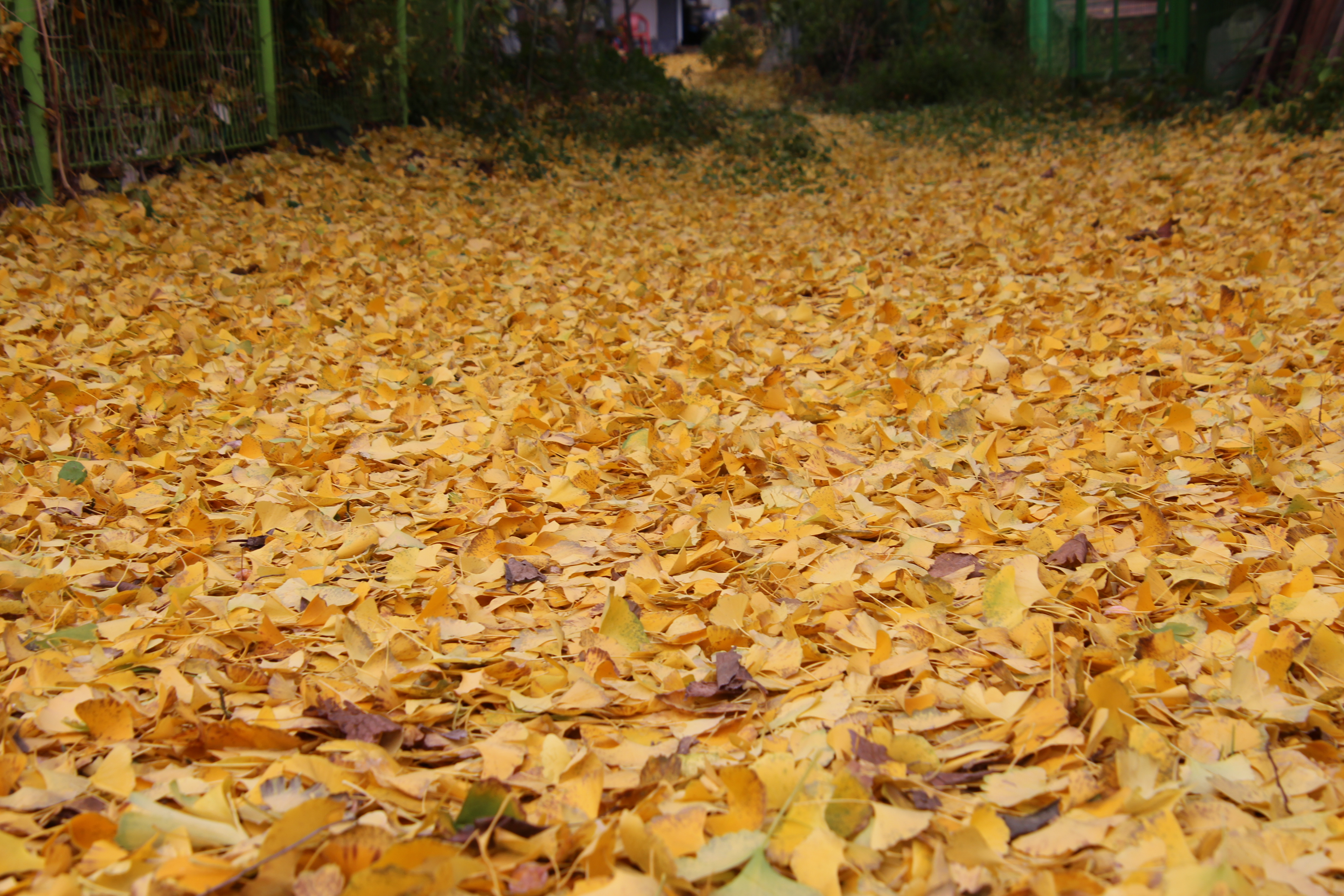 2023.11.03/ #도시기록 #안양 #은행나무/ 병목안시민공원 앞 하천 (수암천) 건너편 폐업한 한증막 뒷편 샛길. 은행나무에서 떨어진 은행잎이 쌓이며 노란 카페트가 깔린듯하다.