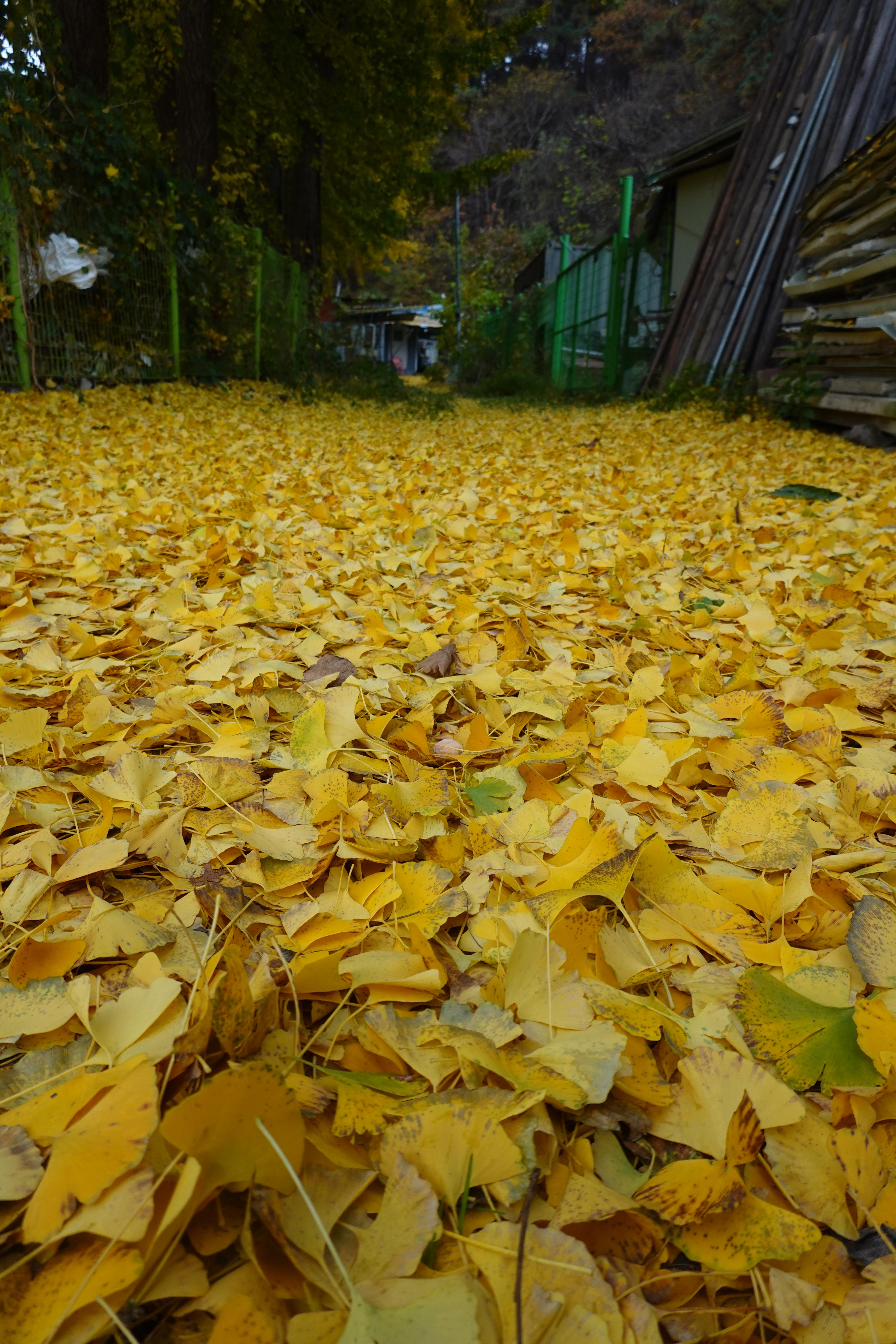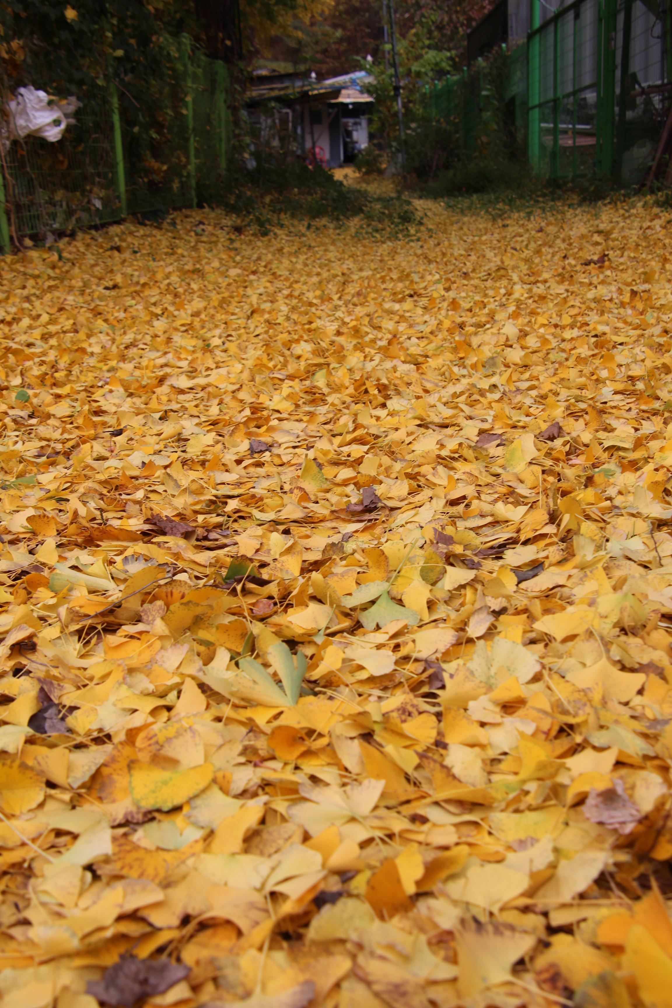 2023.11.03/ #도시기록 #안양 #은행나무/ 병목안시민공원 앞 하천 (수암천) 건너편 폐업한 한증막 뒷편 샛길. 은행나무에서 떨어진 은행잎이 쌓이며 노란 카페트가 깔린듯하다.