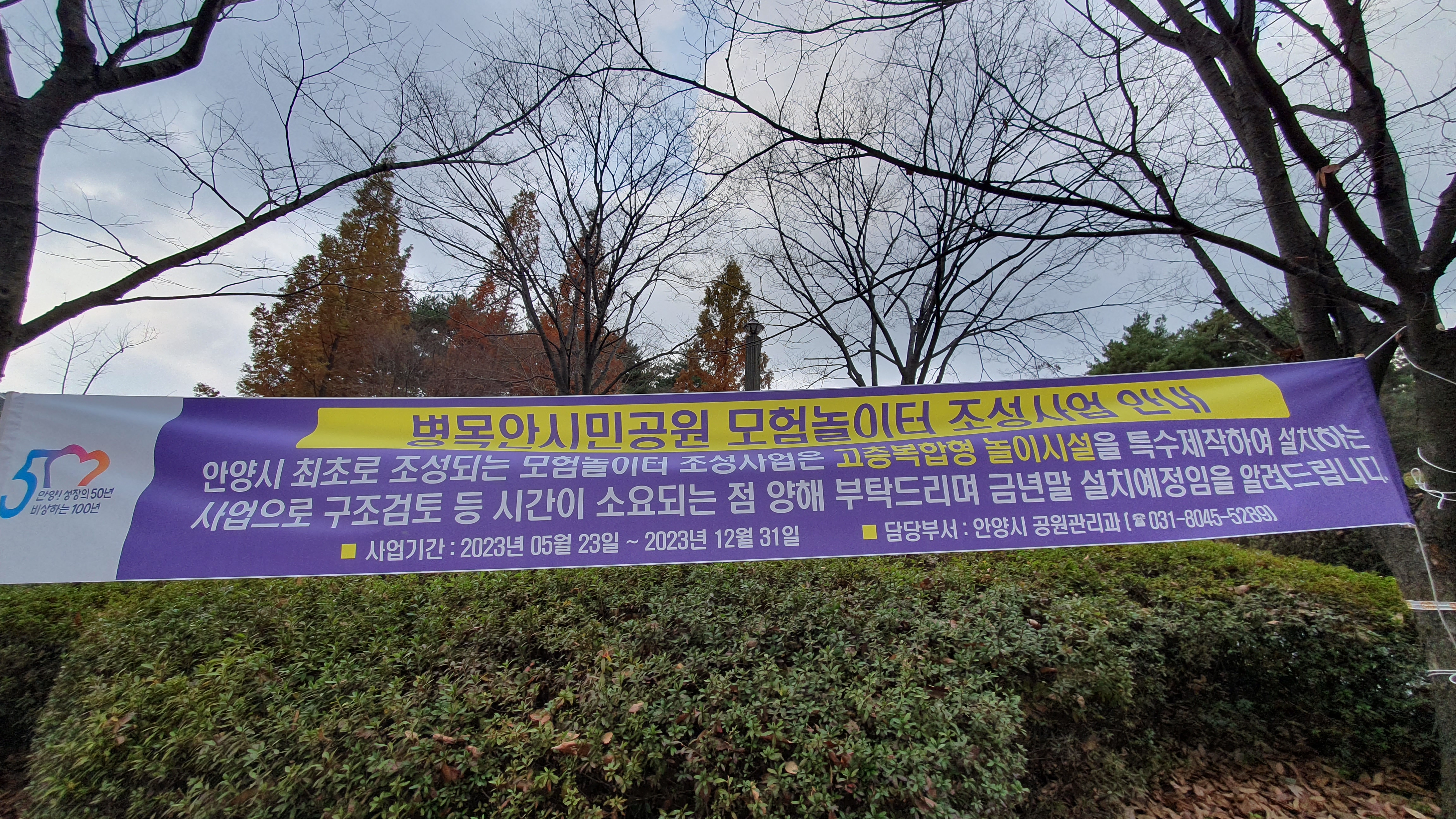 2023.11.03/ #도시기록 #안양 #병목안시민공원 #모험놀이터/ 안양9동 병목안시민공원에 마련될 어린이 모험 놀이터 구축공사 현장. 안양시는 지난 10월까지 공원 조성계획 결정 및 실시설계를 진행하고, 내년 1월 공사에 착공해 6월에 관련 시설을 완공한다는 계획이다.
