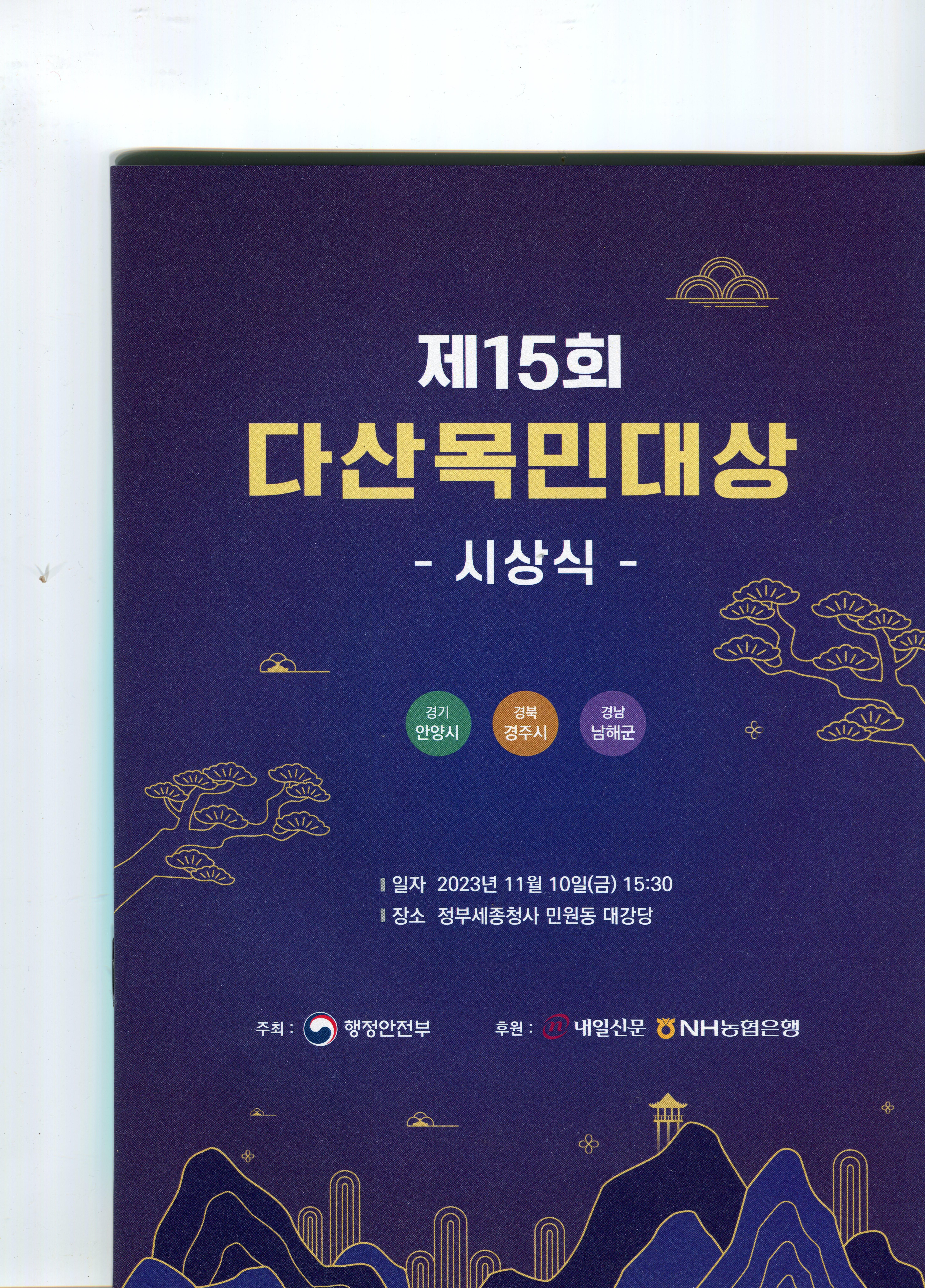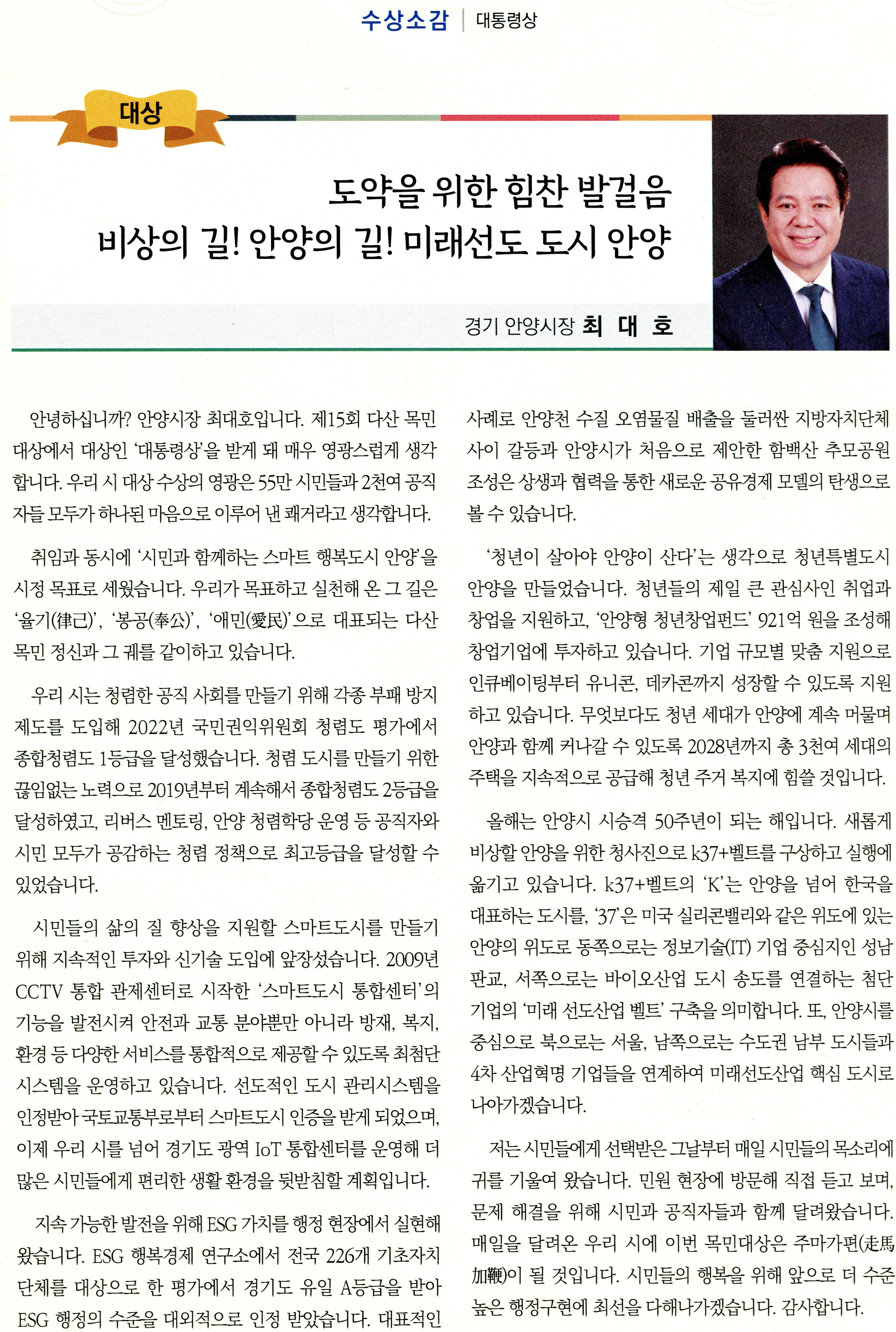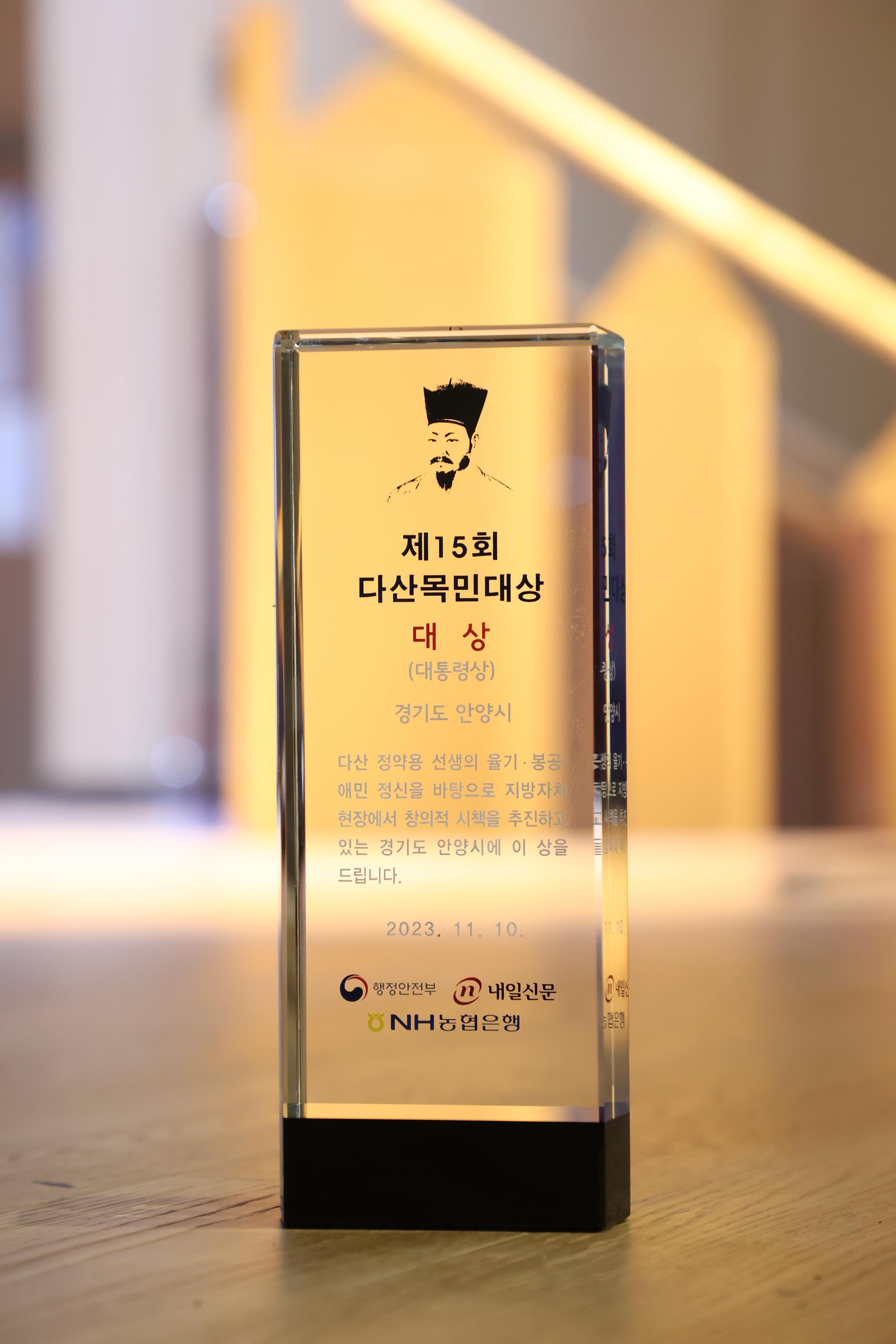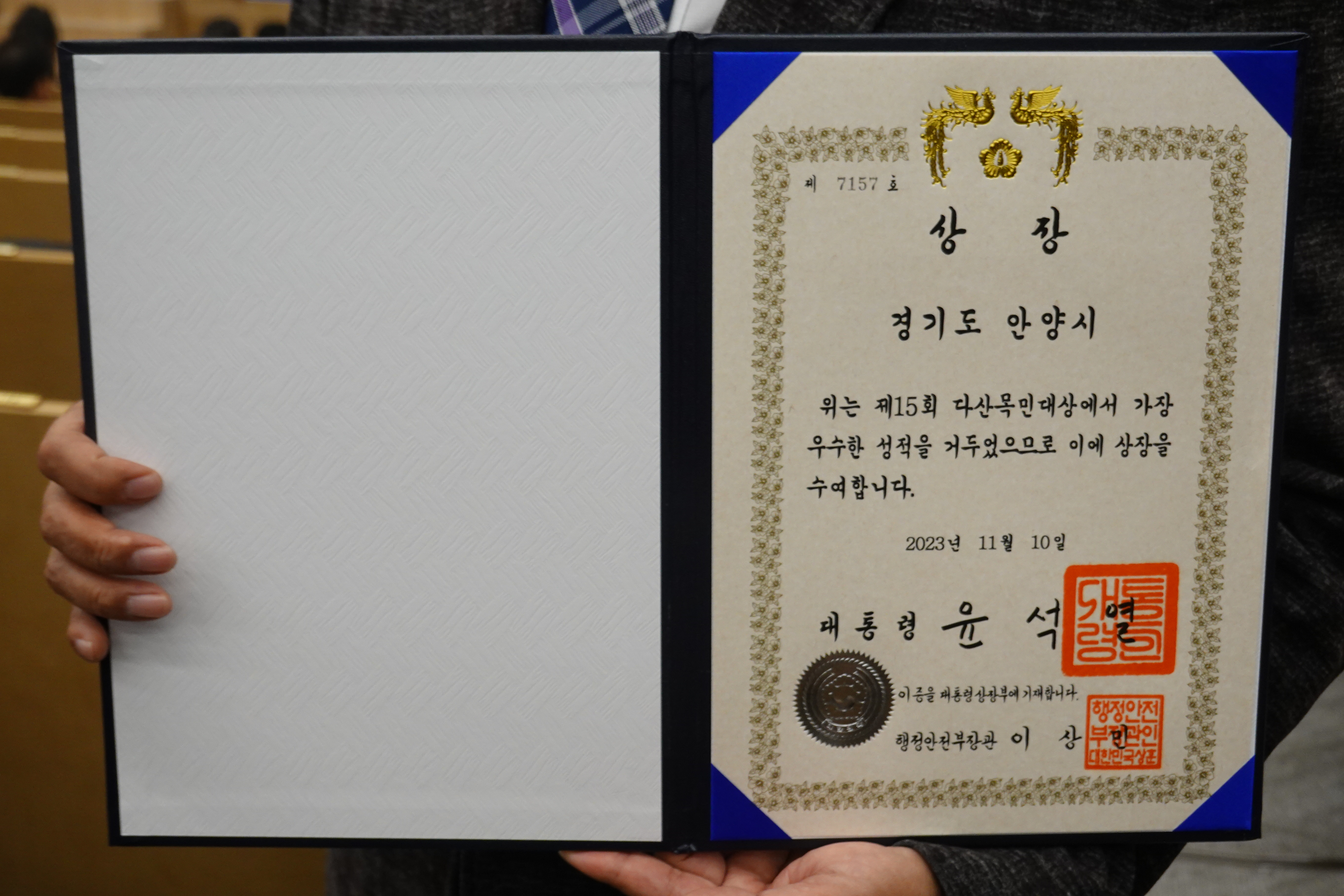 안양가 ‘제15회 다산목민대상’에서 대상(대통령상)을 받았다. 시는 행정안전부 주최로 지난 10일 오후 정부세종청사에서 열린 시상식에서 대상을 수상하고, 특별교부세 1억5000만원과 상금 2000만원을 받게됐다.
